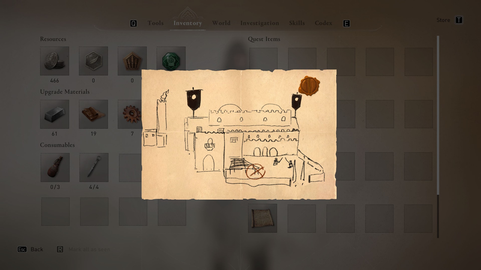 The guards are closing in, and I must write this quickly. I have obtained what I was seeking just as I said I would but I have run out of time! Avenge me and find what I risked my life for! Search the soap boilers ... and from the heights, look for the colorful fabrics! Remember me for my courage and not my fate and I bid you good luck!
