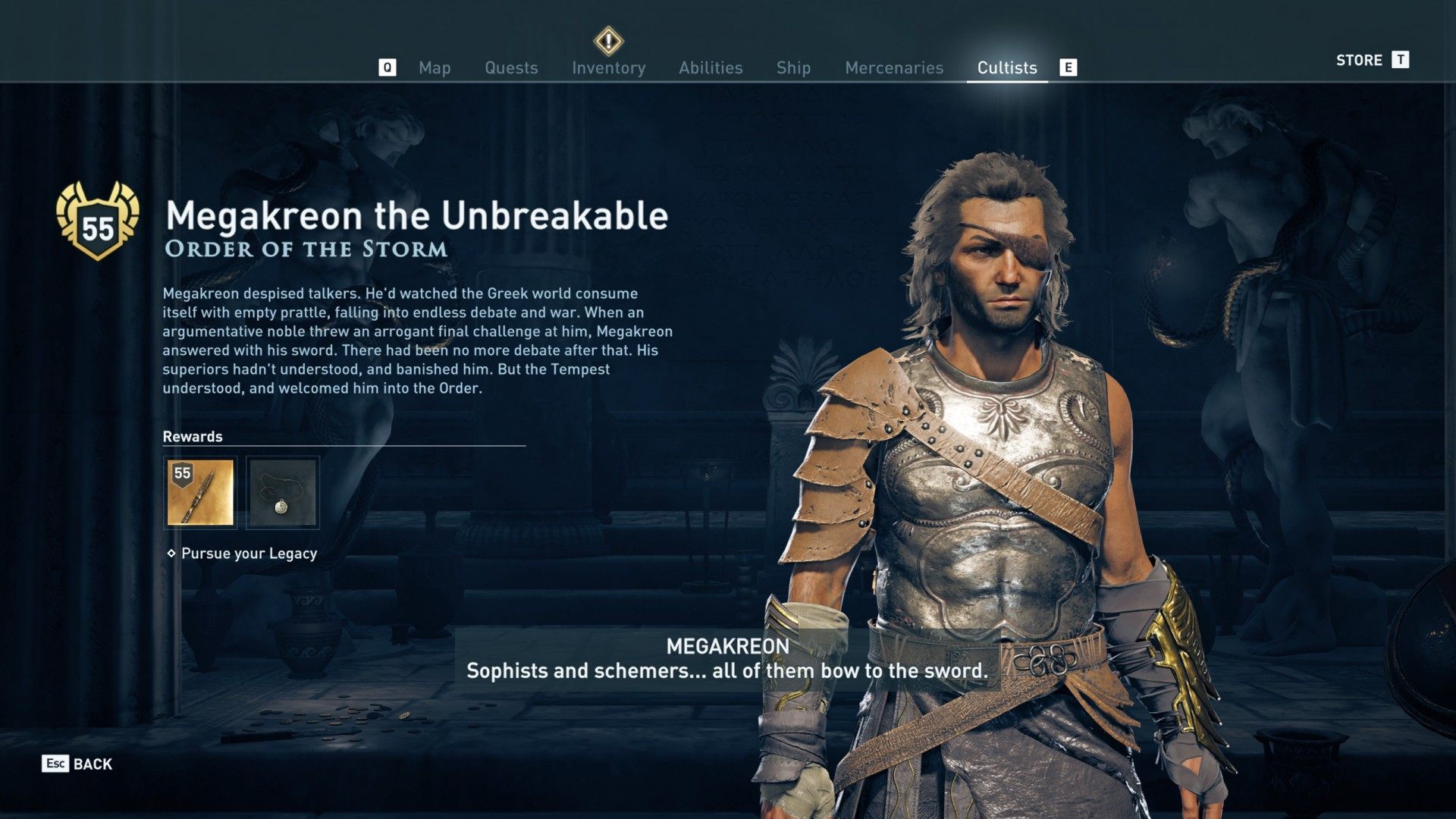Rewards: Epic XP, Legendary Drachmae, Mega Leg Plates of the Brawn (Epic Legs). For killing Megakreon the Unbreakable you will receive Armor-Piercing Spear of the Unbreakable (Legendary Spear), Orders to the Unbreakable (Ancient Clue) and Image of the Ancients (Quest Item).