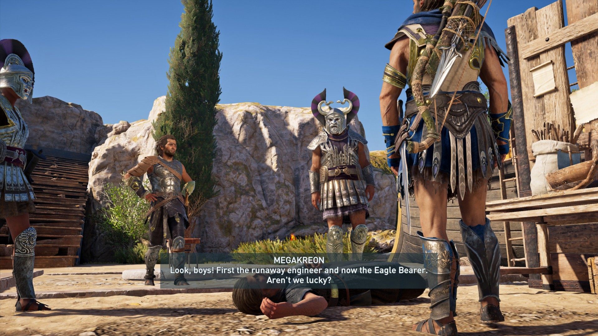 Return to the amphitheatre. Unfortunately, the engineer is dead. Megakreon and his henchmen will appear and try to kill you.