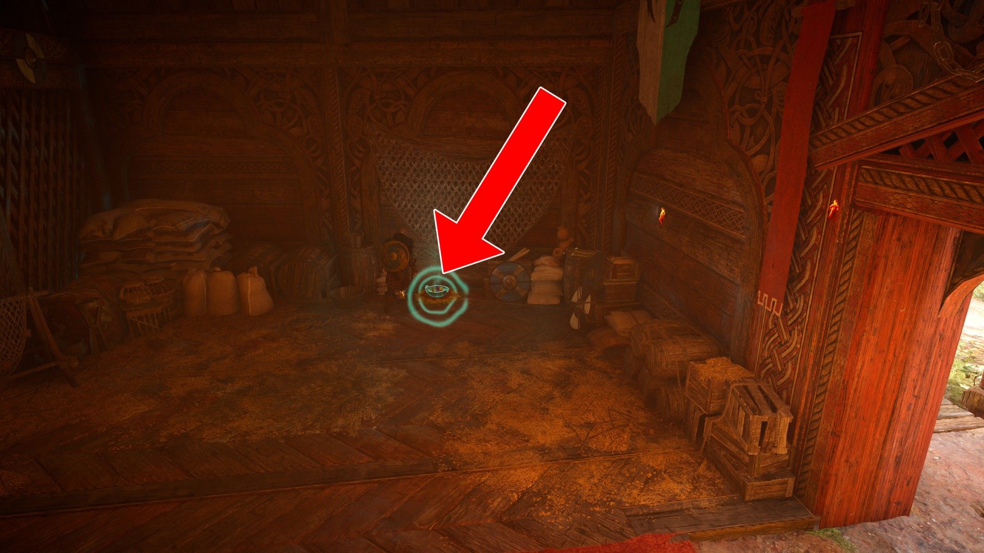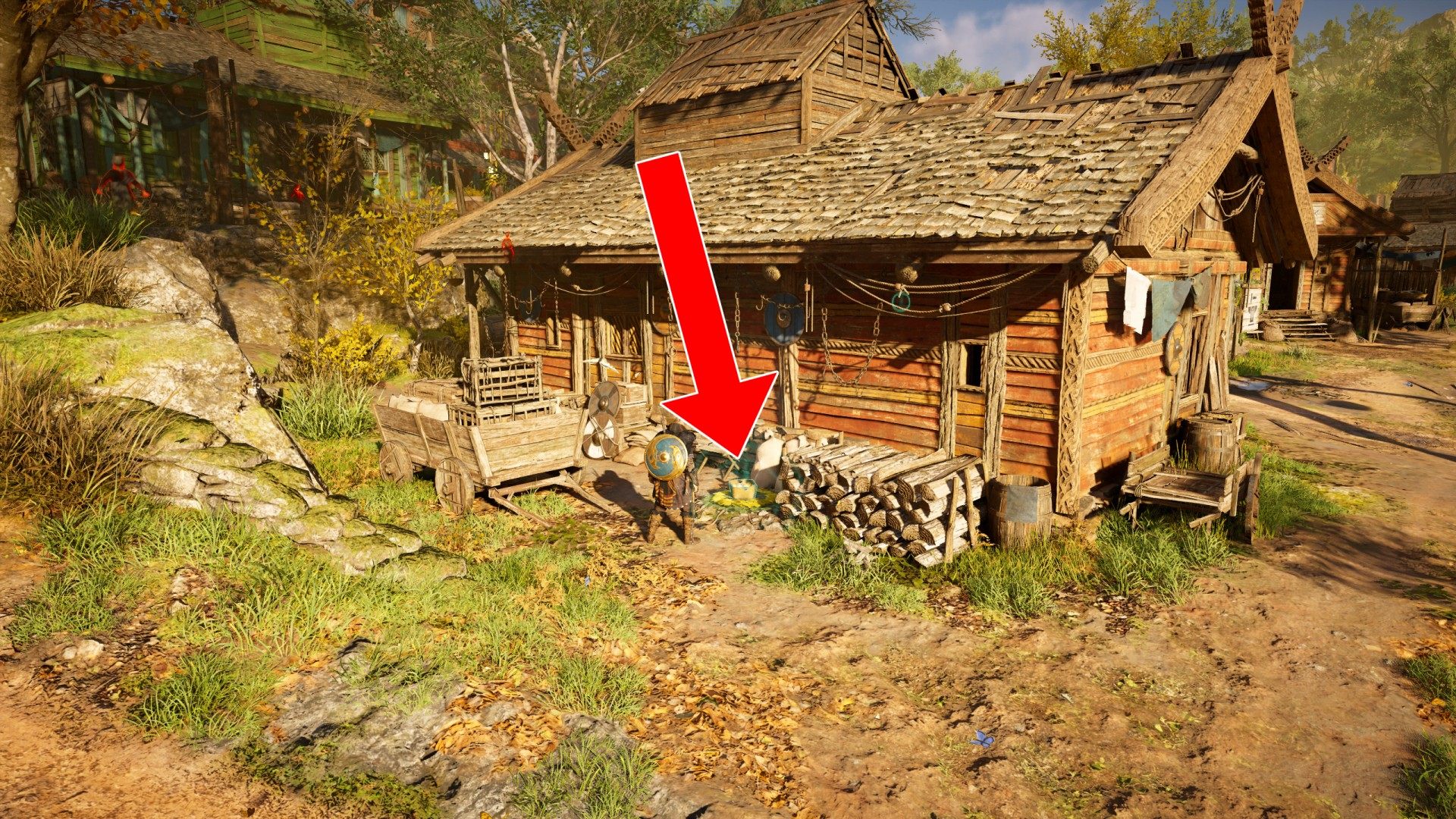 13. Near the trunk of a big tree that grows between the longhouse and Valka's hut.