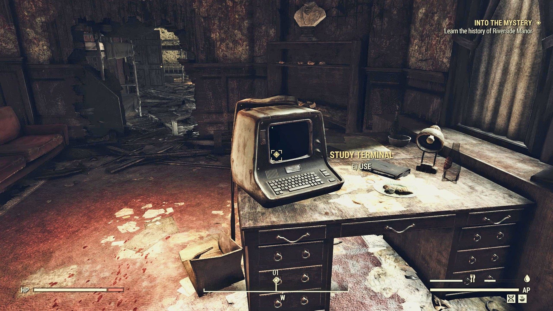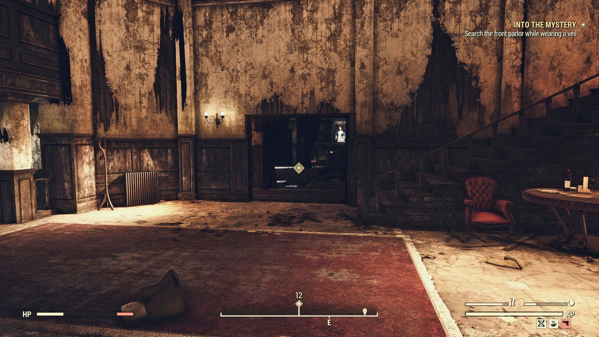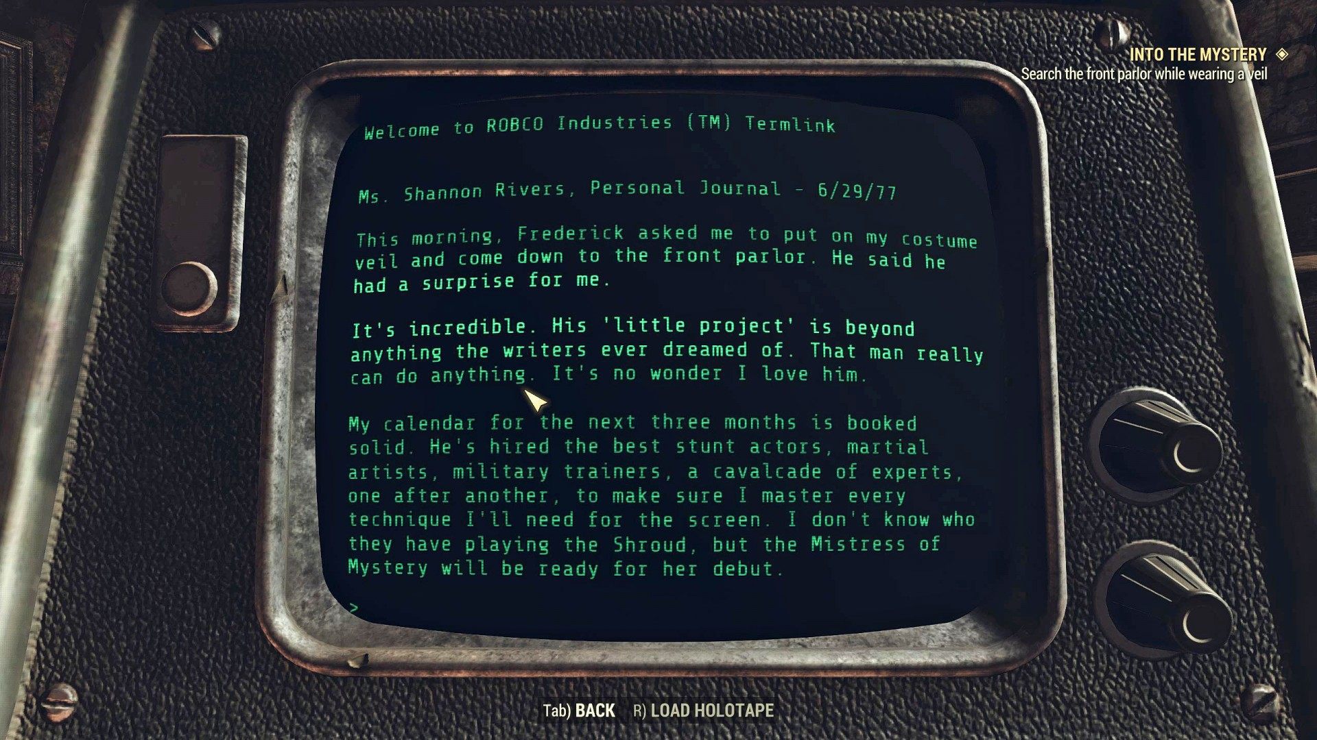 I found the body of a young woman with a strange outfit. Her damaged holotape led me to Riverside Manor, where a journal mentioned the owner of the house wearing her costume veil to the manor's front parlor. Could the veil be the key to this mystery?