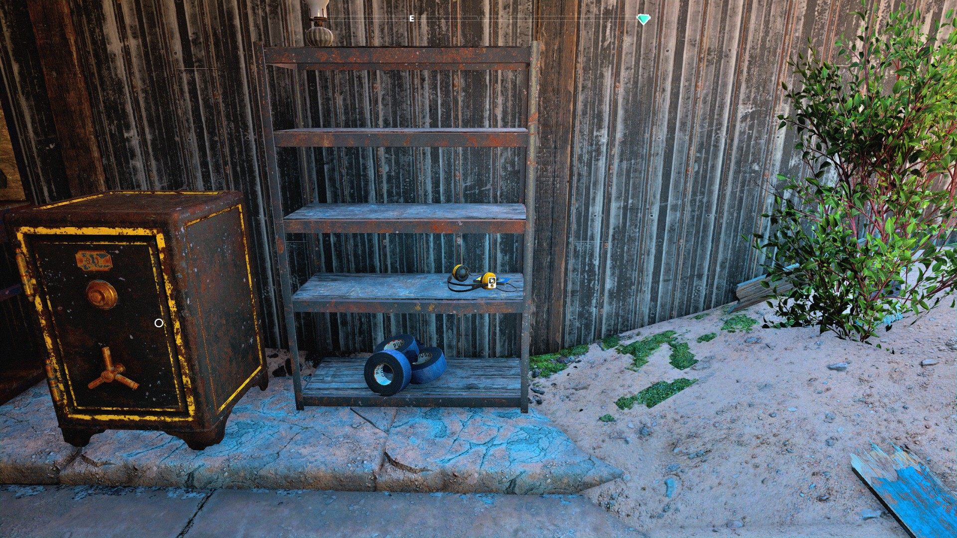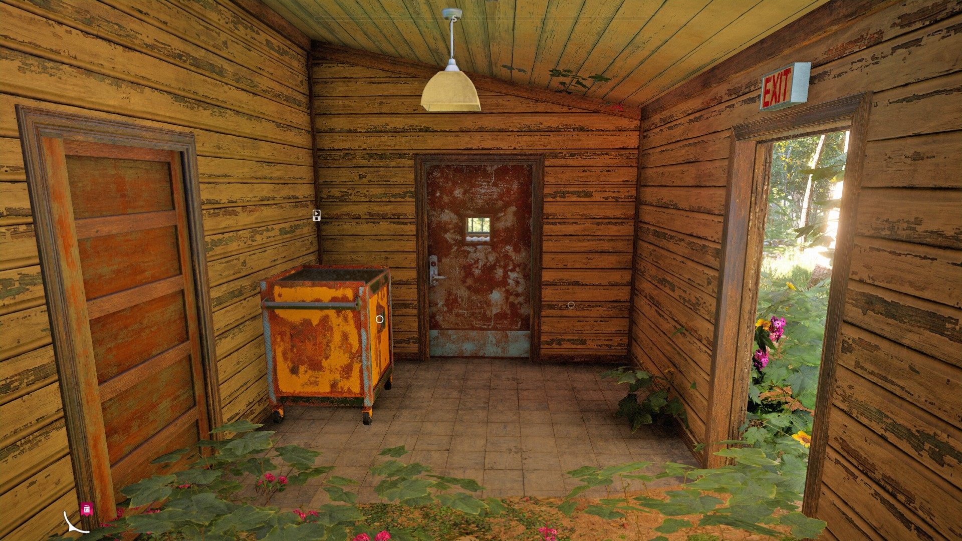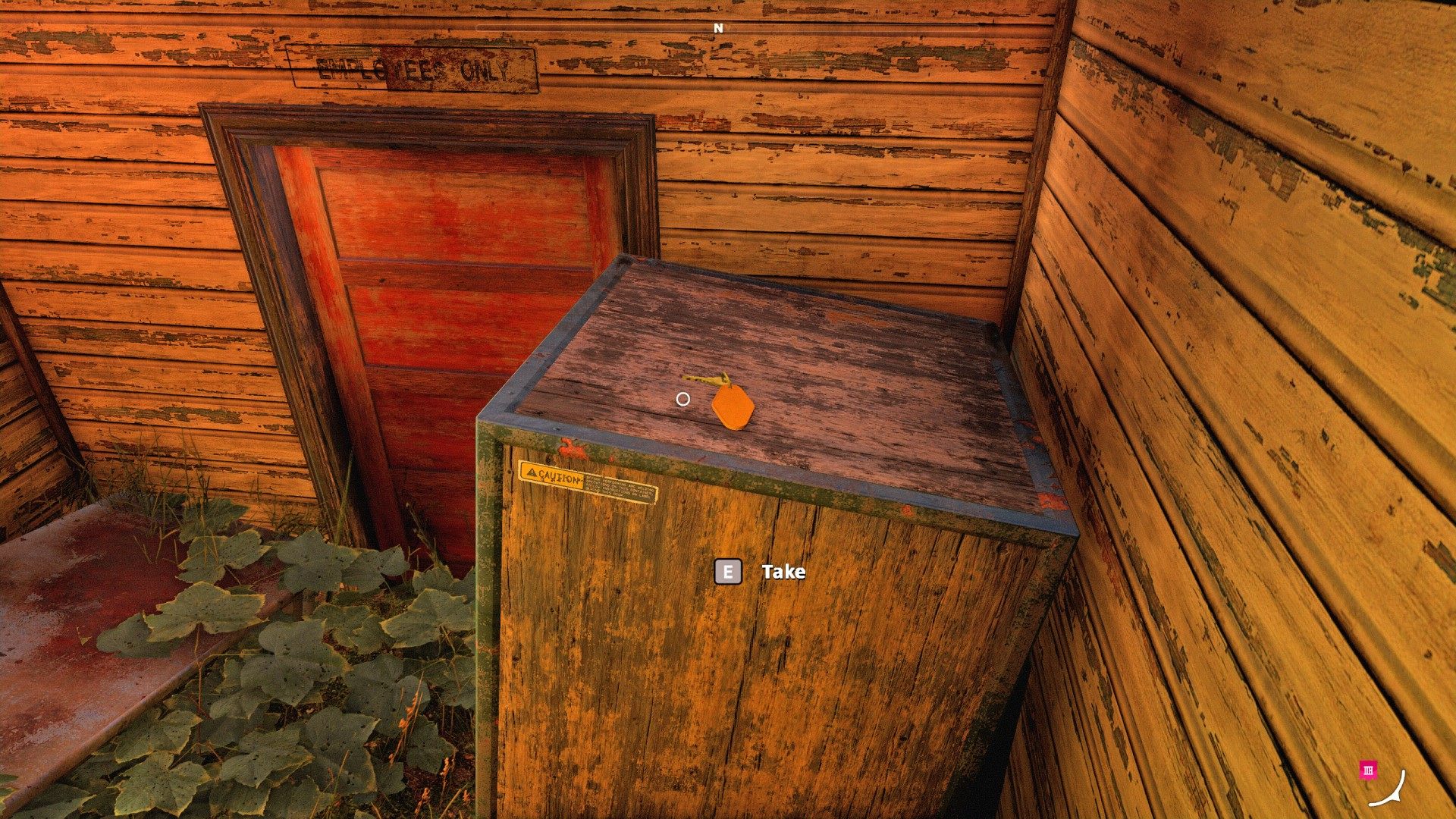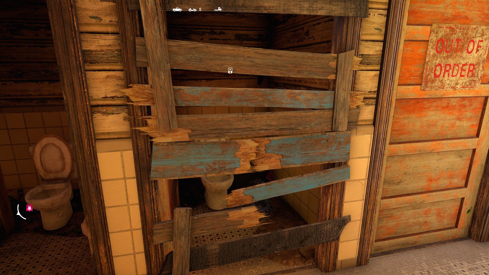 Enter the building, find the key that lies on a nearby, old vending machine, and use it to unlock the door to the bathroom.