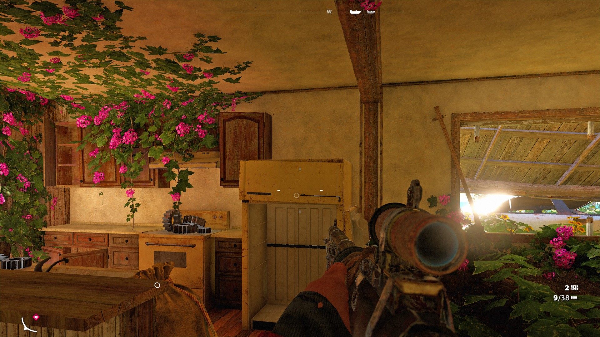 Enter the building, shoot off the door of an old fridge and take the key from inside.