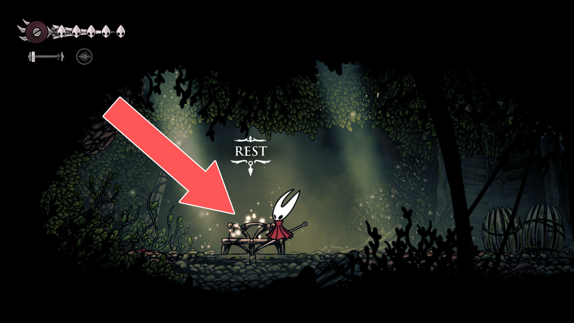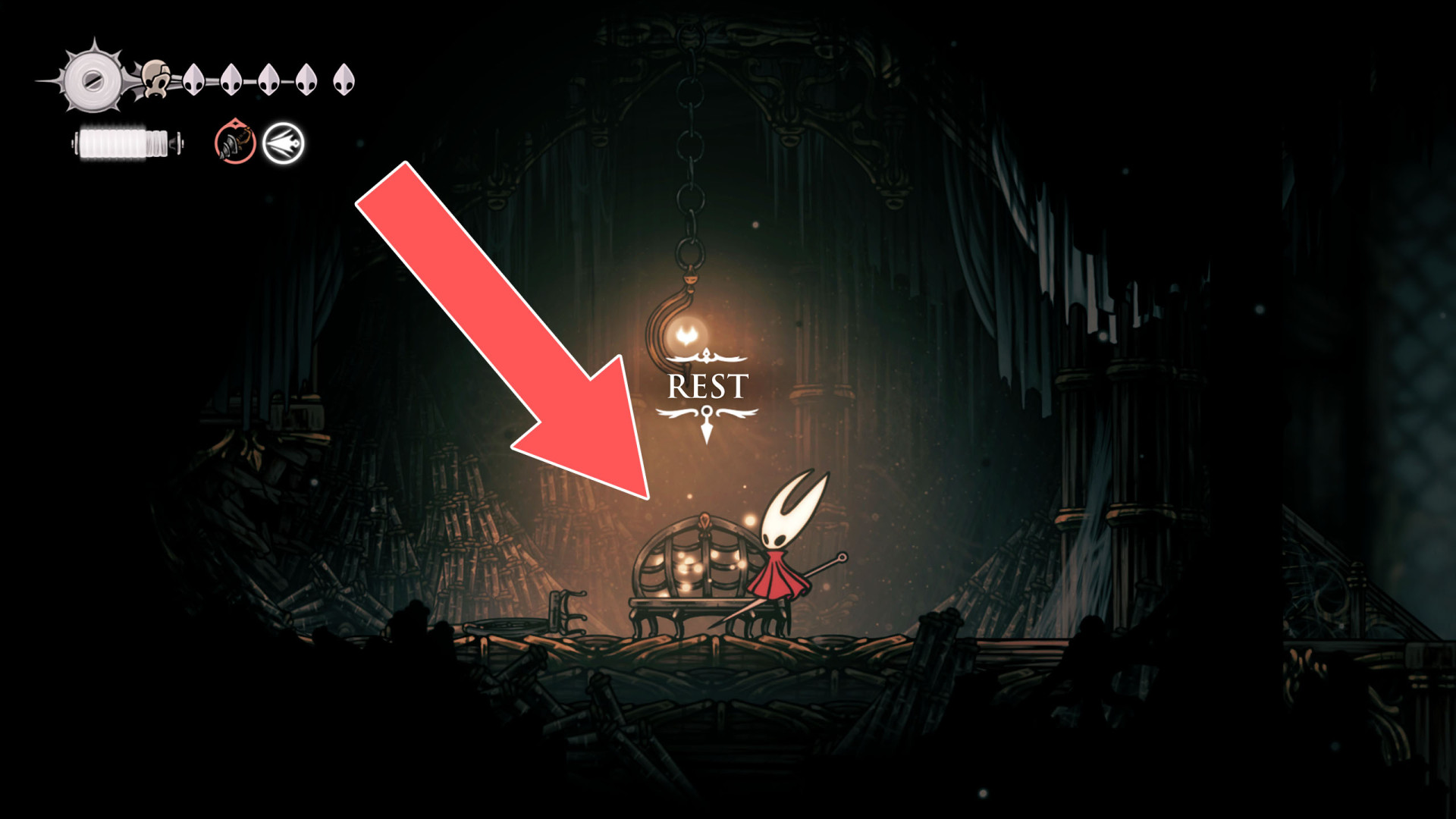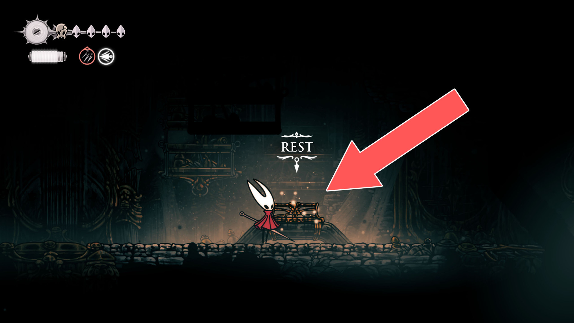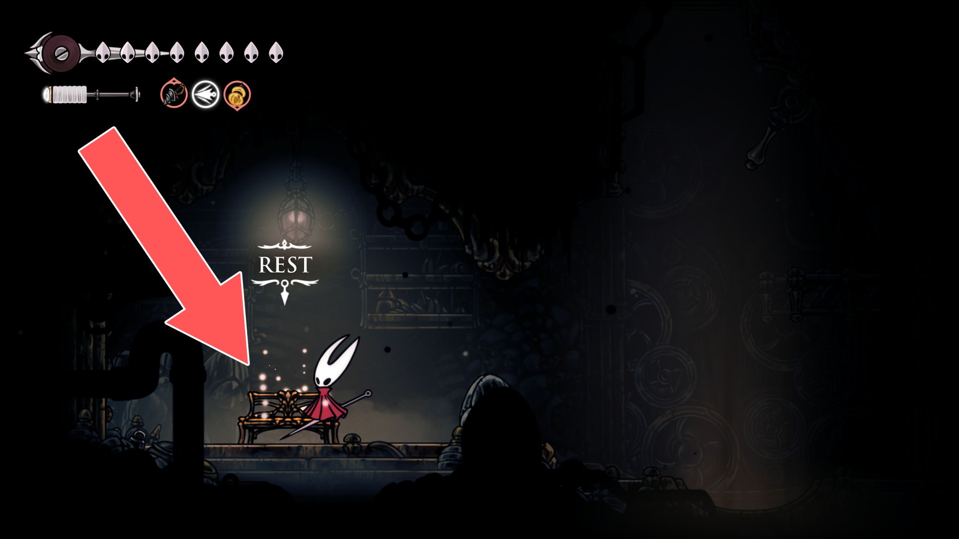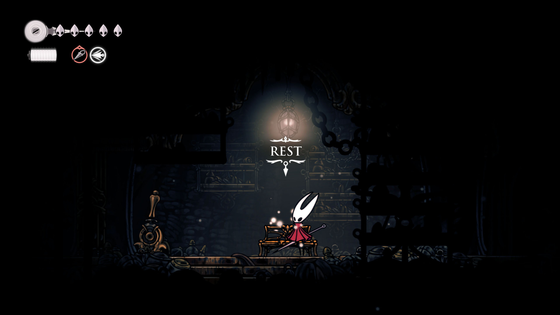 In Hollow Knight: Silksong, benches are checkpoints where Hornet can rest, fully restore health, refill equipped Tools with Shell Shards, and swap Tools or Crests. They serve as spawn points after death or quitting, with some requiring Rosary tolls to access.