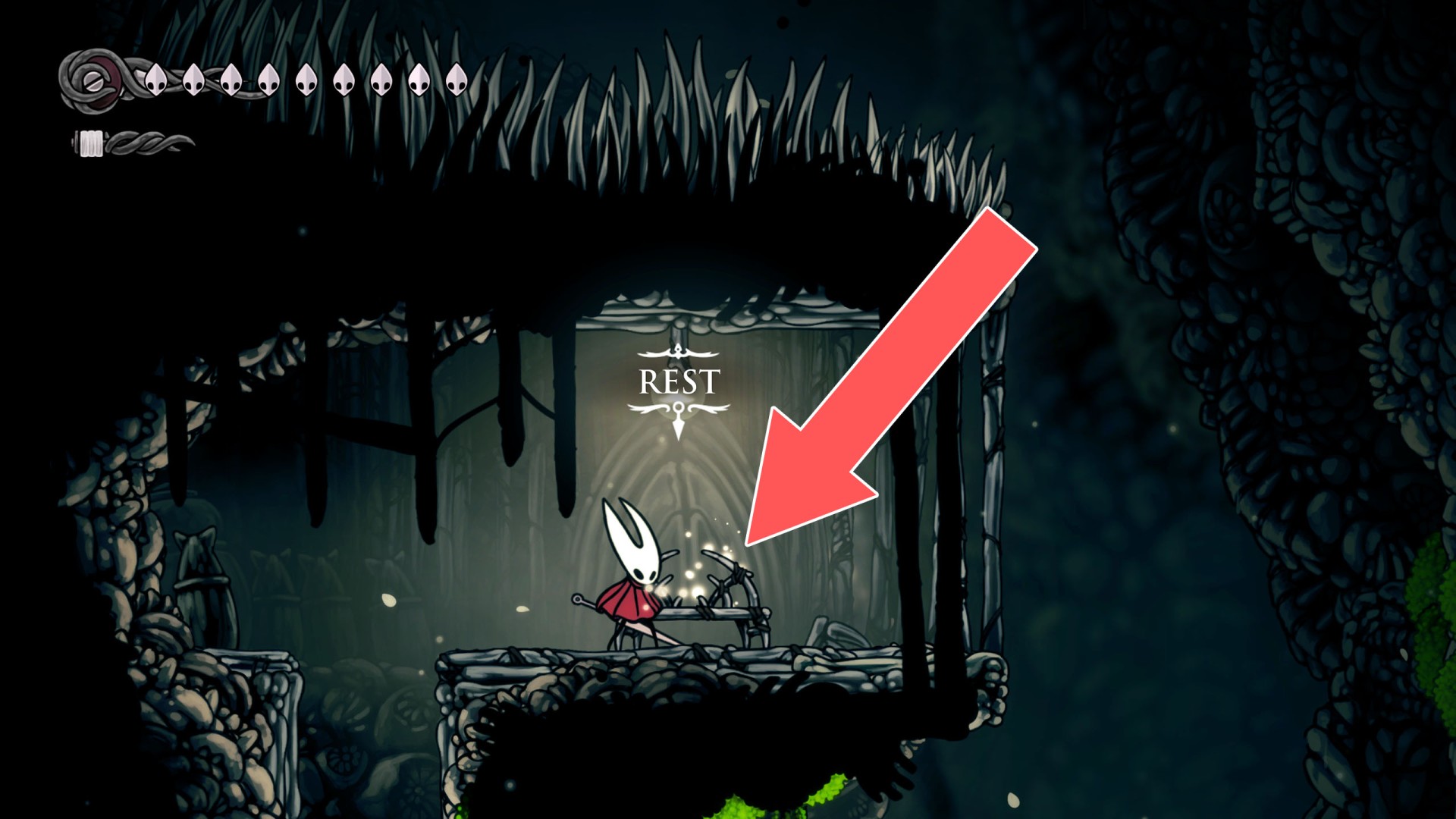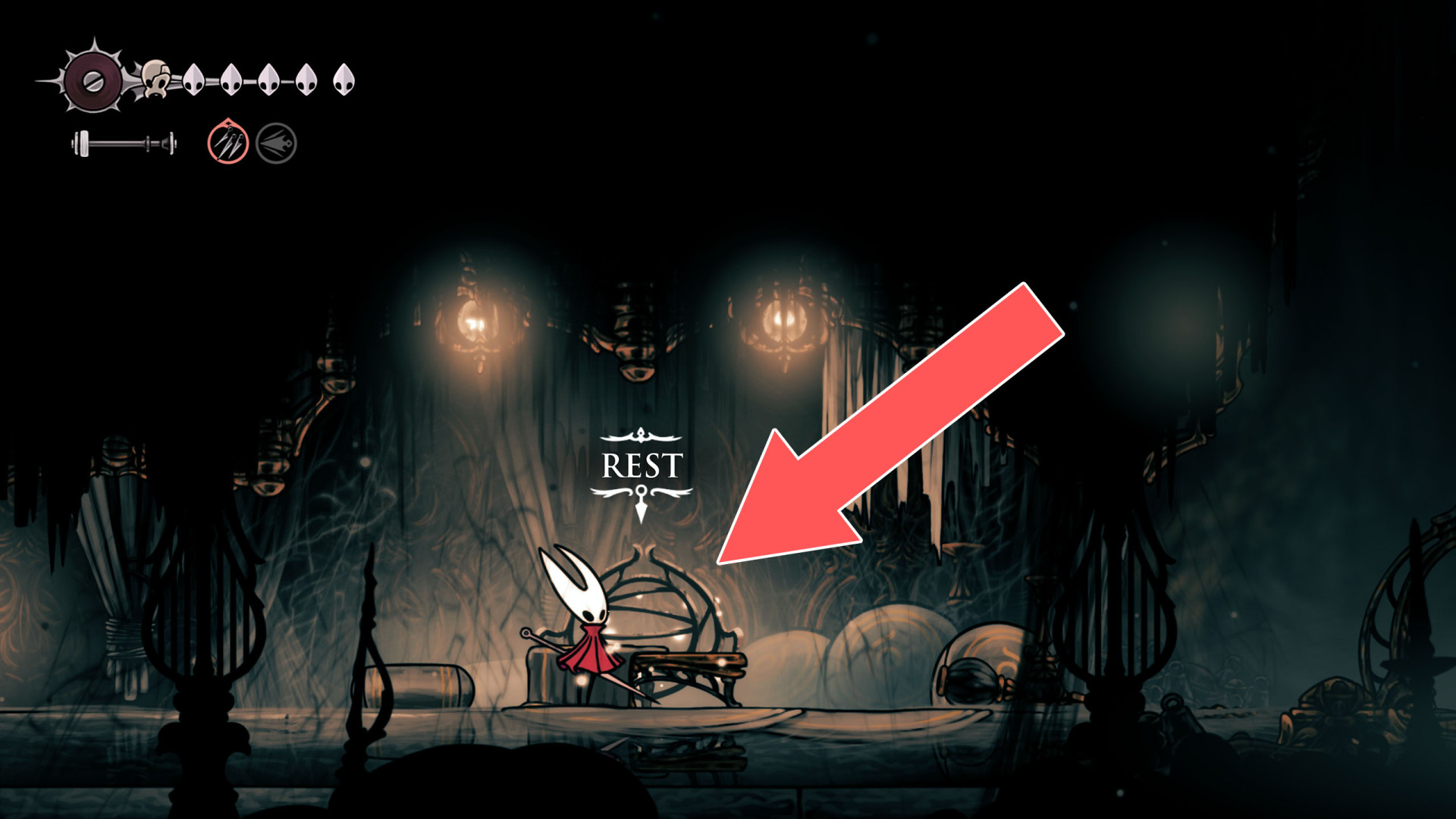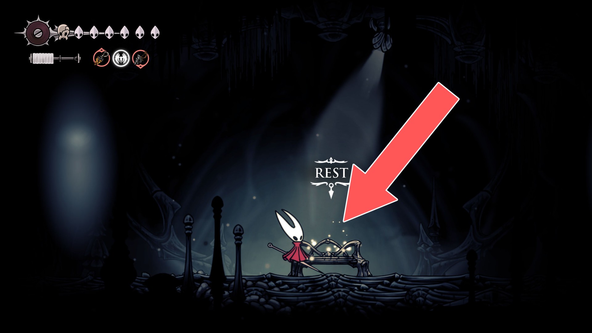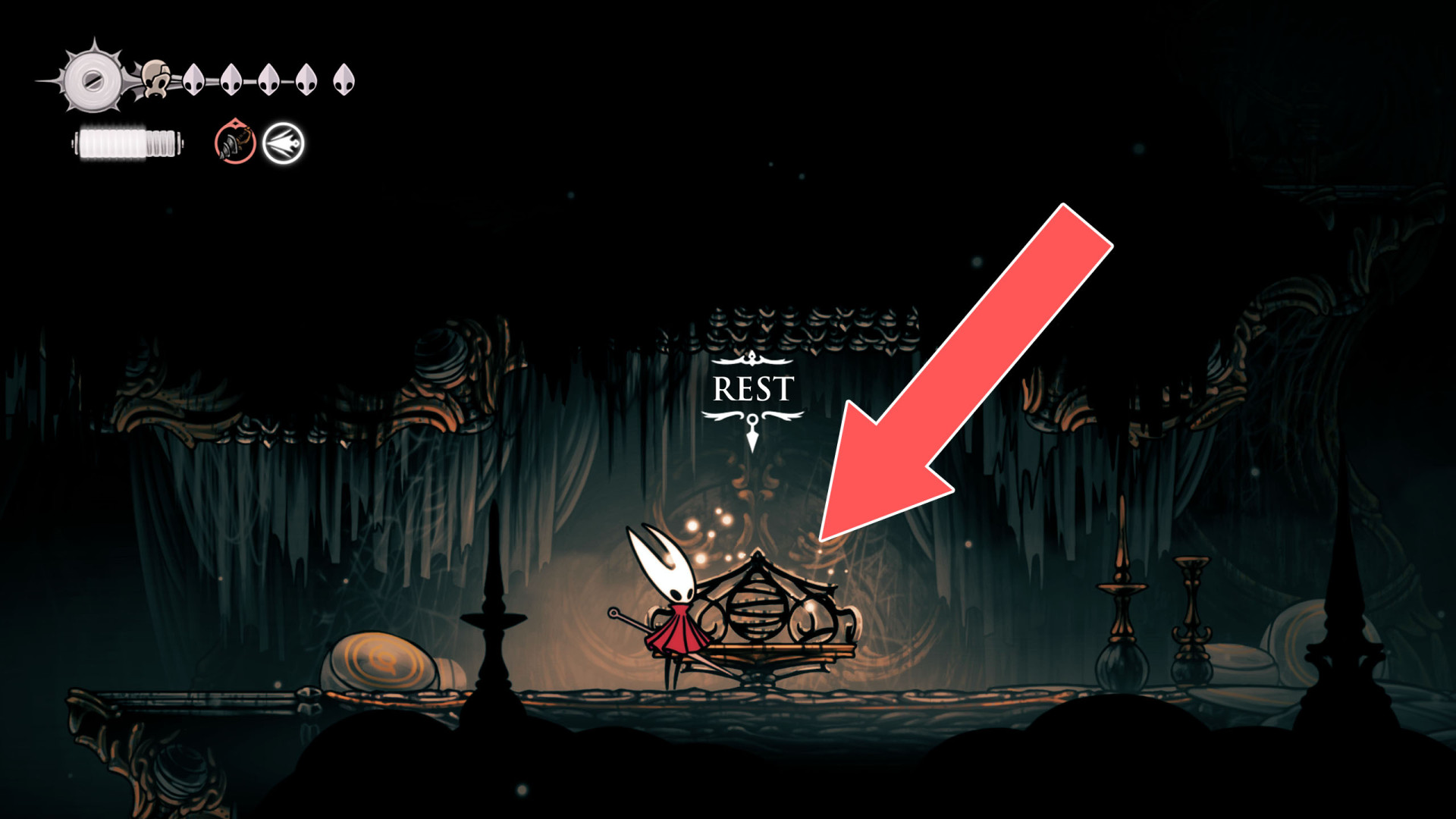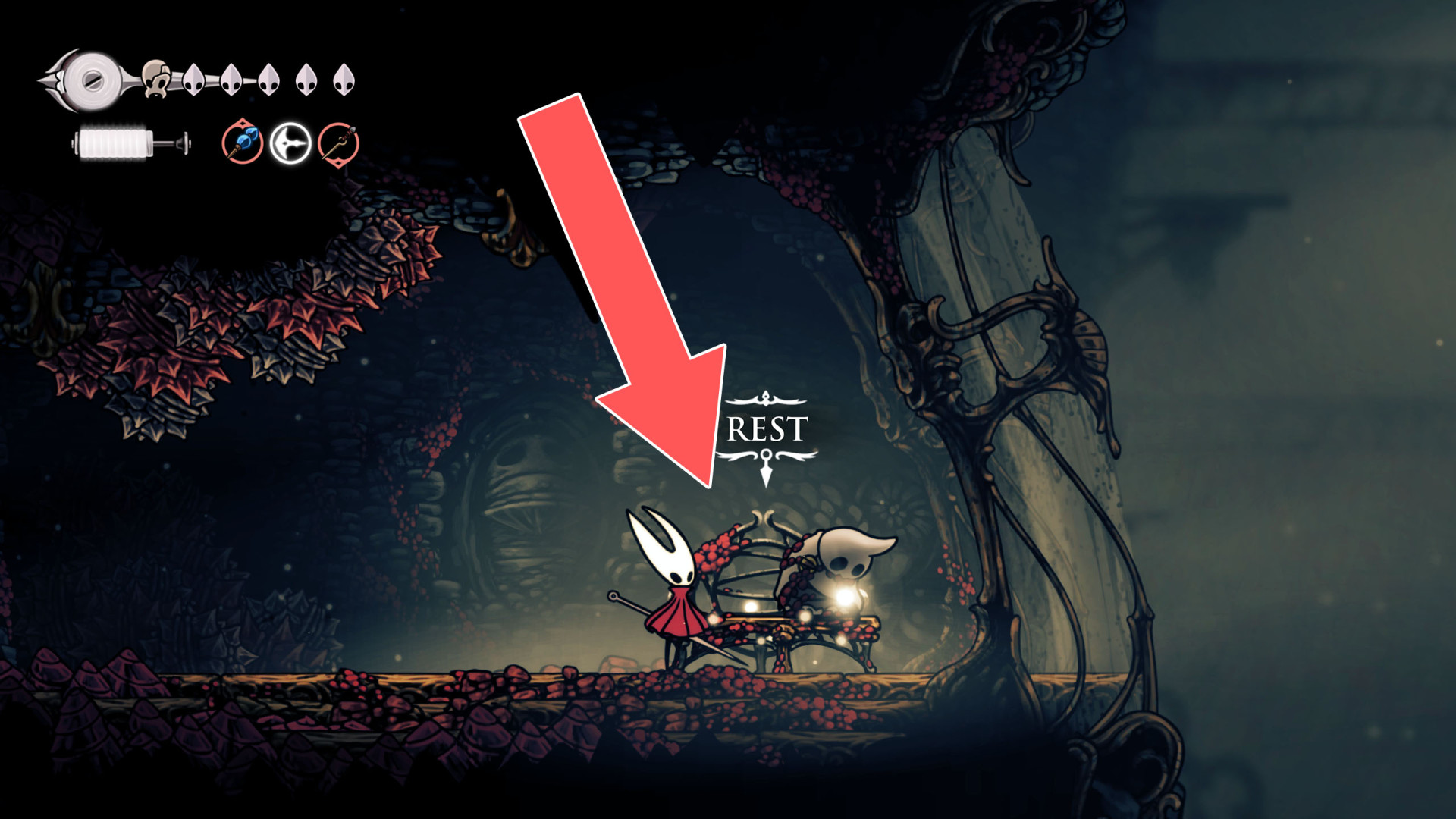 In Hollow Knight: Silksong, benches are checkpoints where Hornet can rest, fully restore health, refill equipped Tools with Shell Shards, and swap Tools or Crests. They serve as spawn points after death or quitting, with some requiring Rosary tolls to access.