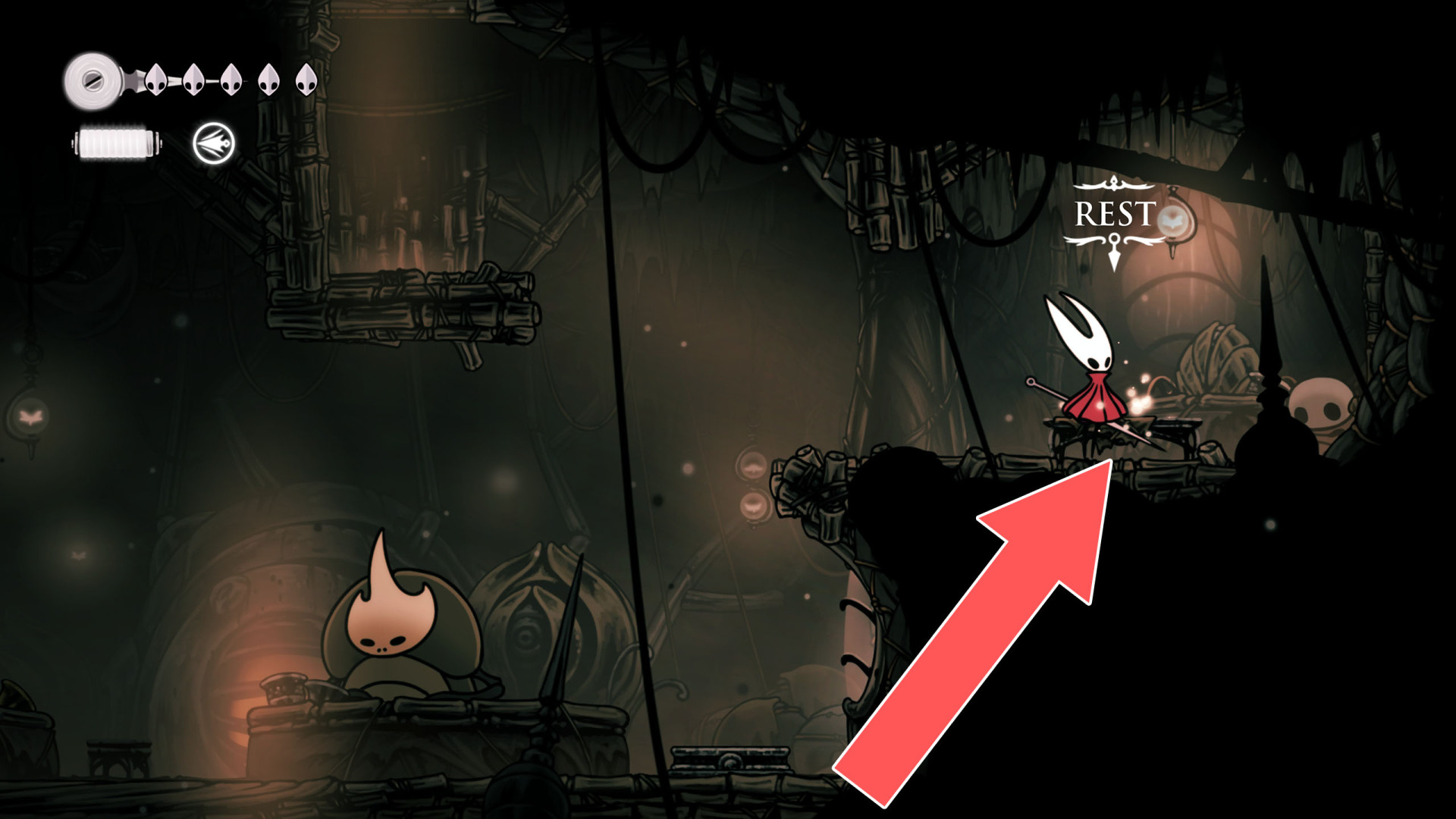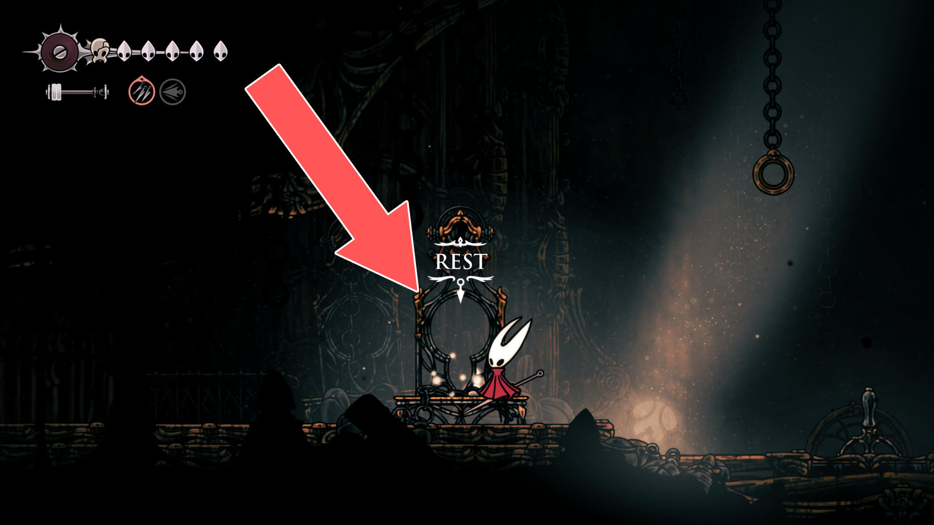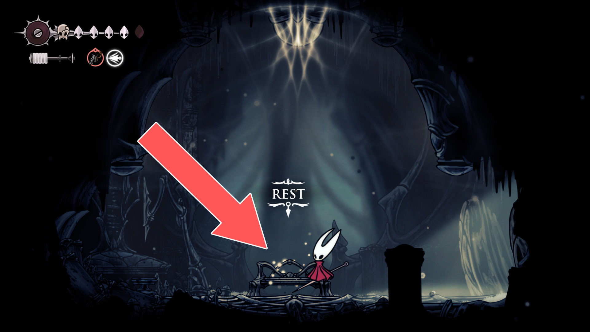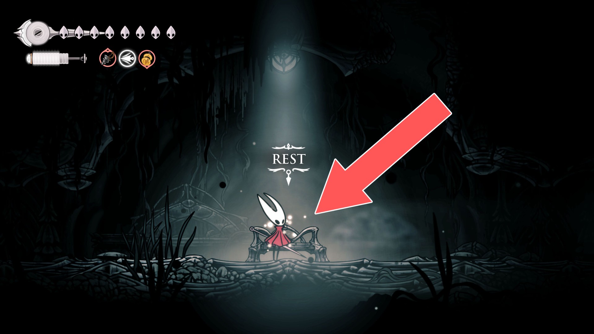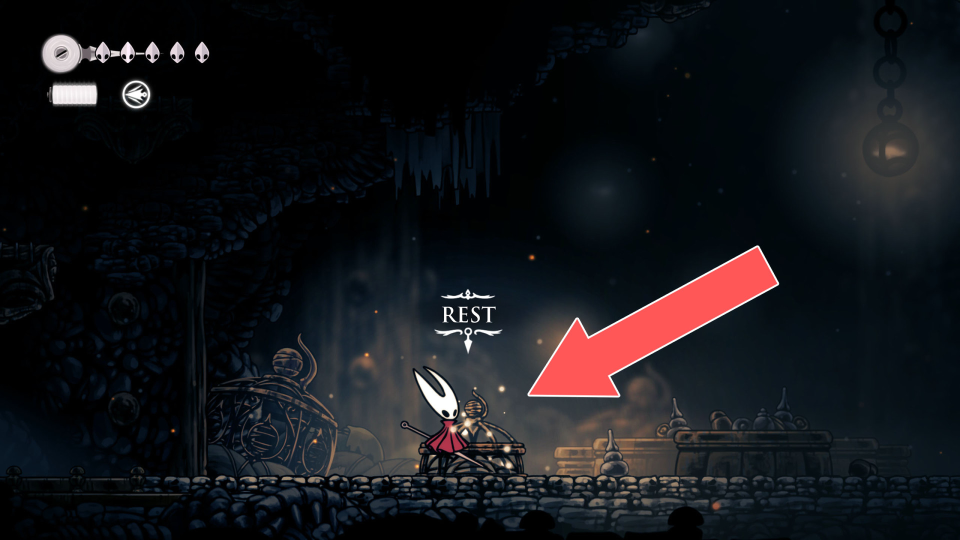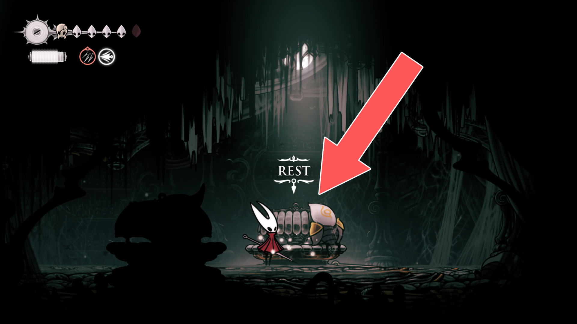 In Hollow Knight: Silksong, benches are checkpoints where Hornet can rest, fully restore health, refill equipped Tools with Shell Shards, and swap Tools or Crests. They serve as spawn points after death or quitting, with some requiring Rosary tolls to access.