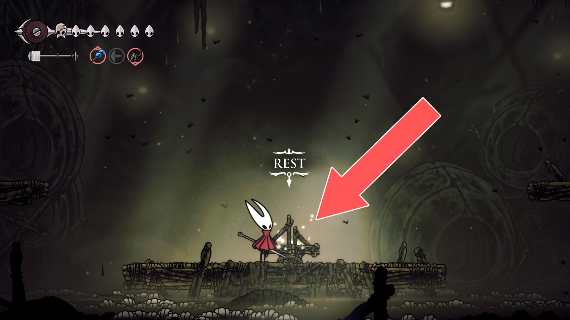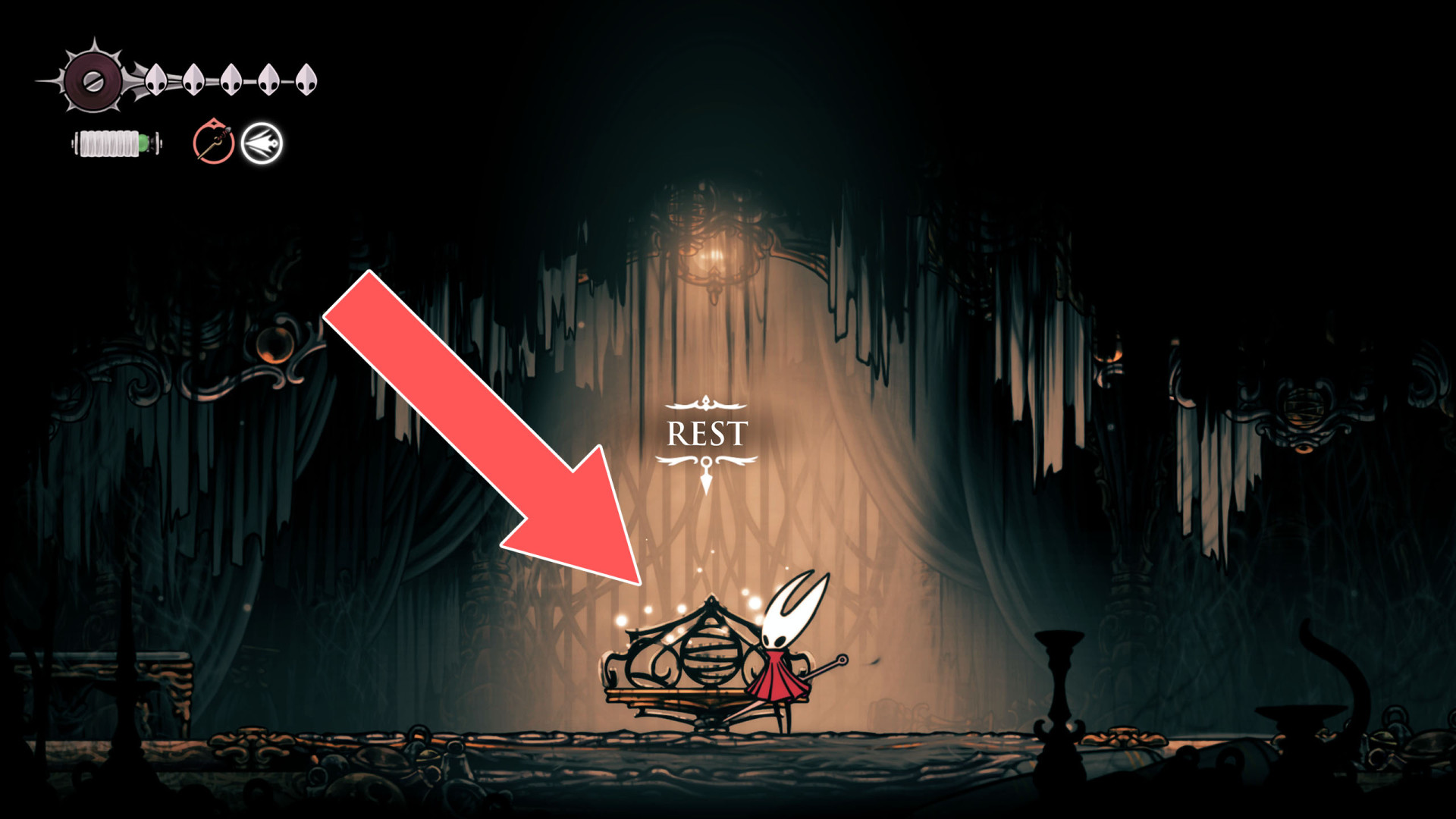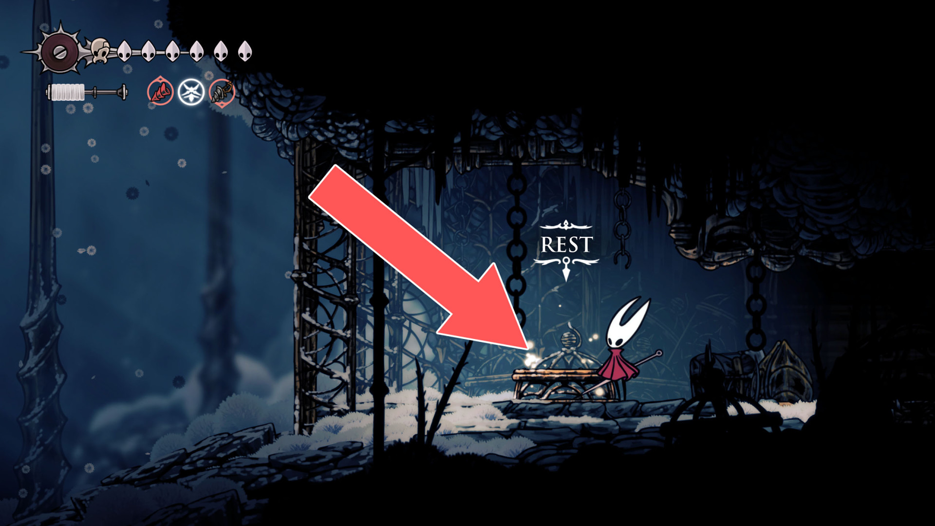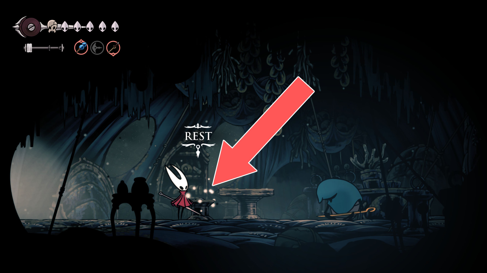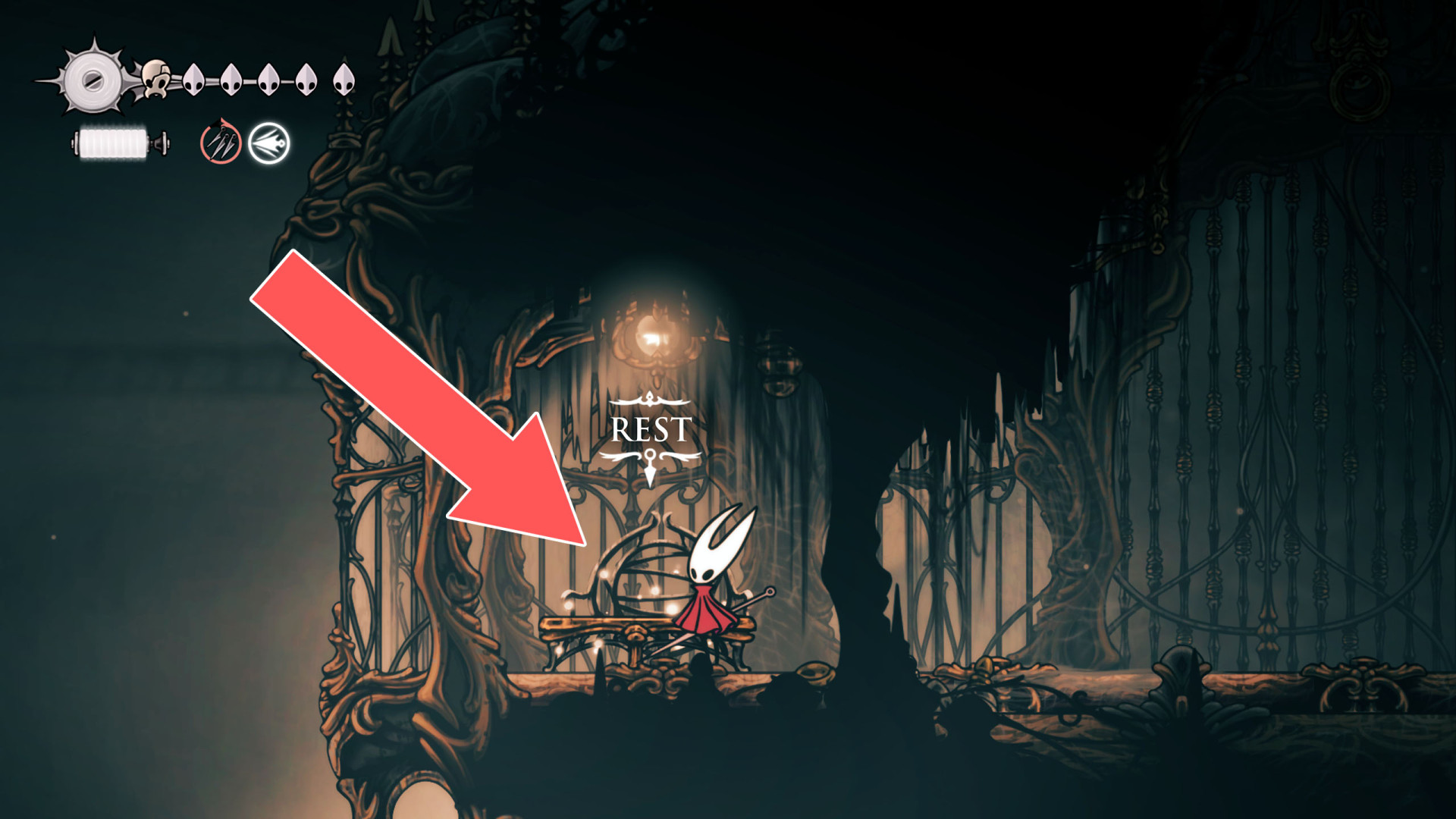 In Hollow Knight: Silksong, benches are checkpoints where Hornet can rest, fully restore health, refill equipped Tools with Shell Shards, and swap Tools or Crests. They serve as spawn points after death or quitting, with some requiring Rosary tolls to access.