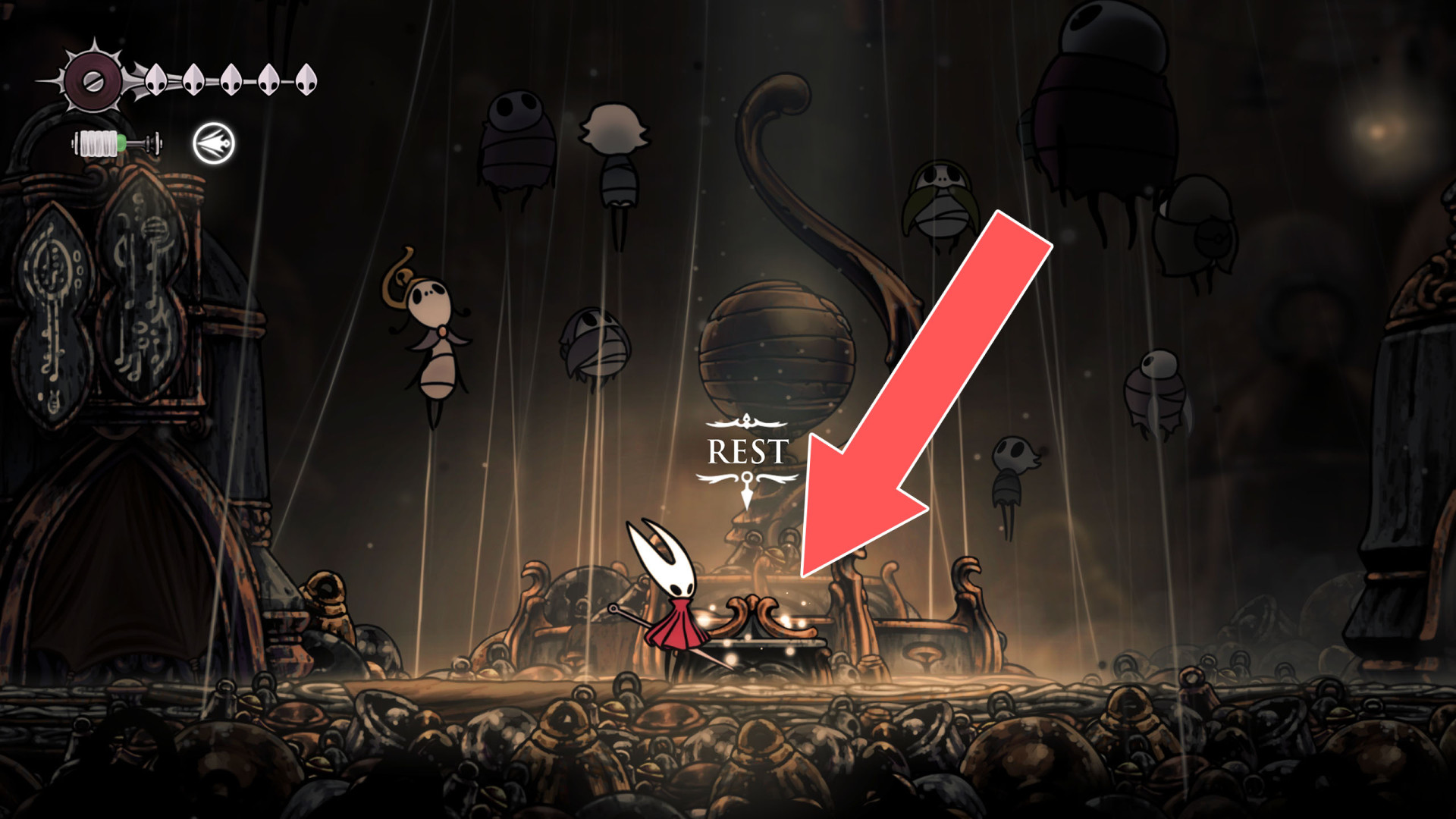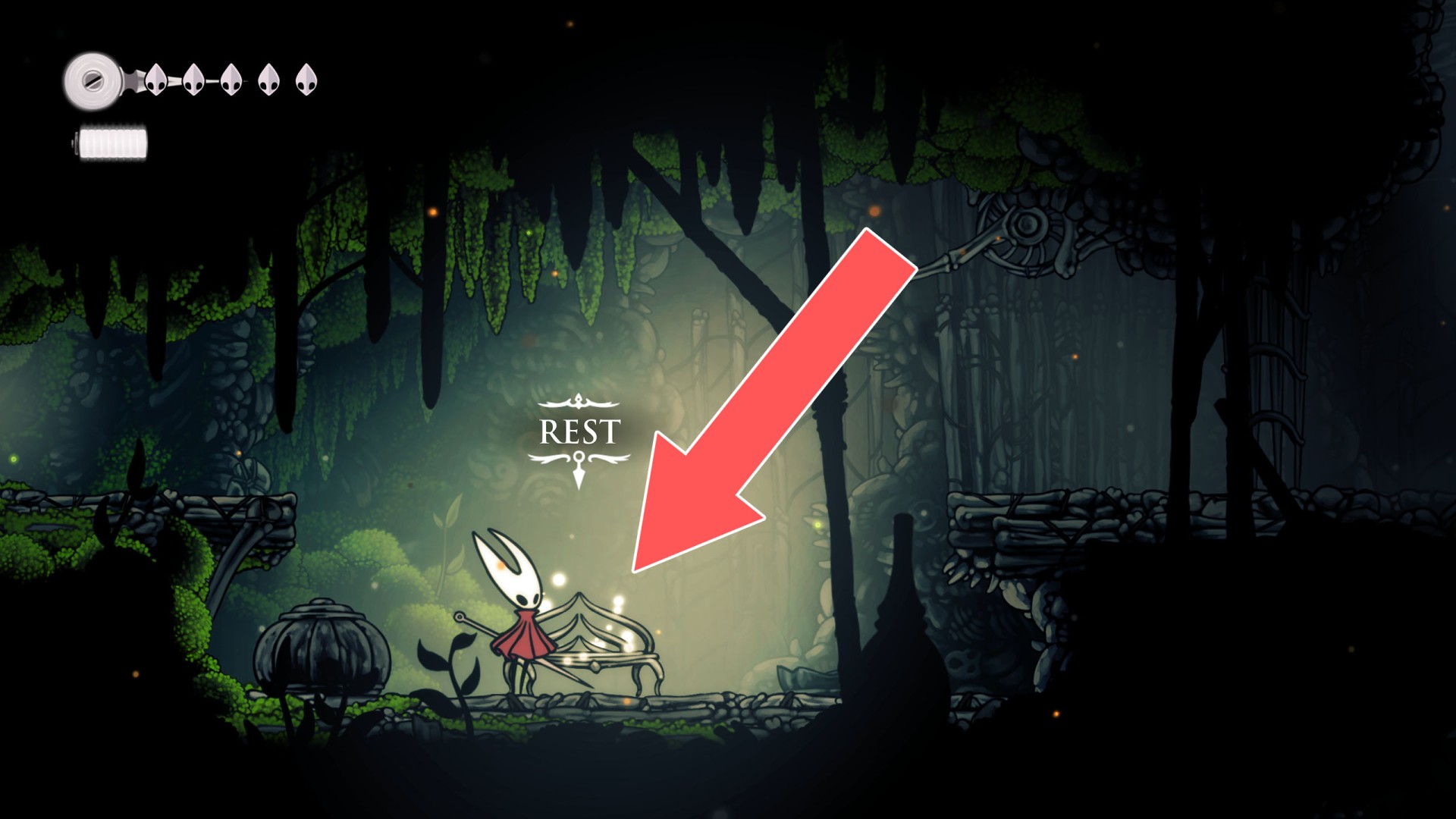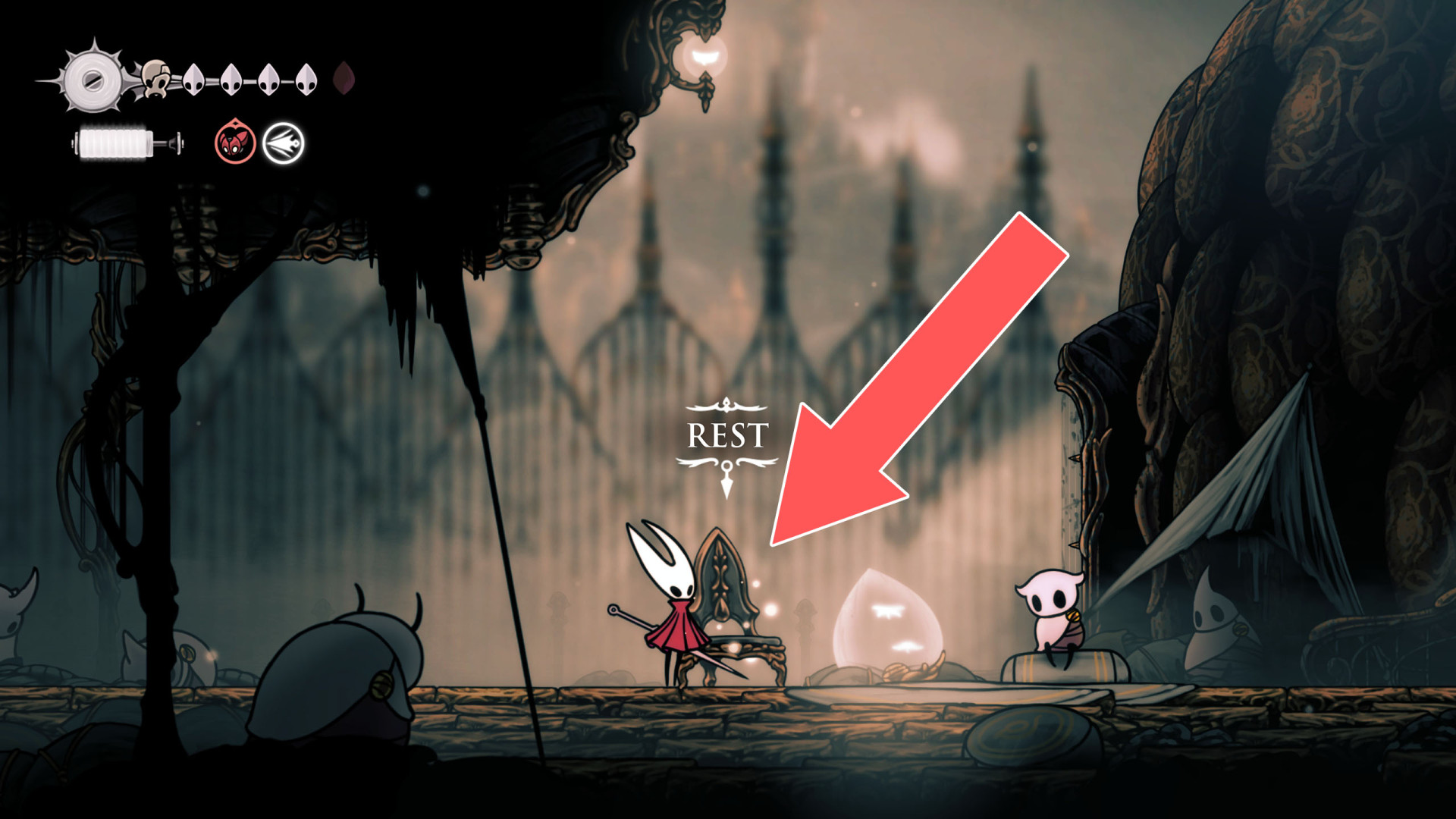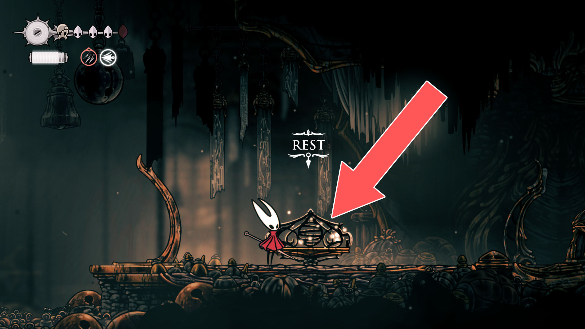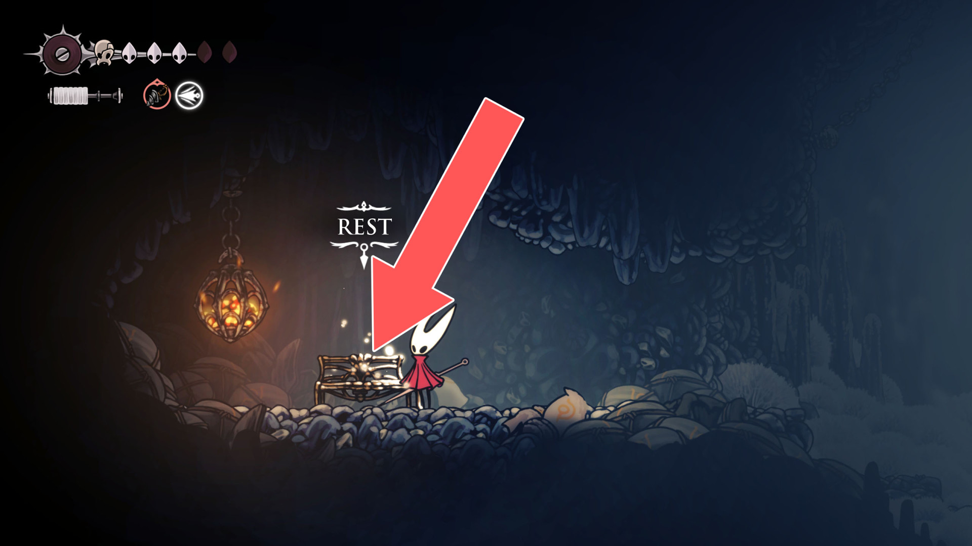 In Hollow Knight: Silksong, benches are checkpoints where Hornet can rest, fully restore health, refill equipped Tools with Shell Shards, and swap Tools or Crests. They serve as spawn points after death or quitting, with some requiring Rosary tolls to access.