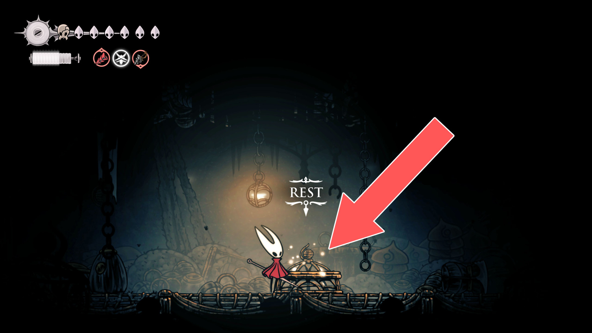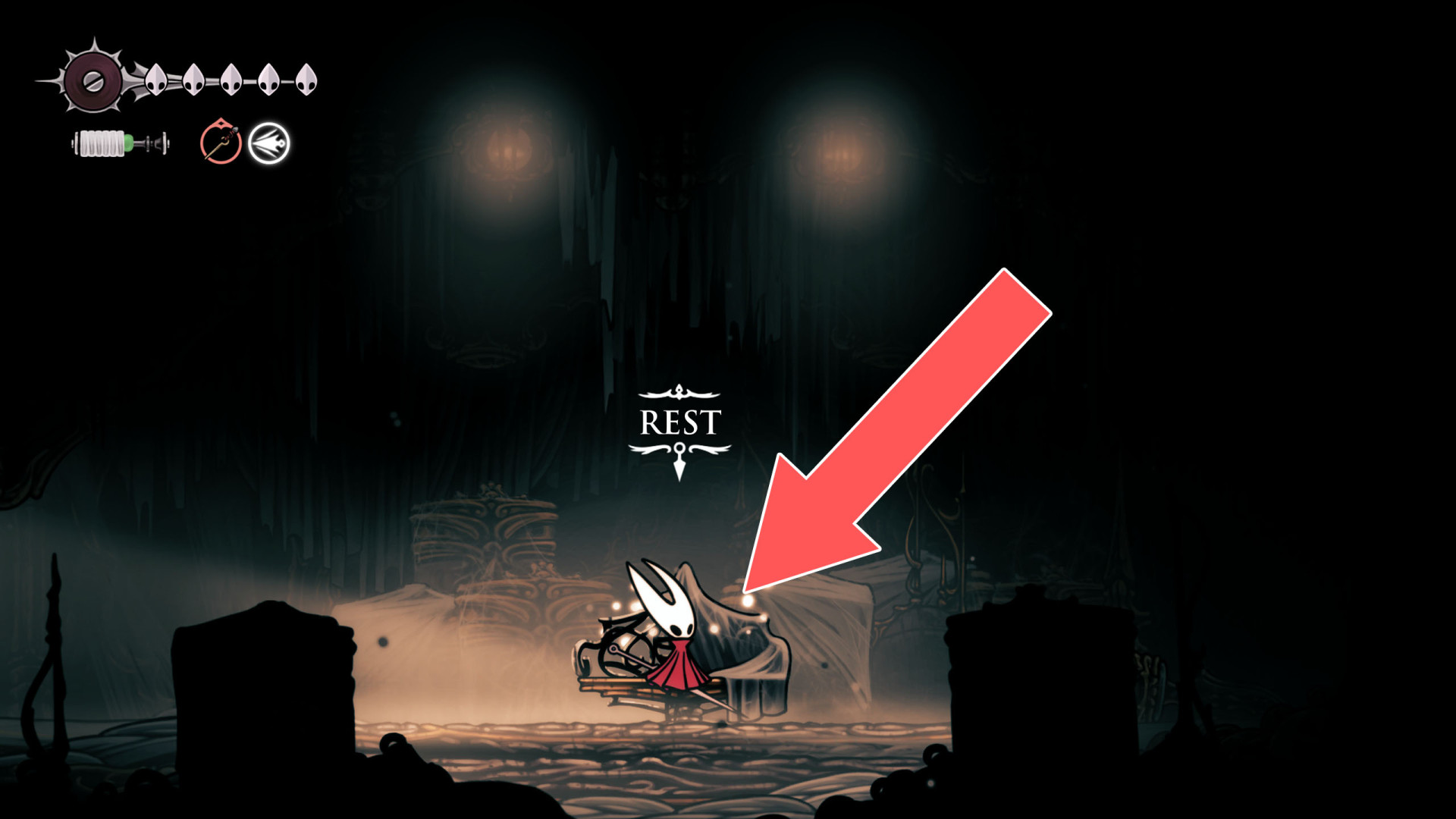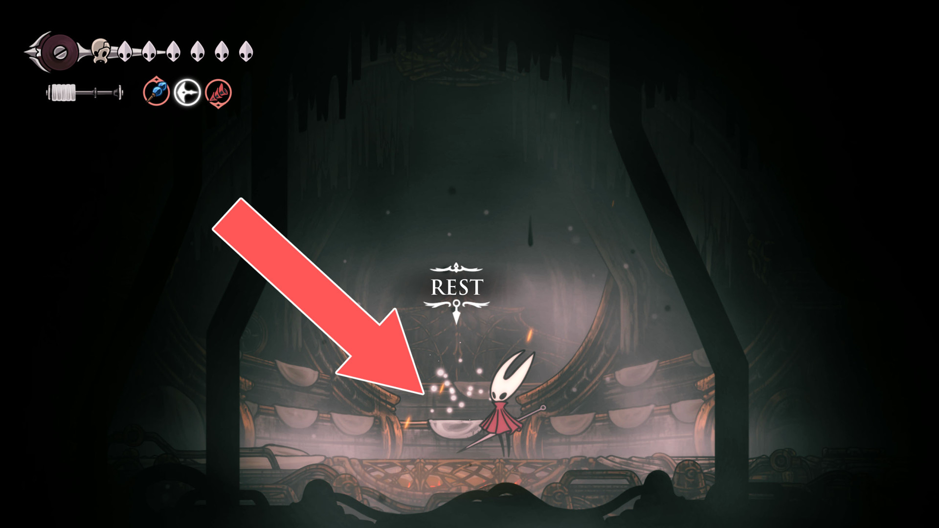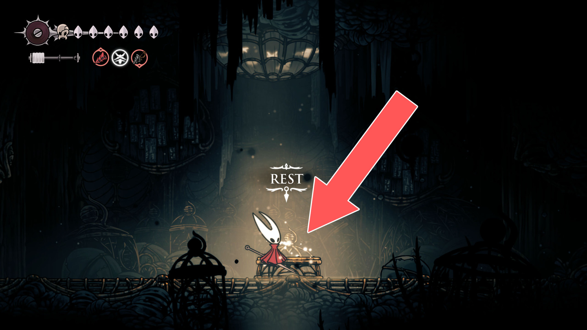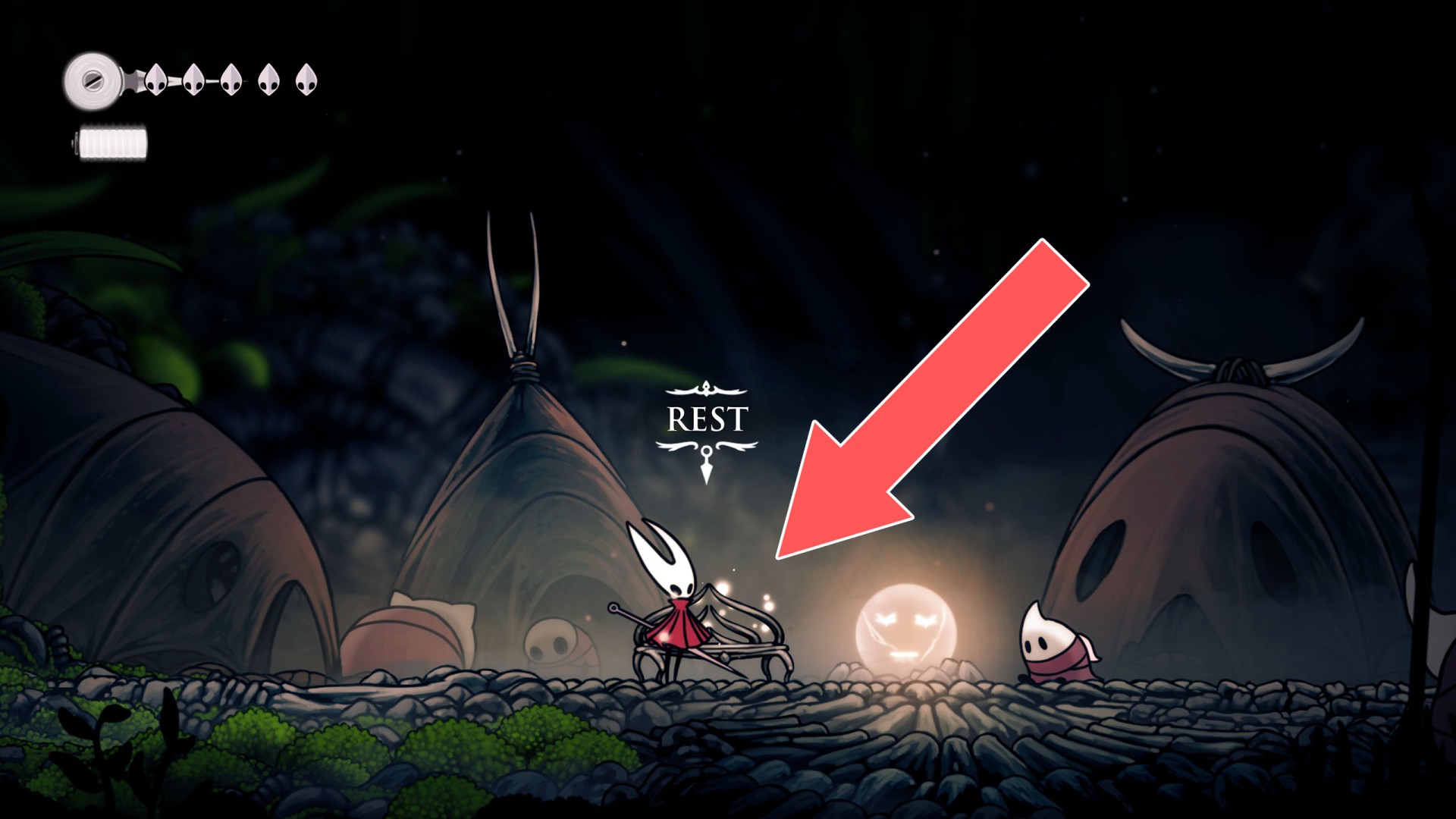 In Hollow Knight: Silksong, benches are checkpoints where Hornet can rest, fully restore health, refill equipped Tools with Shell Shards, and swap Tools or Crests. They serve as spawn points after death or quitting, with some requiring Rosary tolls to access.