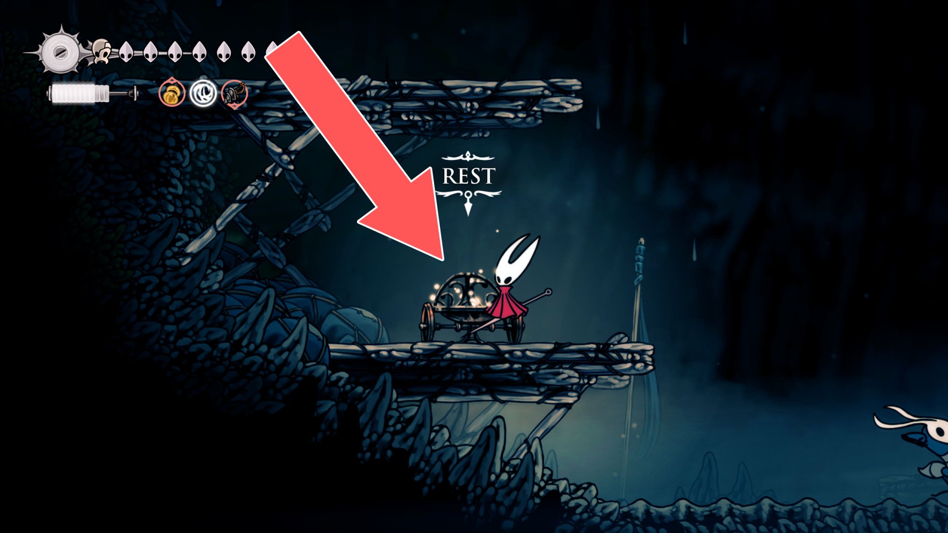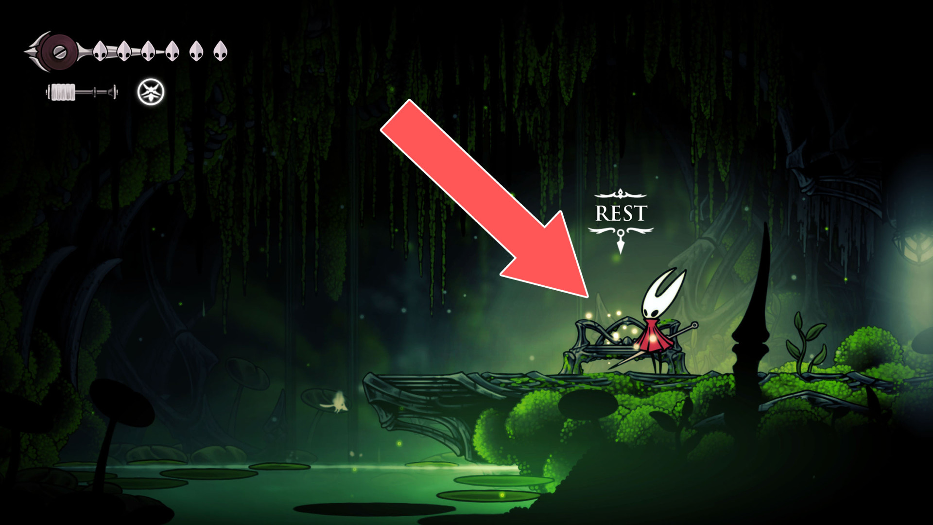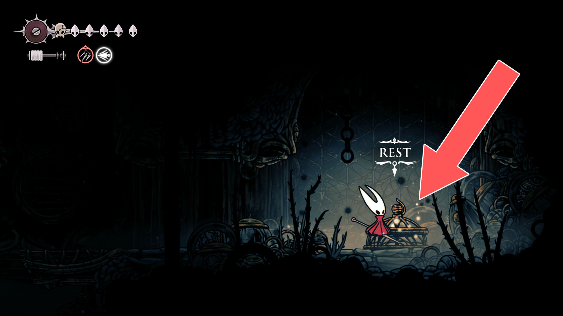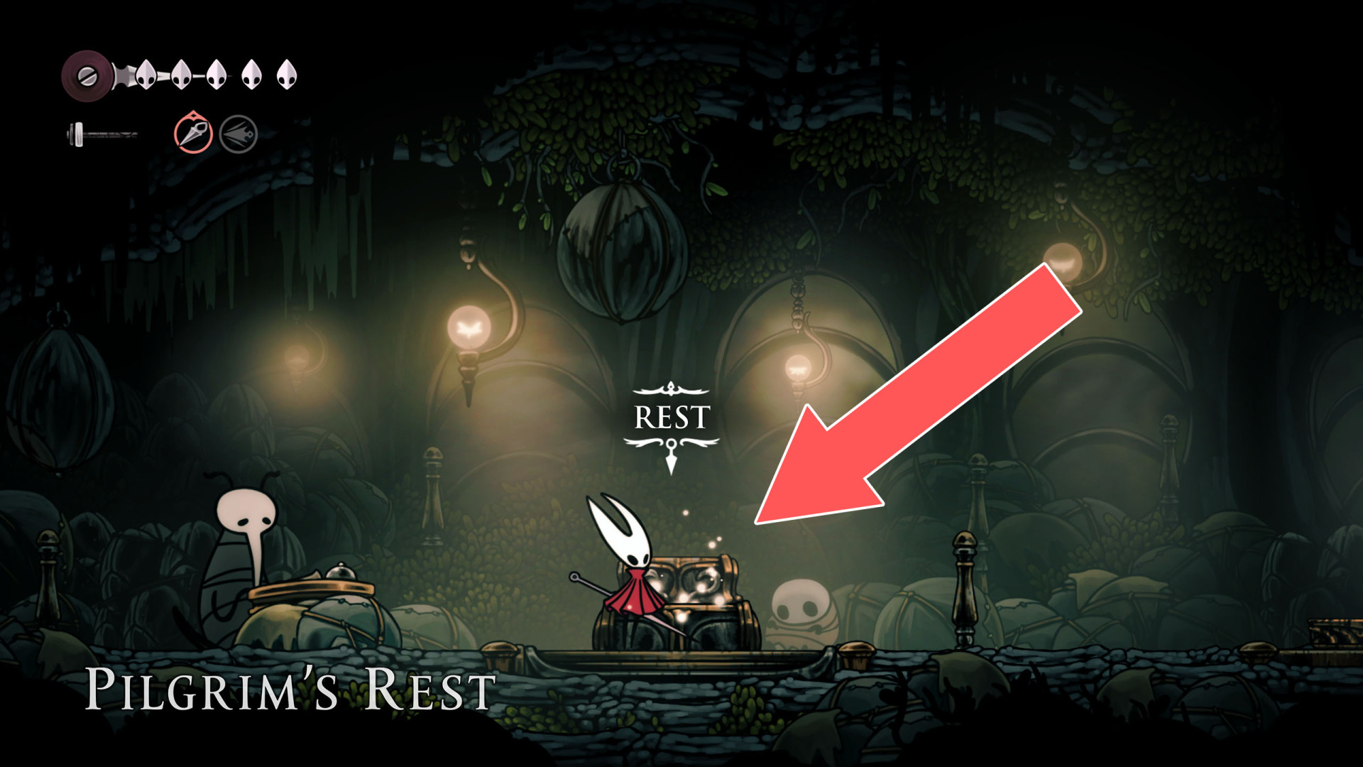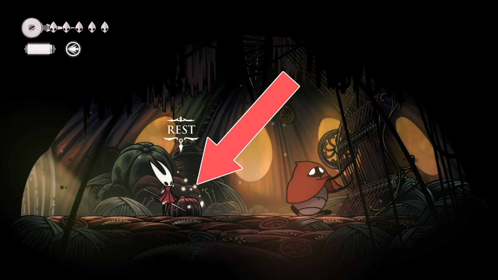 In Hollow Knight: Silksong, benches are checkpoints where Hornet can rest, fully restore health, refill equipped Tools with Shell Shards, and swap Tools or Crests. They serve as spawn points after death or quitting, with some requiring Rosary tolls to access.