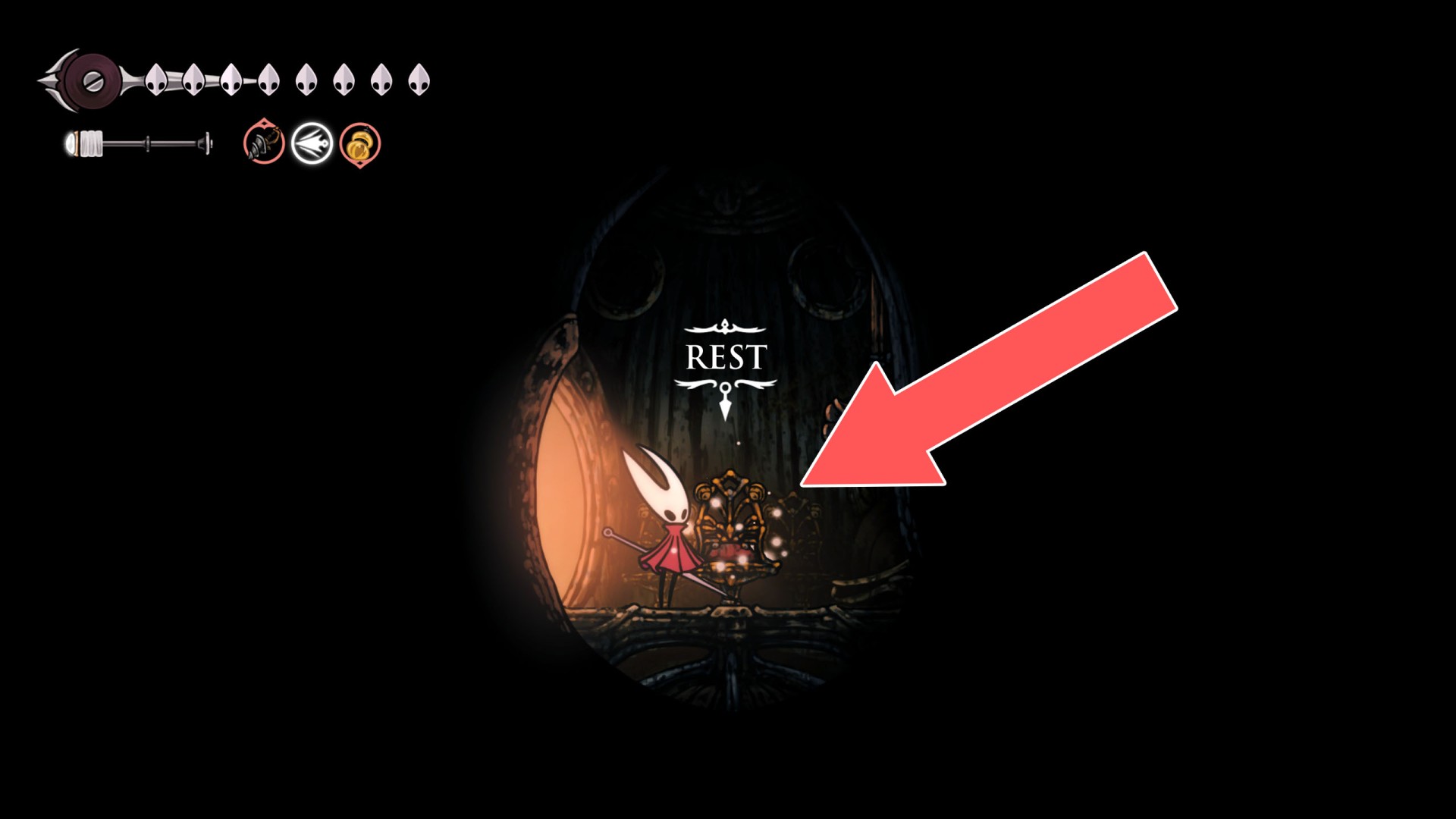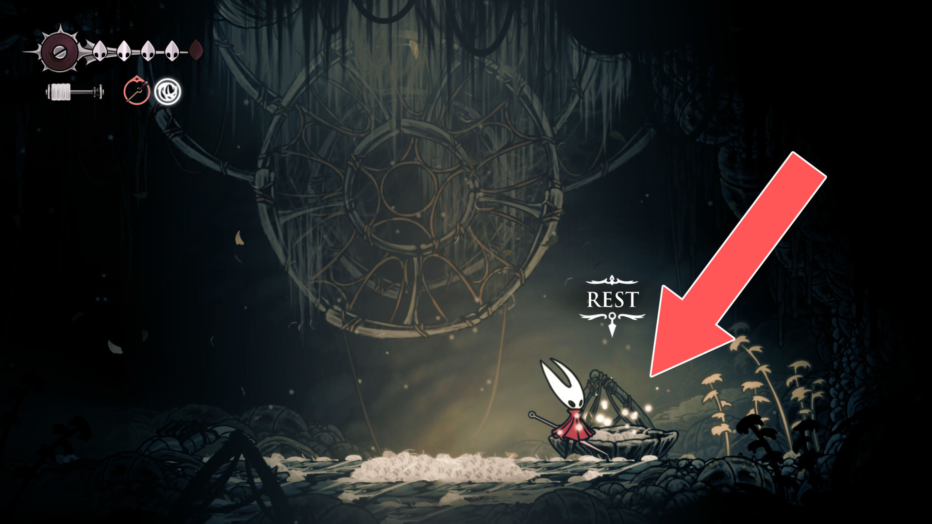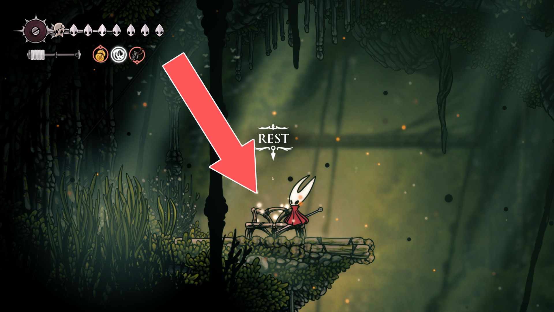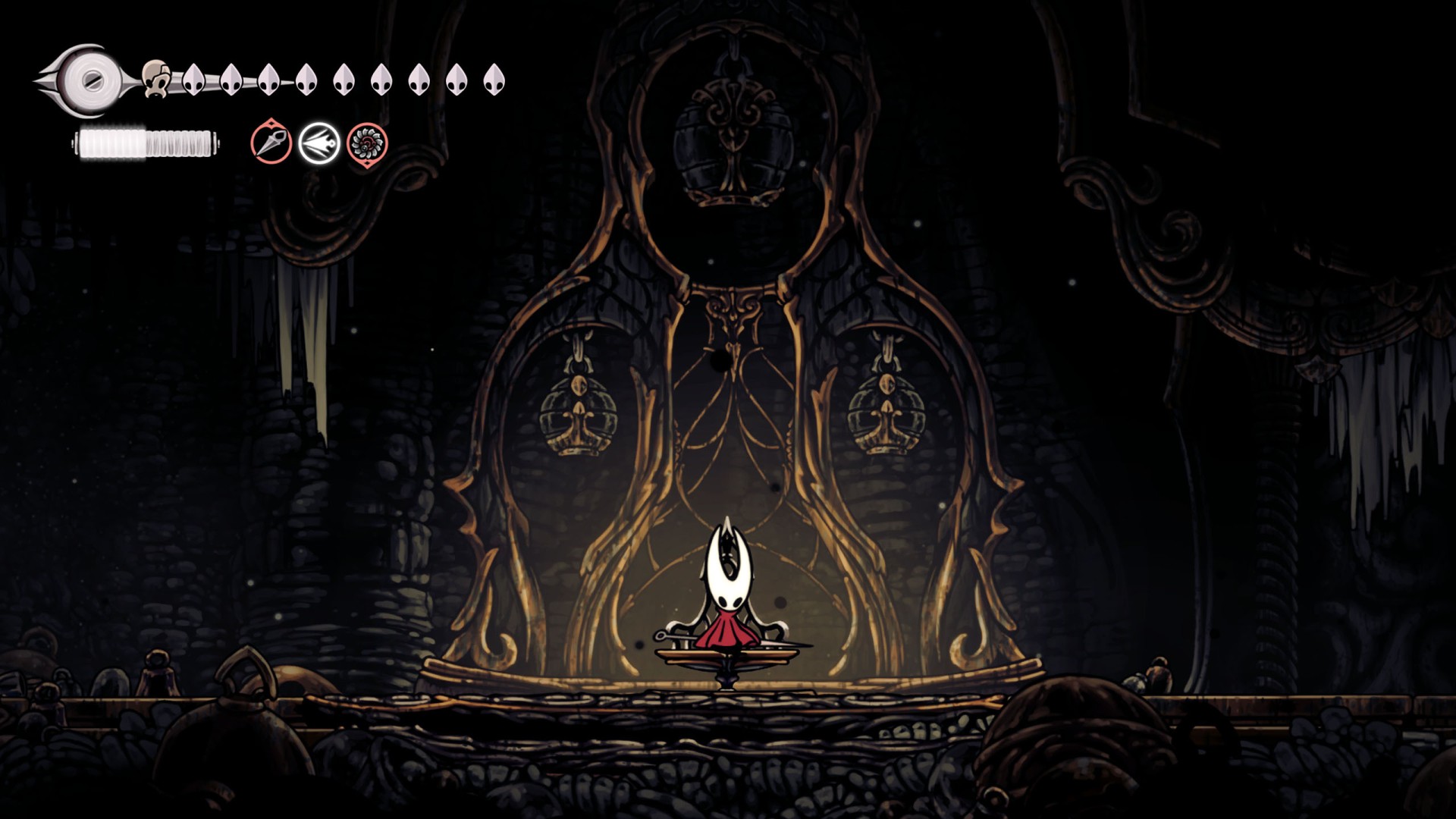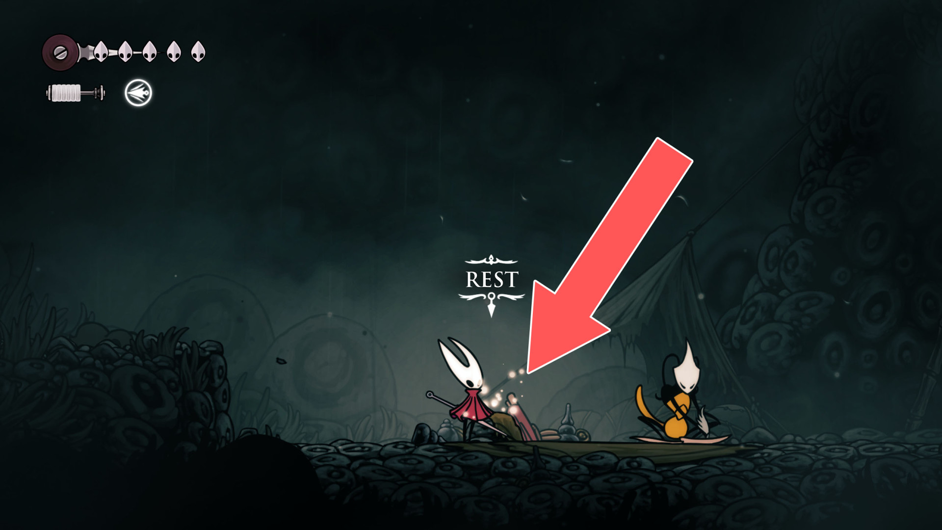 In Hollow Knight: Silksong, benches are checkpoints where Hornet can rest, fully restore health, refill equipped Tools with Shell Shards, and swap Tools or Crests. They serve as spawn points after death or quitting, with some requiring Rosary tolls to access.