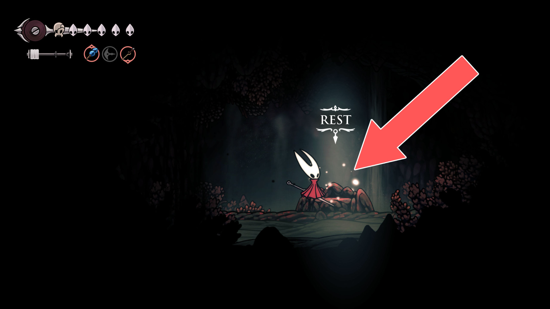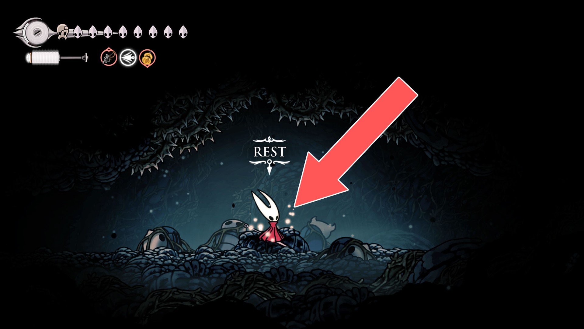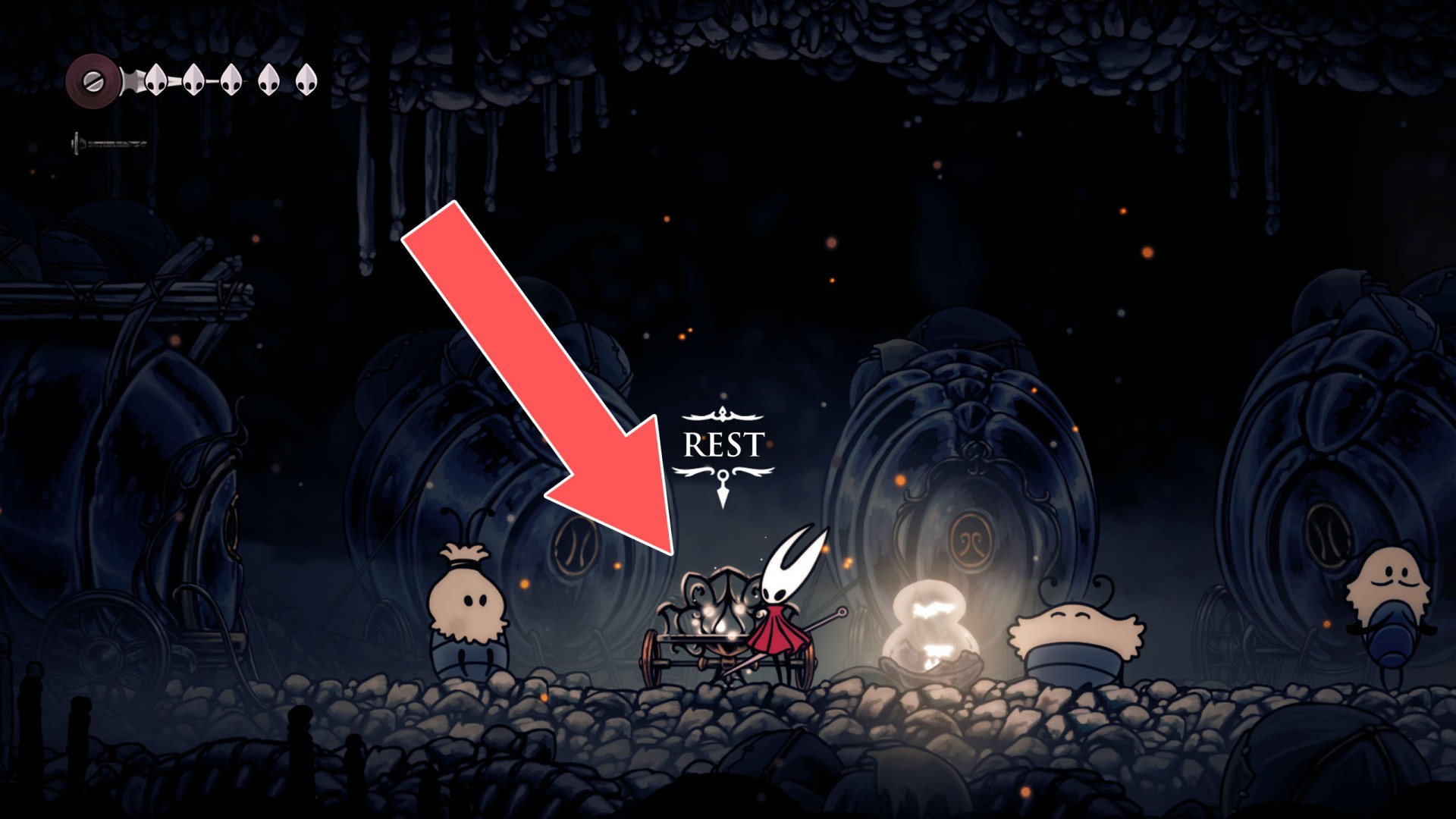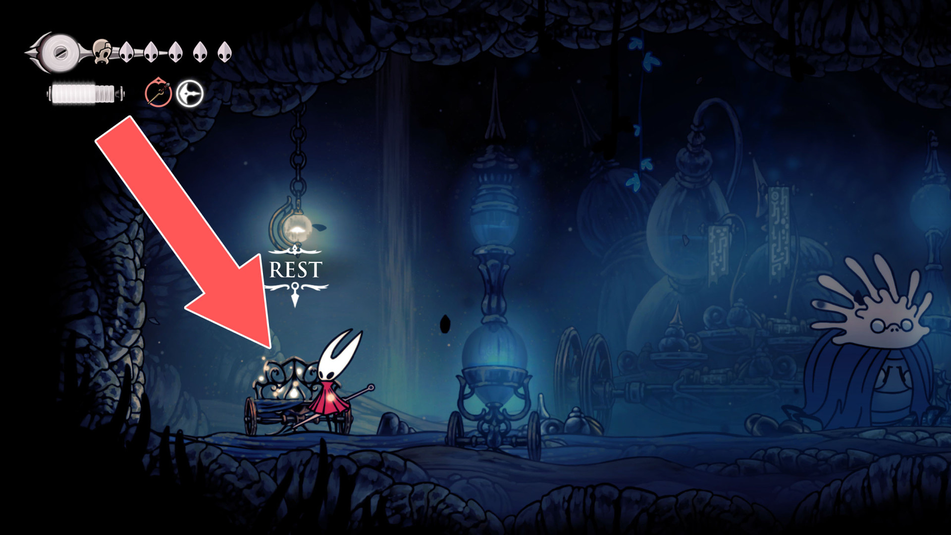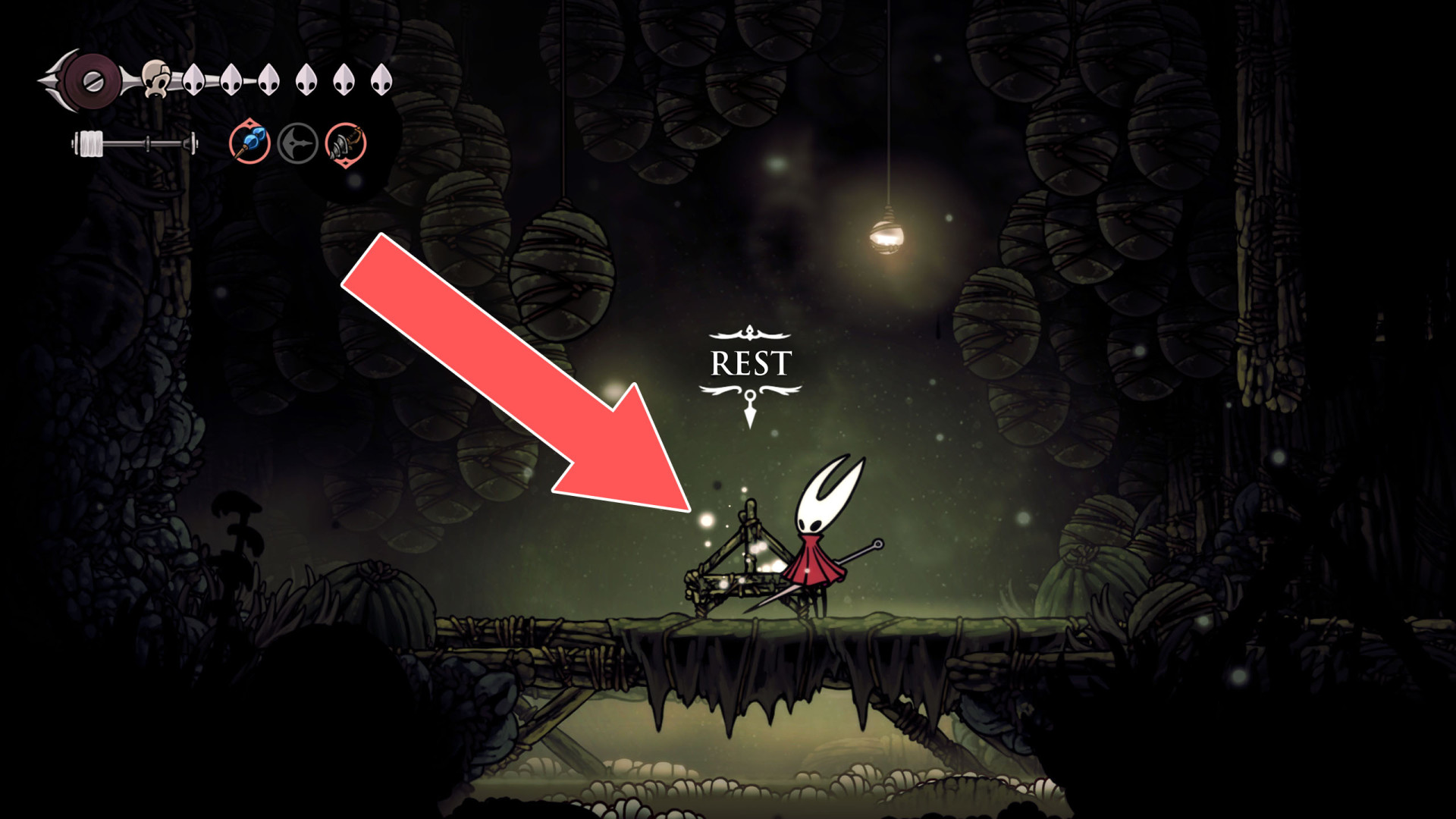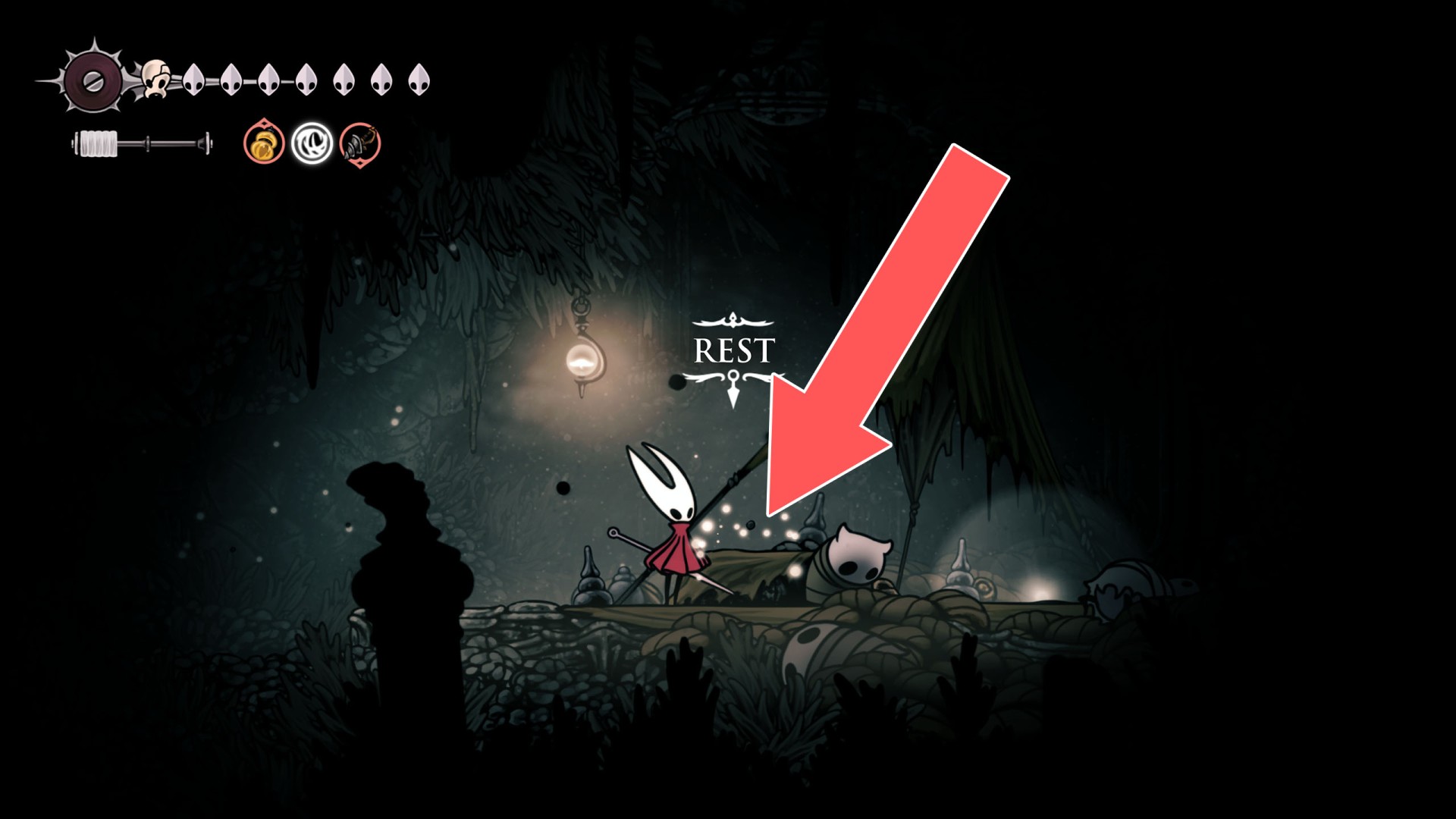 In Hollow Knight: Silksong, benches are checkpoints where Hornet can rest, fully restore health, refill equipped Tools with Shell Shards, and swap Tools or Crests. They serve as spawn points after death or quitting, with some requiring Rosary tolls to access.