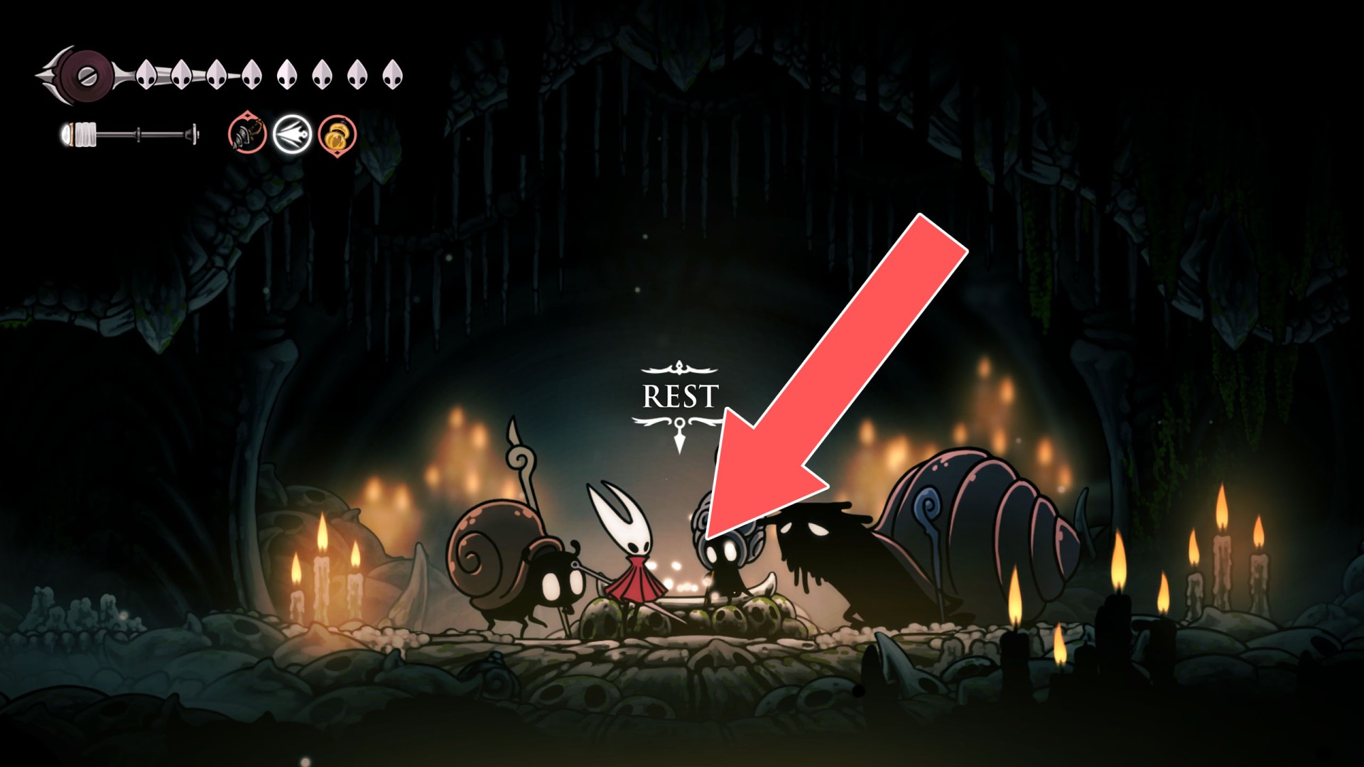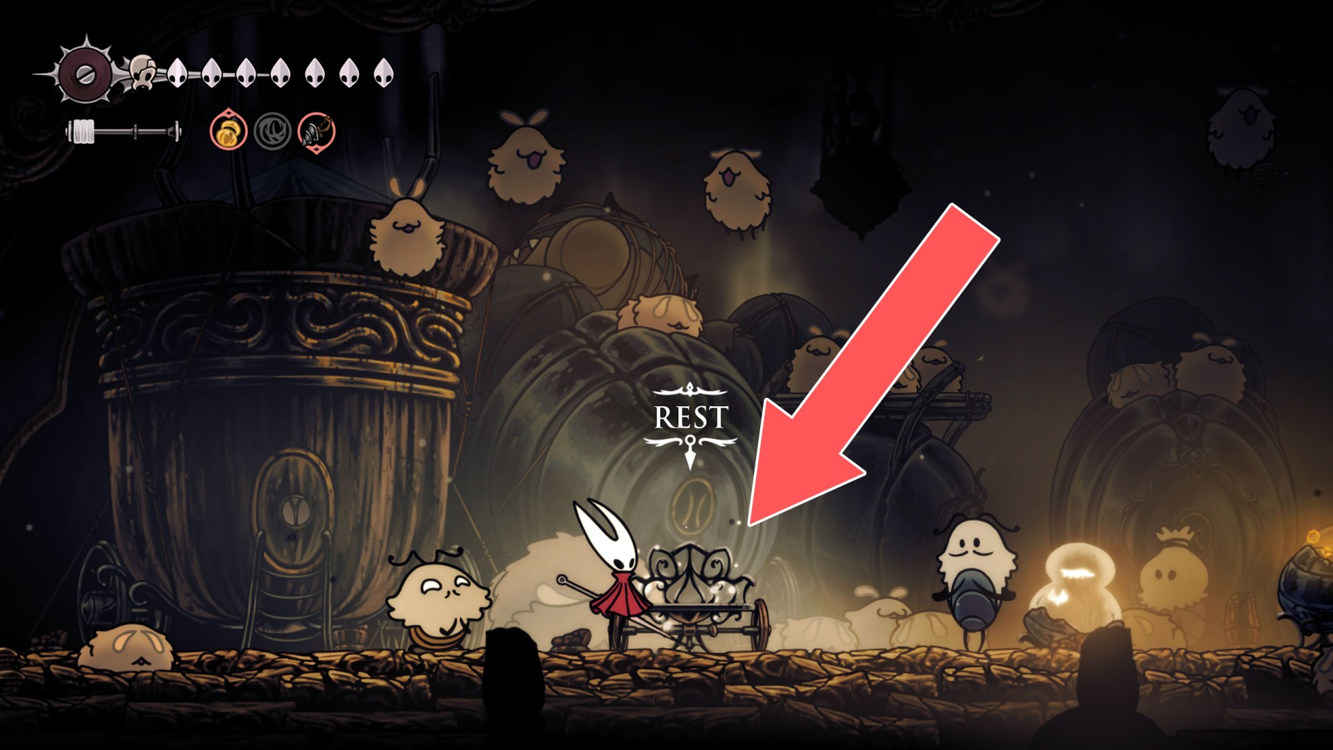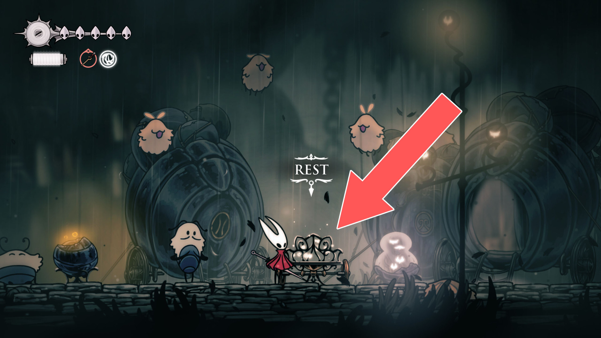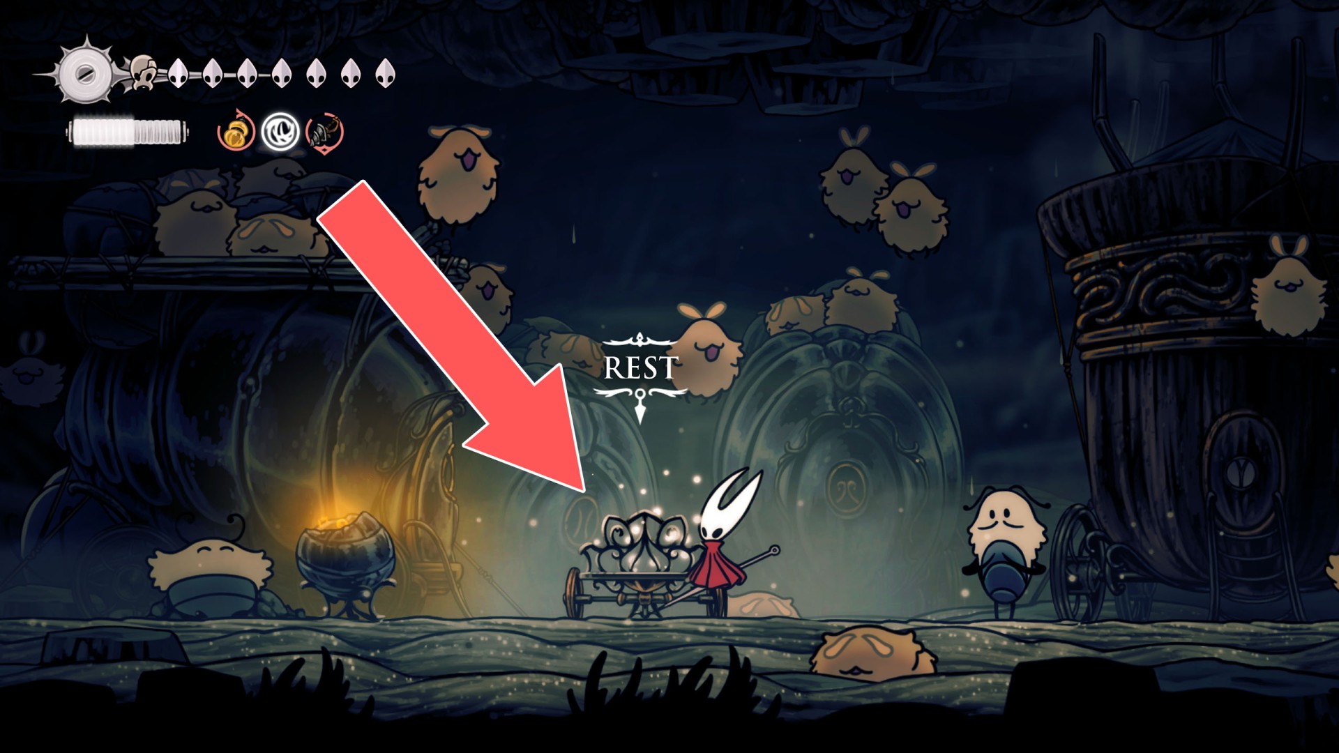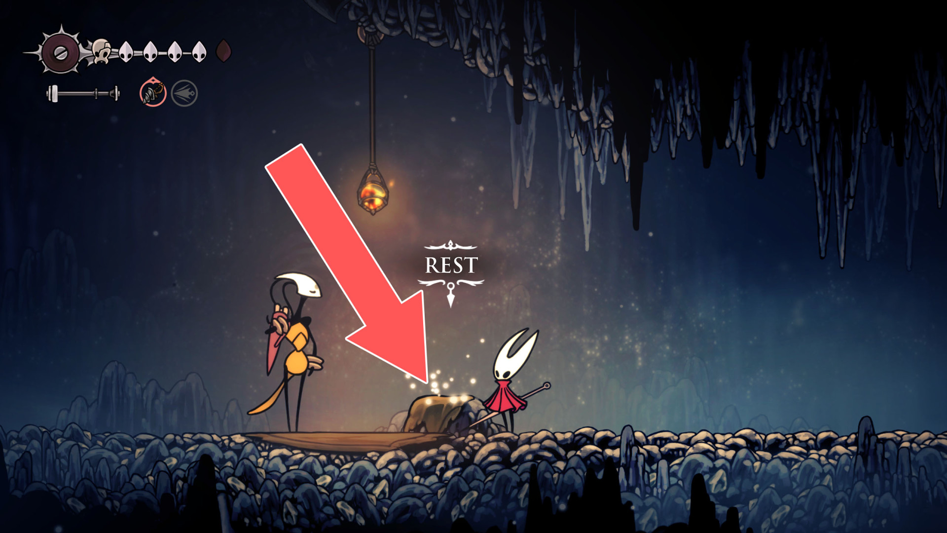 In Hollow Knight: Silksong, benches are checkpoints where Hornet can rest, fully restore health, refill equipped Tools with Shell Shards, and swap Tools or Crests. They serve as spawn points after death or quitting, with some requiring Rosary tolls to access.