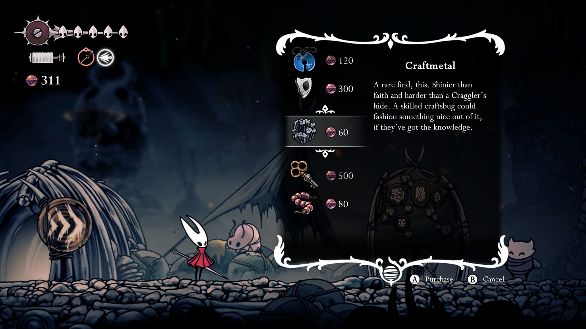 Craftmetal in Hollow Knight: Silksong is a rare upgrade material harvested from deposits. Its main purpose is to forge and purchase powerful new tools from the Forge Daughter or Twelfth Architect, which enhance Hornet's stats, combat options, and traversal abilities.