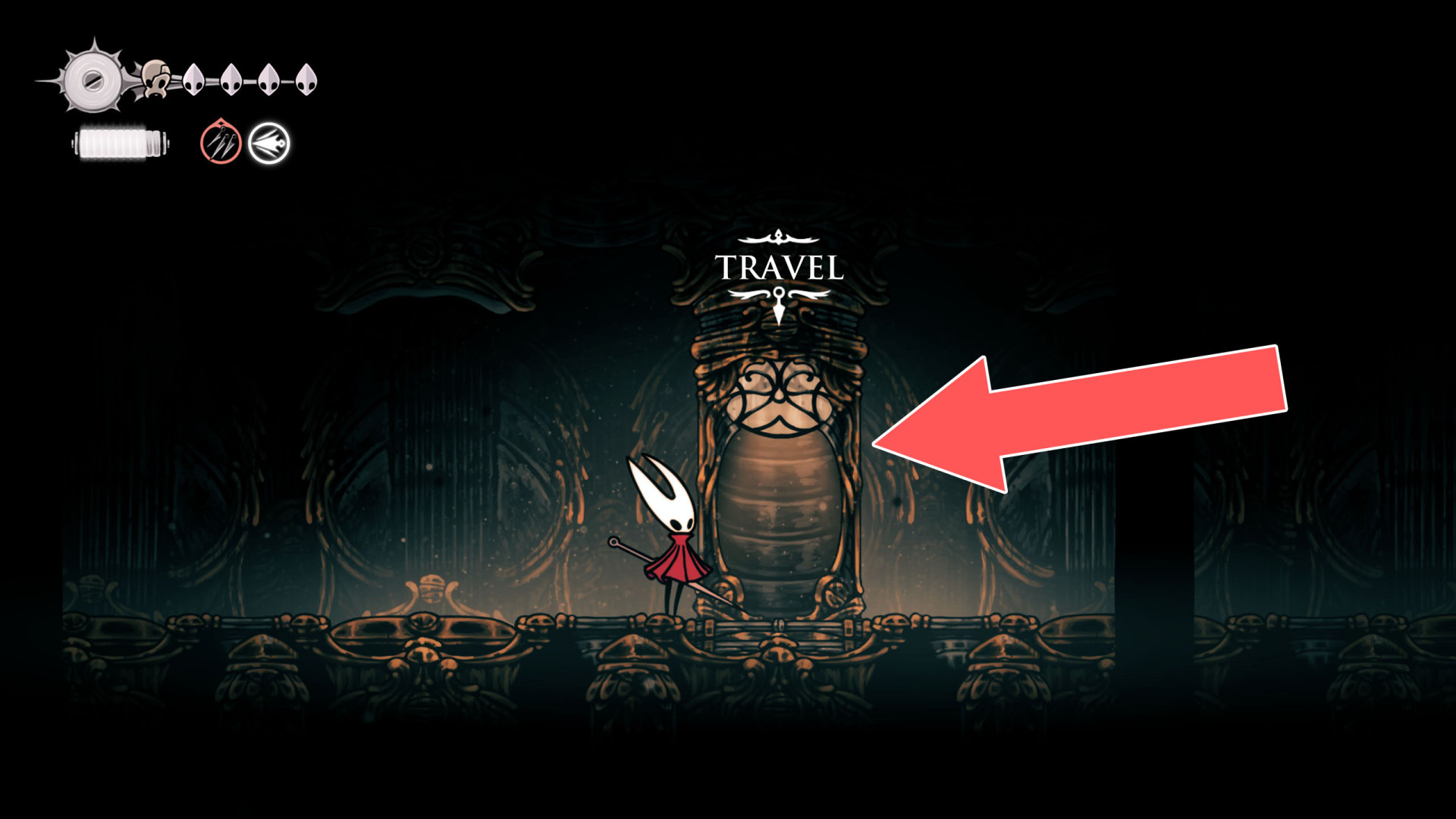 In Hollow Knight: Silksong, the primary fast travel system is the Pharloom Bellways, a network of stations identified by signposts bearing three right-pointing arrows. These stations allow players to travel instantly between previously discovered Bellway locations by riding the Bell Beast.