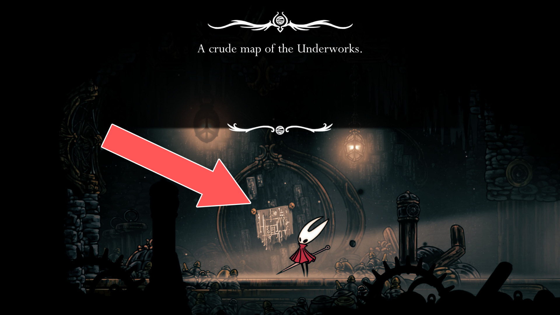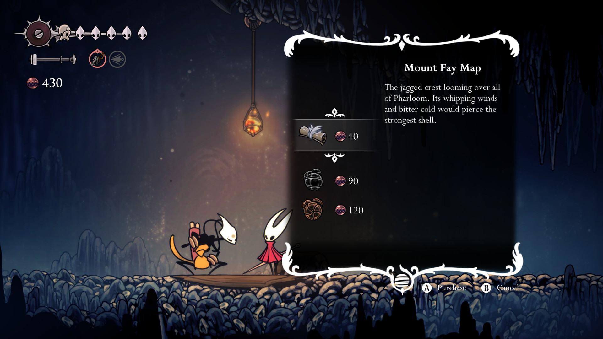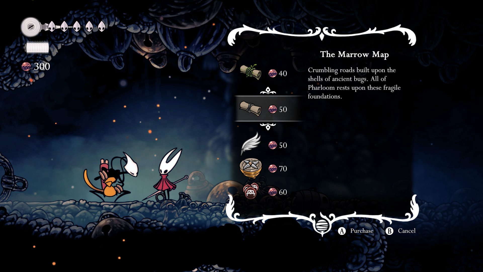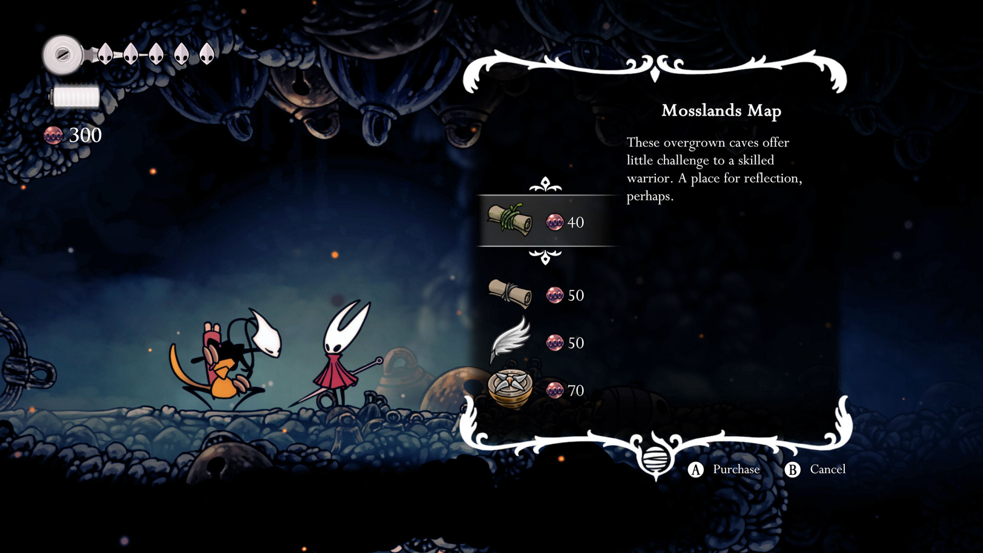 Once acquired, a map shows terrain, benches, and major landmarks. Its usefulness increases when combined with tools like the Compass, which displays Hornet's real-time position, and the Quill, which allows players to fill in missing portions of the map.