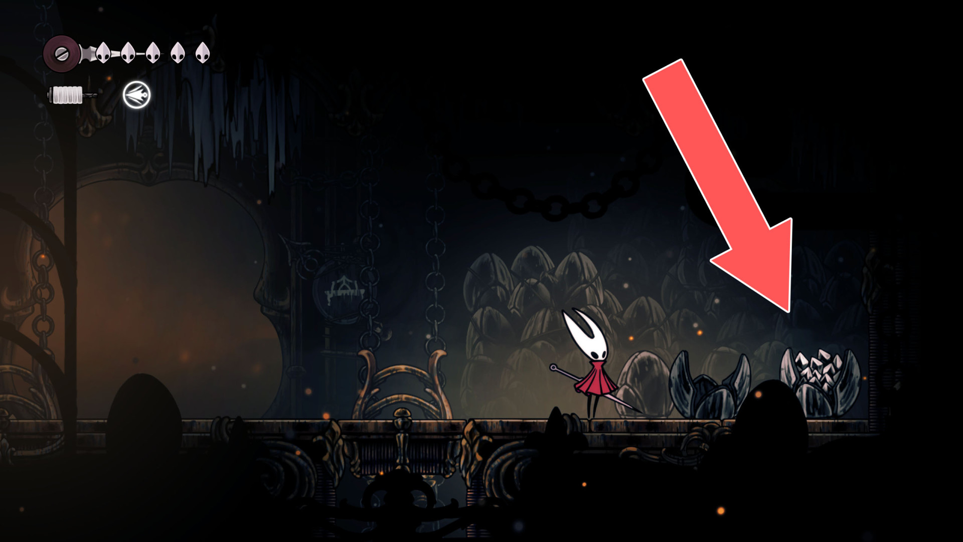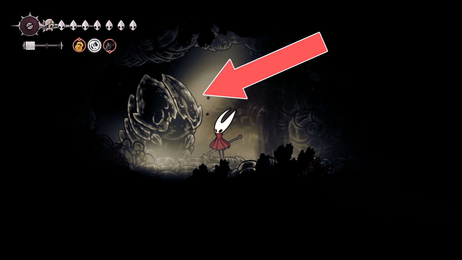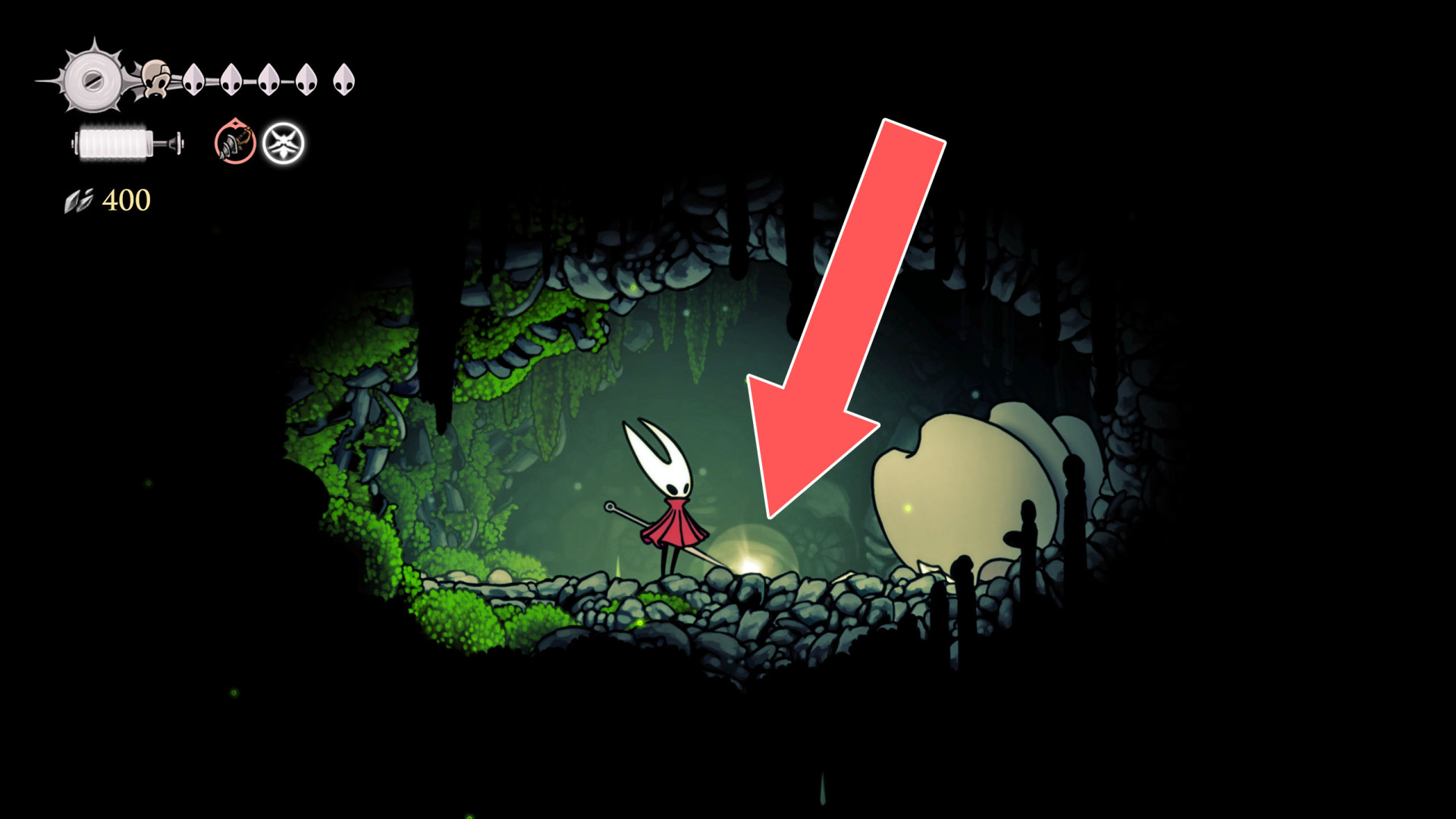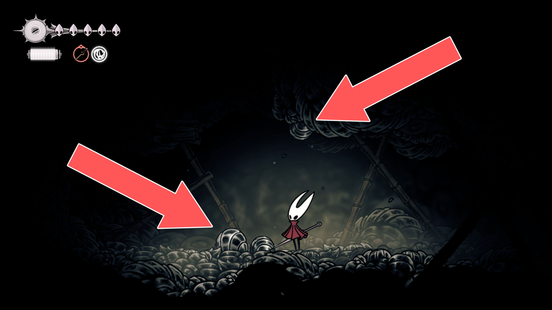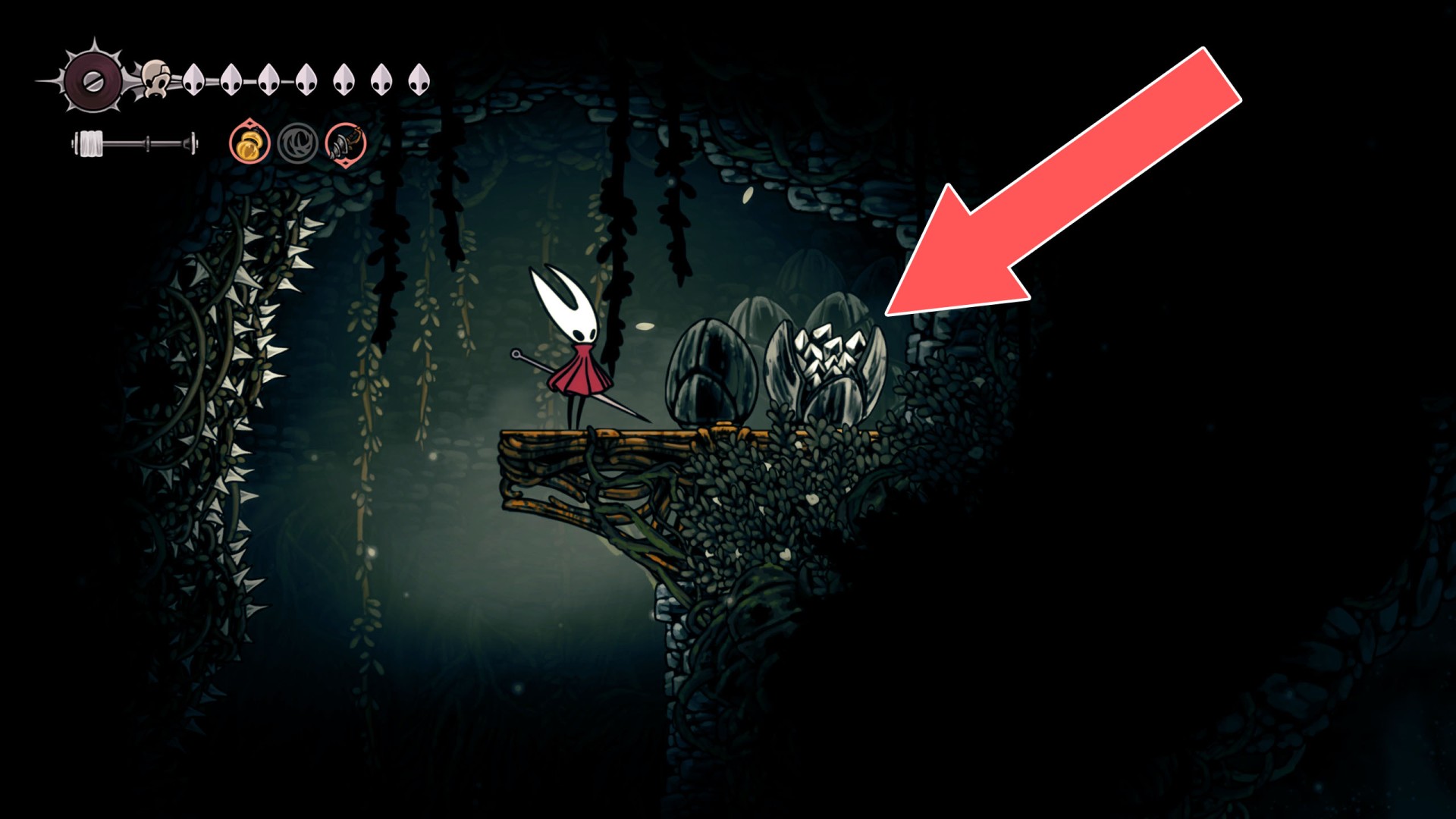 Shell Shard Deposits appear as shiny, interactive objects such as round rocks, grub-like statues, or embedded ropes that flash intermittently to catch the player's attention. Hornet can break these deposits by attacking them with her Needle, releasing 10–50 Shell Shards per deposit.