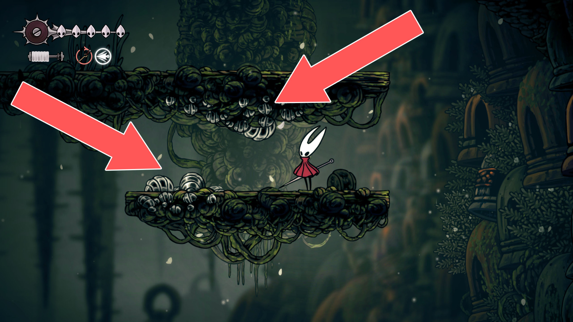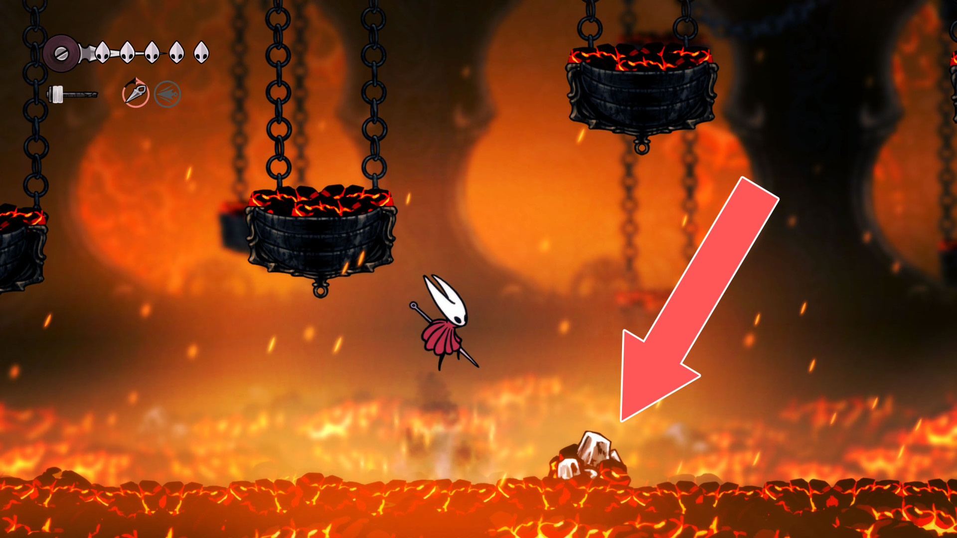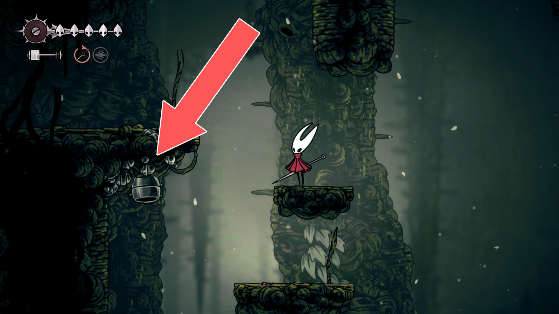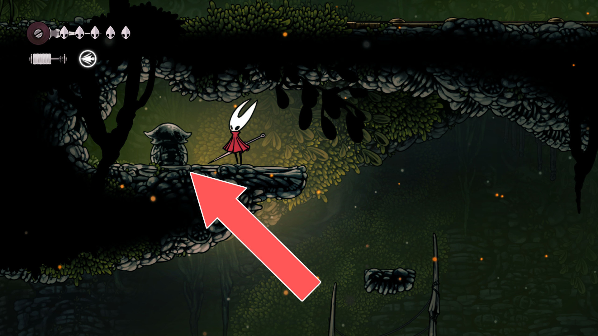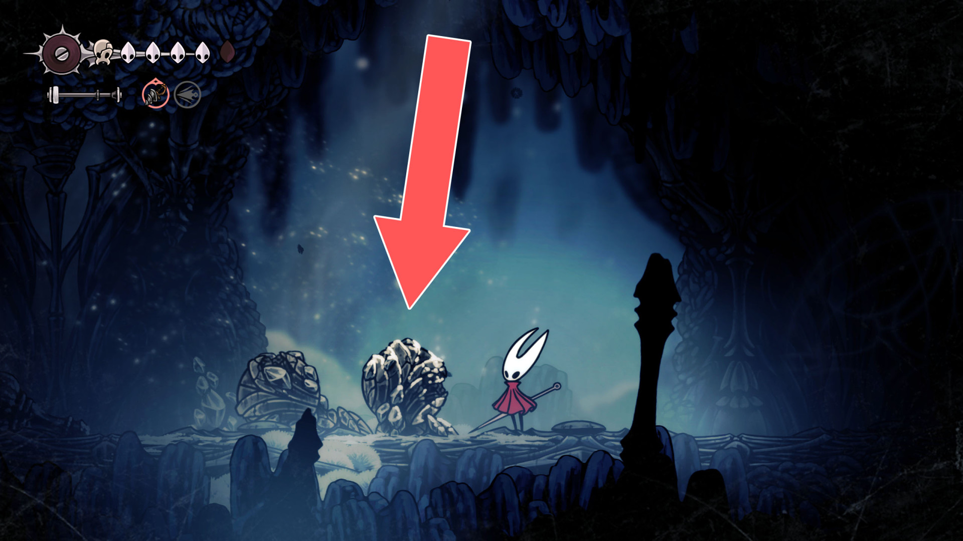 Shell Shard Deposits appear as shiny, interactive objects such as round rocks, grub-like statues, or embedded ropes that flash intermittently to catch the player's attention. Hornet can break these deposits by attacking them with her Needle, releasing 10–50 Shell Shards per deposit.
