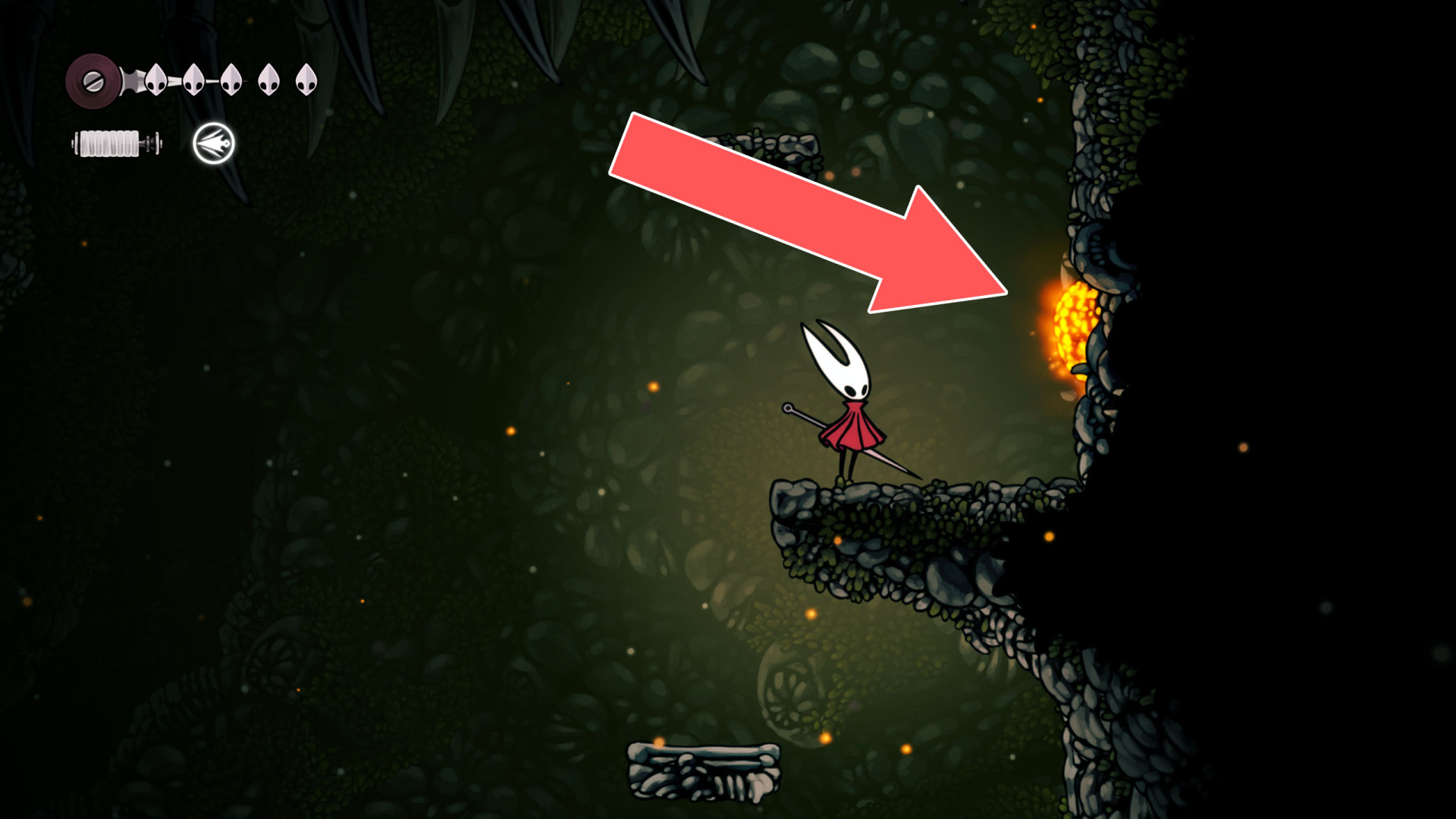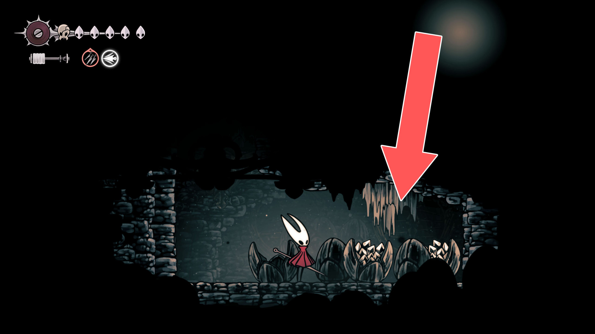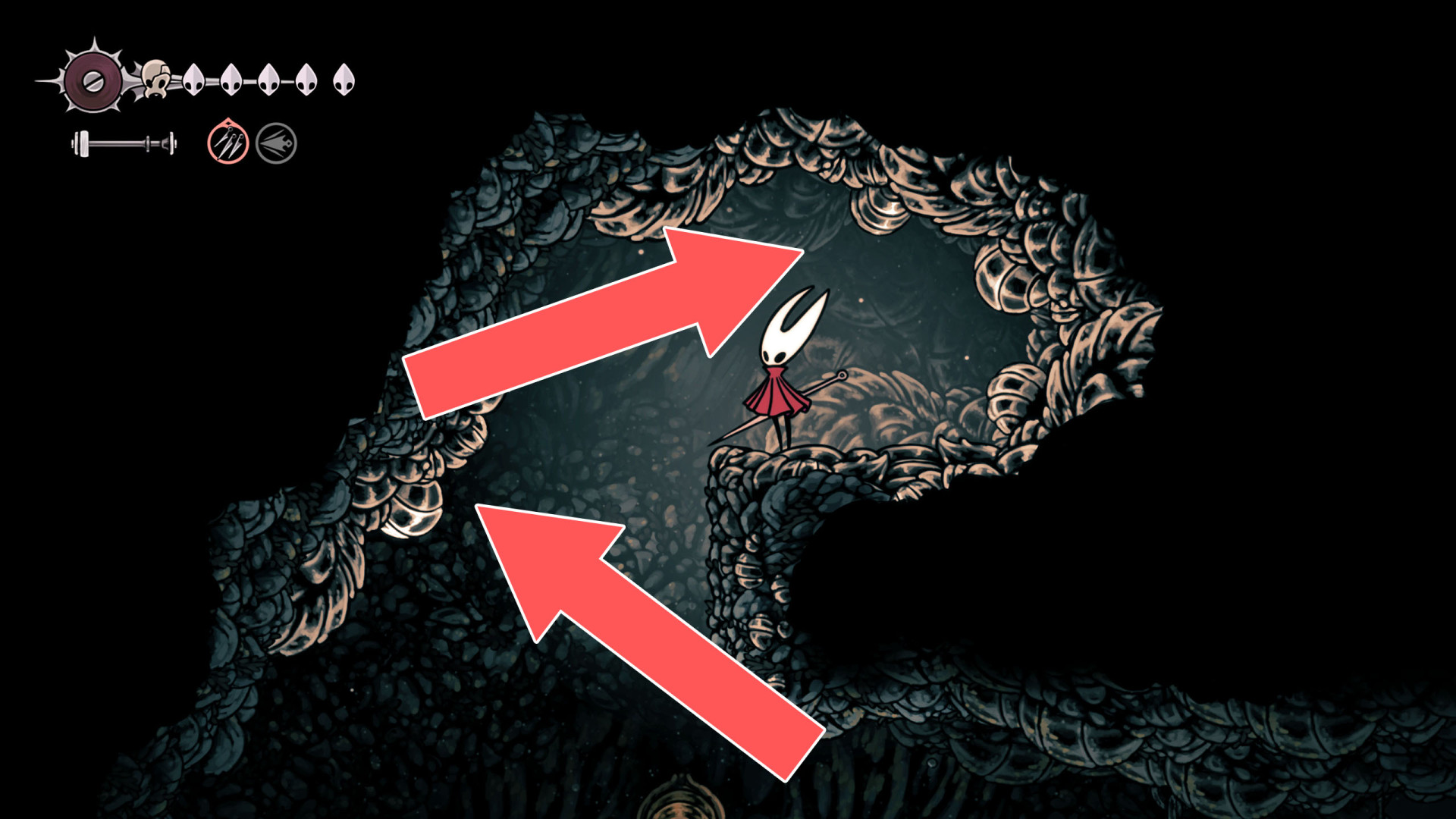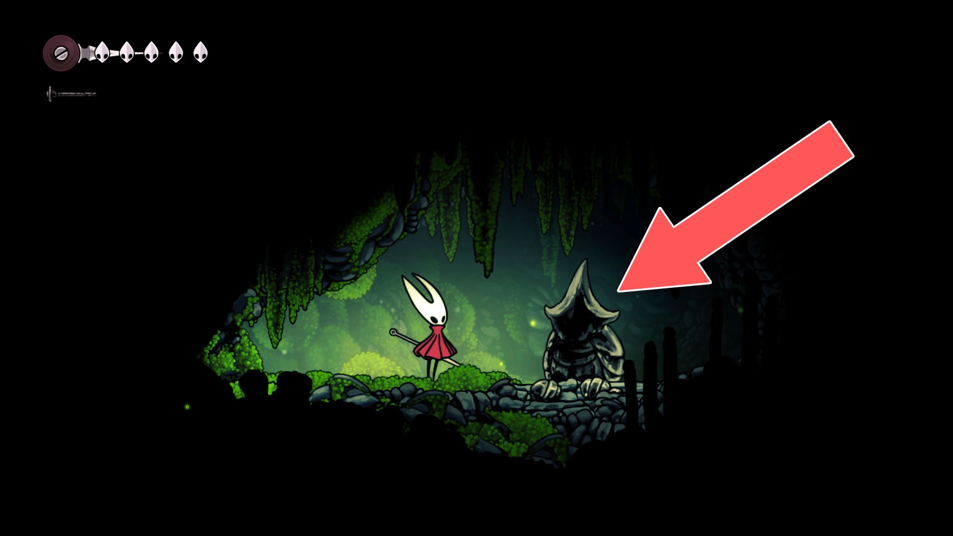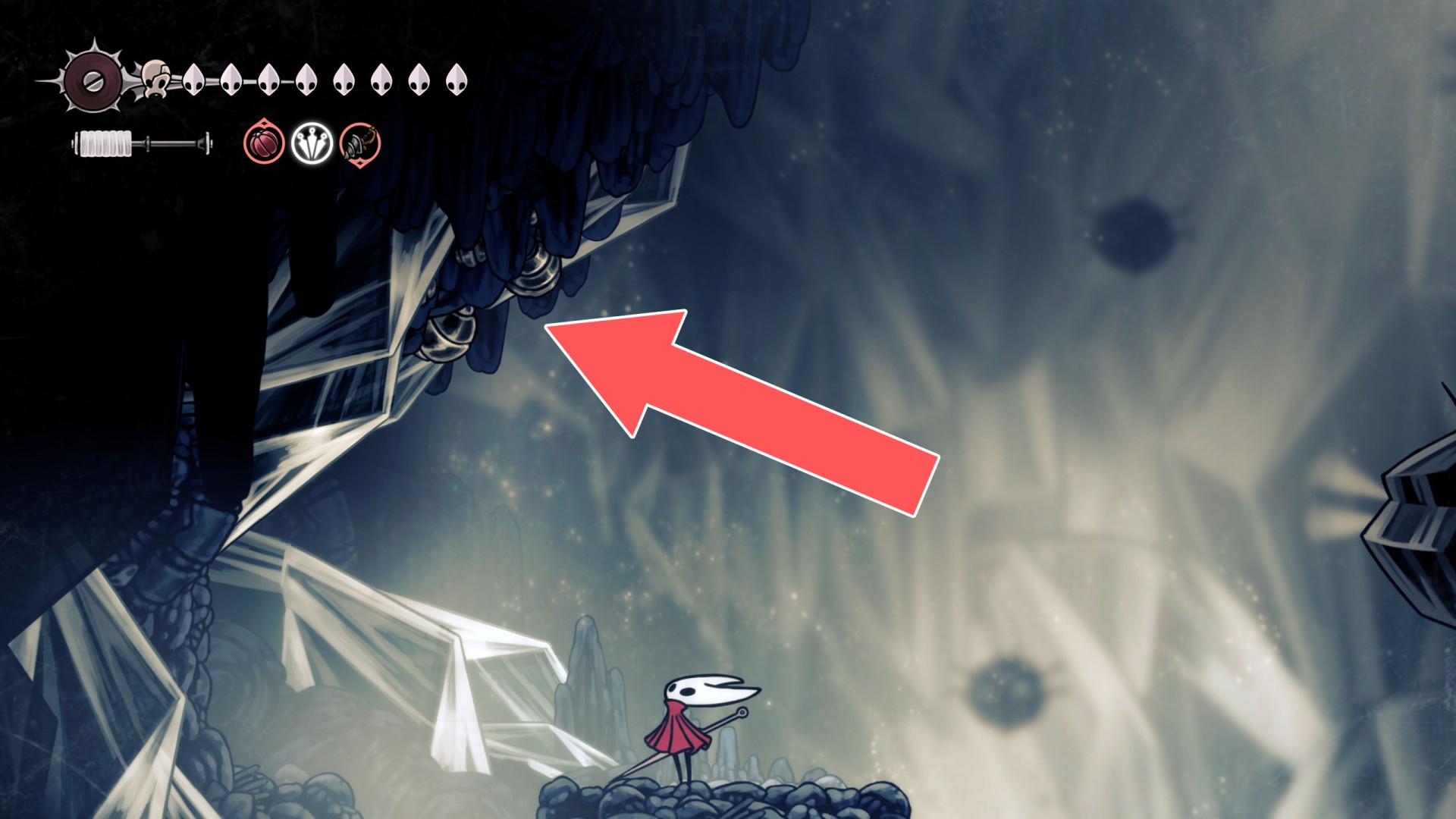 Shell Shard Deposits appear as shiny, interactive objects such as round rocks, grub-like statues, or embedded ropes that flash intermittently to catch the player's attention. Hornet can break these deposits by attacking them with her Needle, releasing 10–50 Shell Shards per deposit.