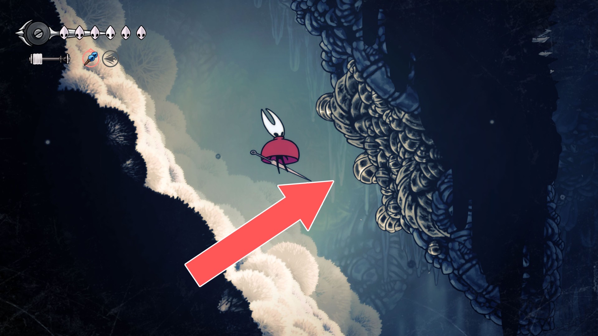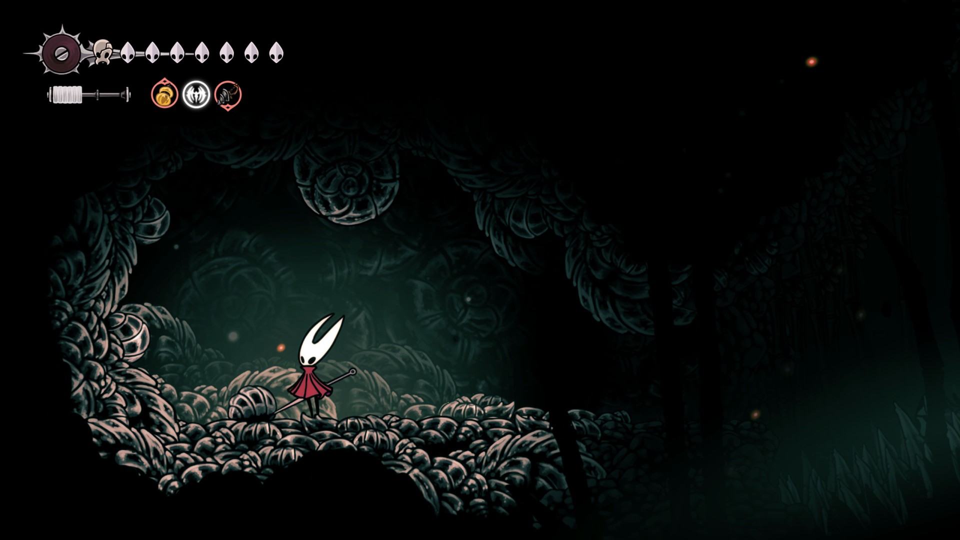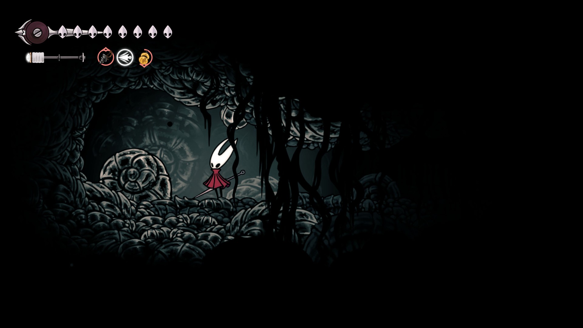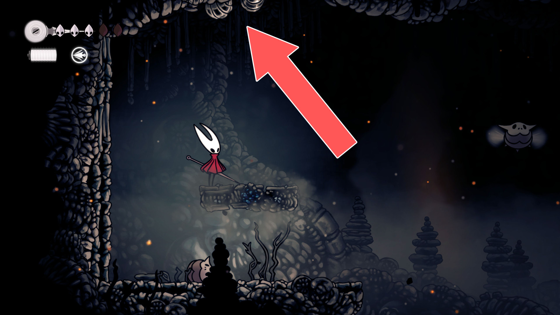 Shell Shard Deposits appear as shiny, interactive objects such as round rocks, grub-like statues, or embedded ropes that flash intermittently to catch the player's attention. Hornet can break these deposits by attacking them with her Needle, releasing 10–50 Shell Shards per deposit.