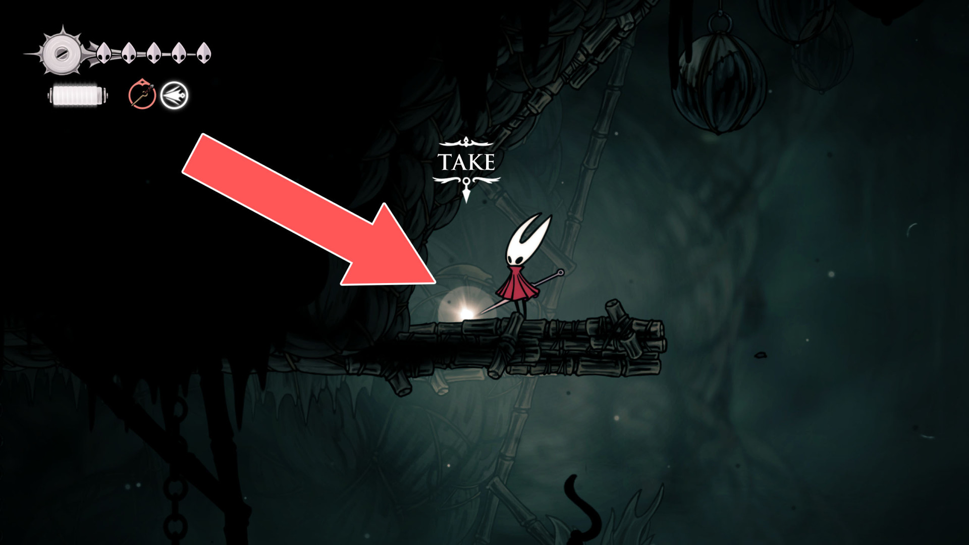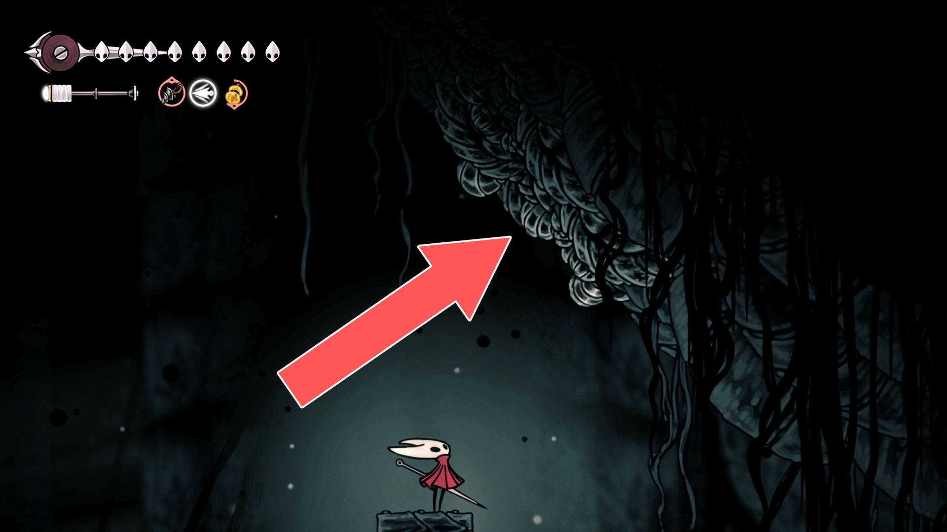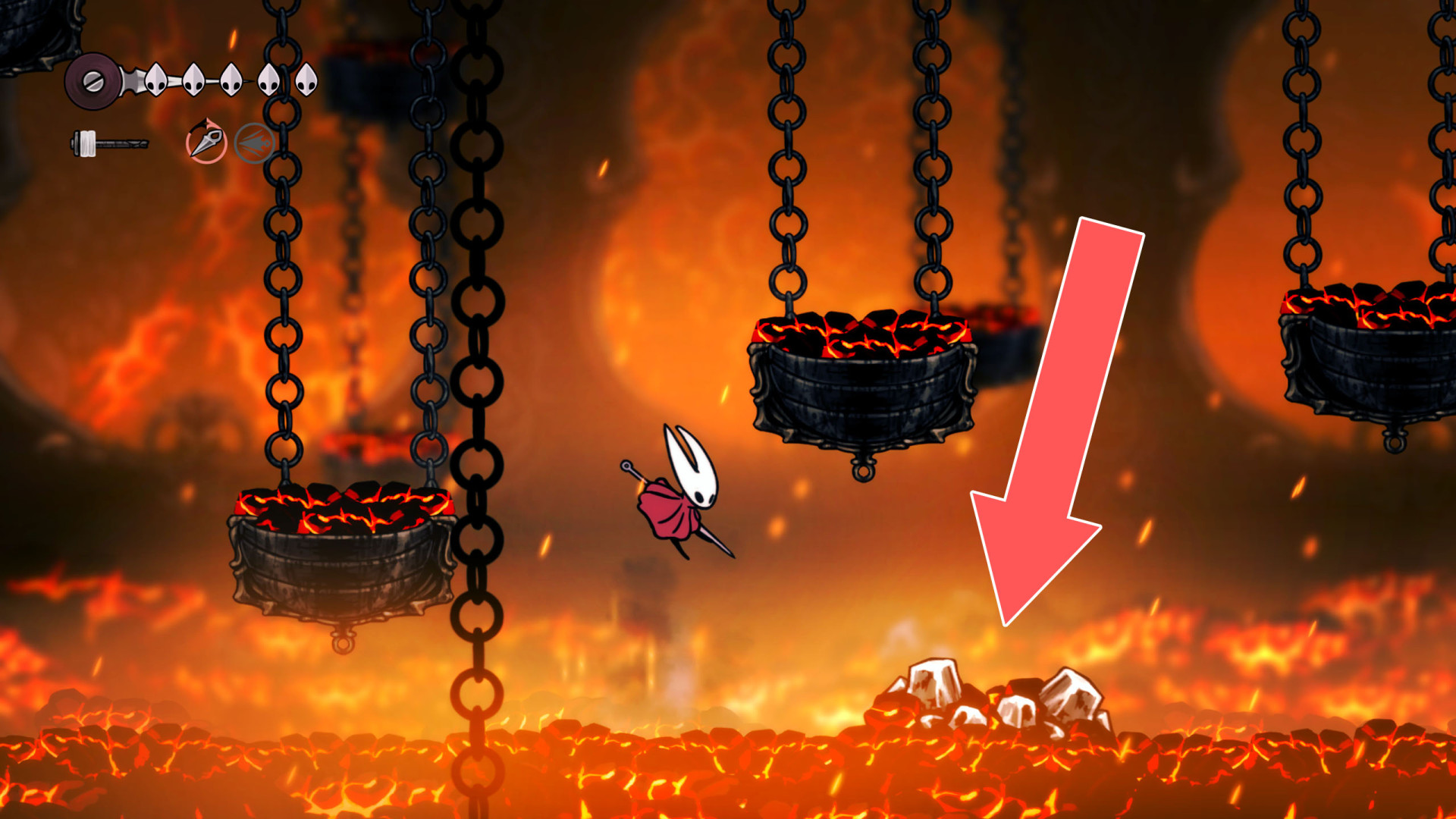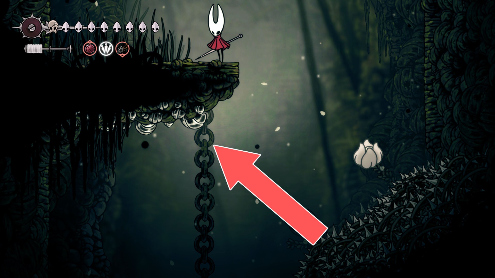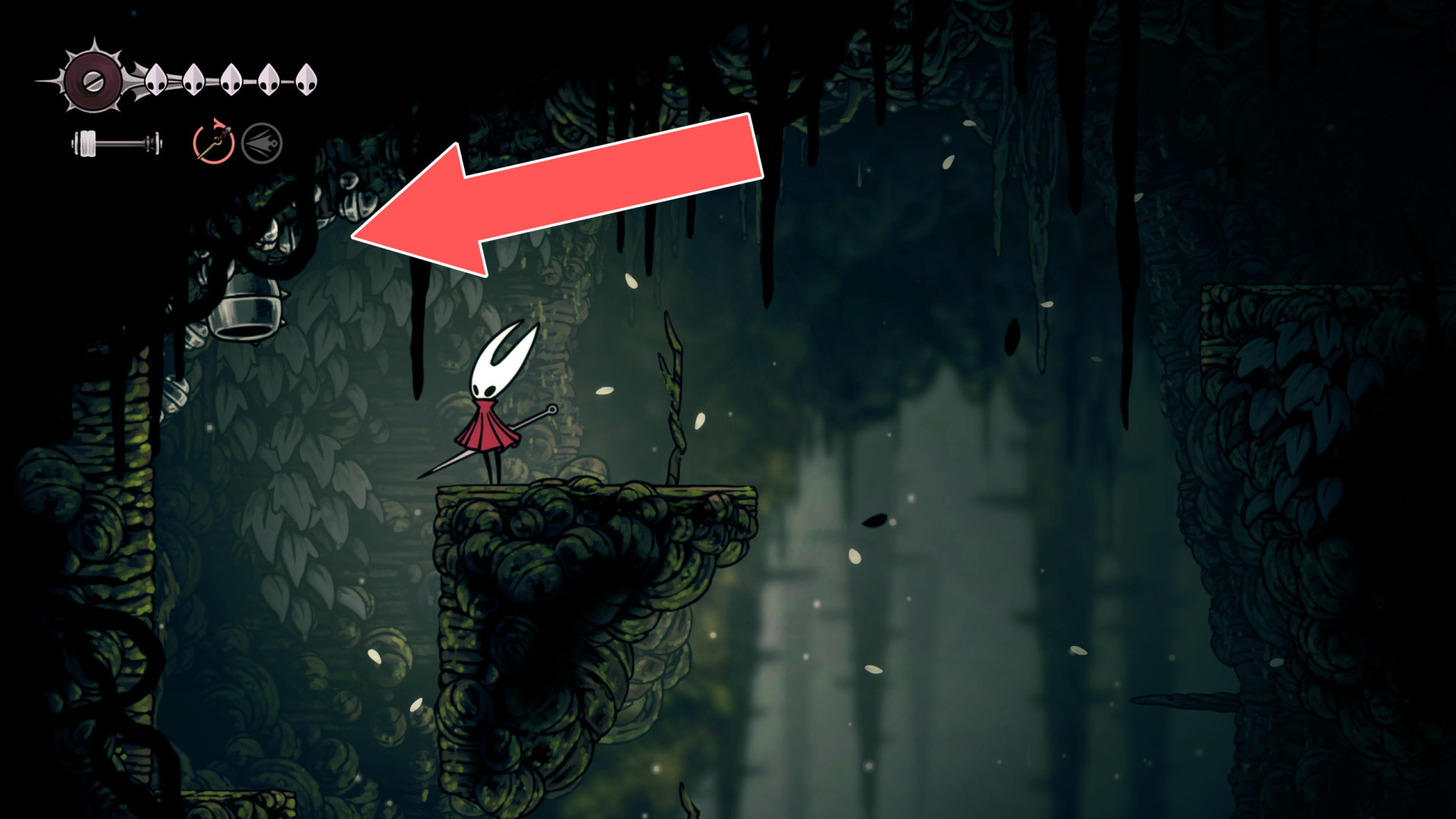 Shell Shard Deposits appear as shiny, interactive objects such as round rocks, grub-like statues, or embedded ropes that flash intermittently to catch the player's attention. Hornet can break these deposits by attacking them with her Needle, releasing 10–50 Shell Shards per deposit.