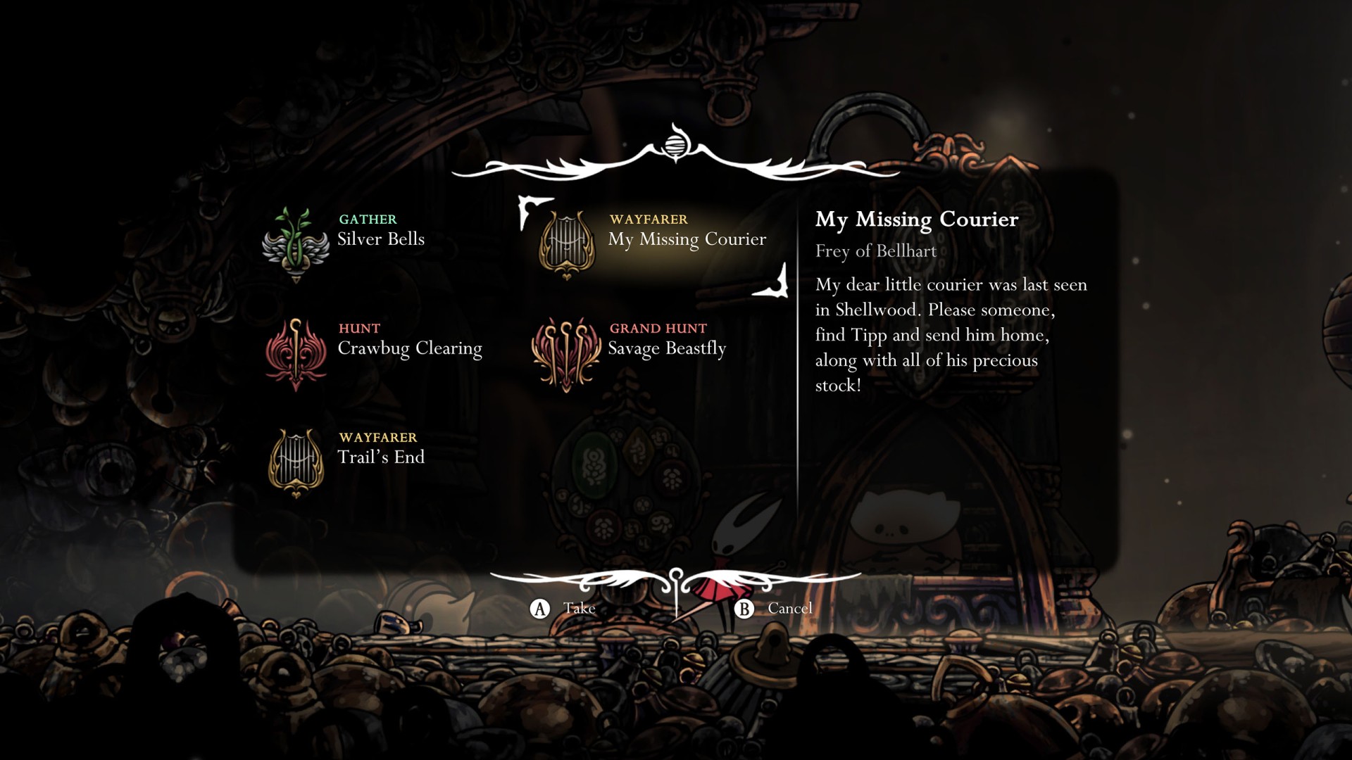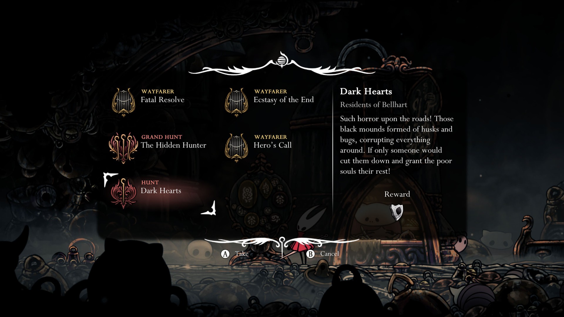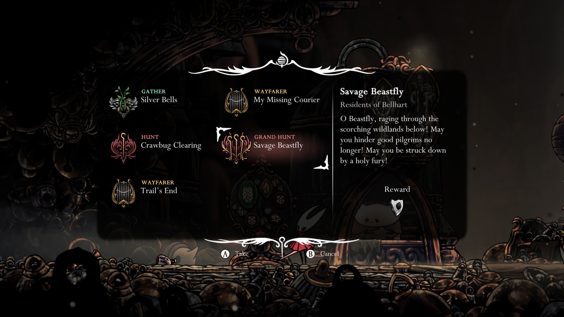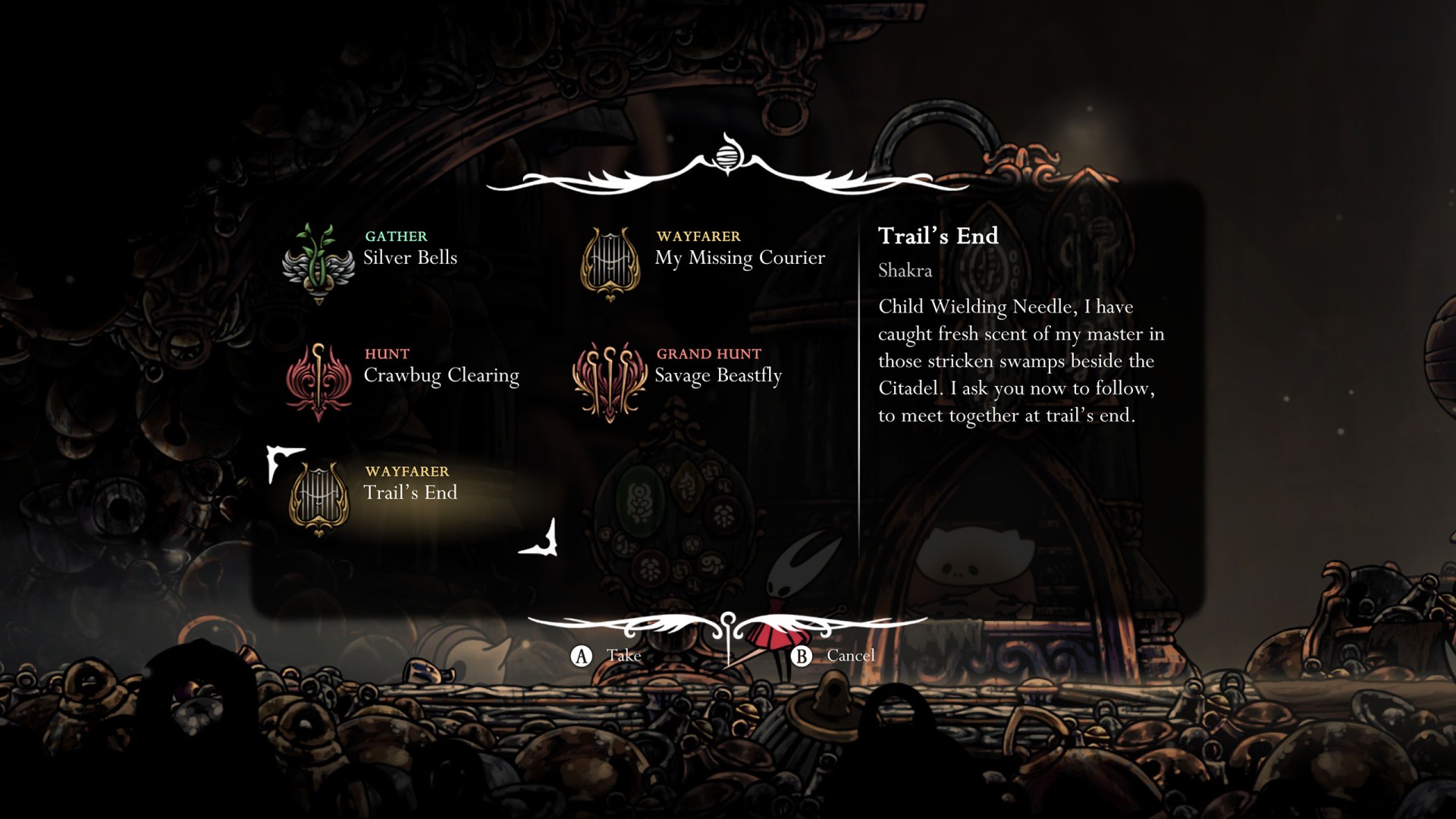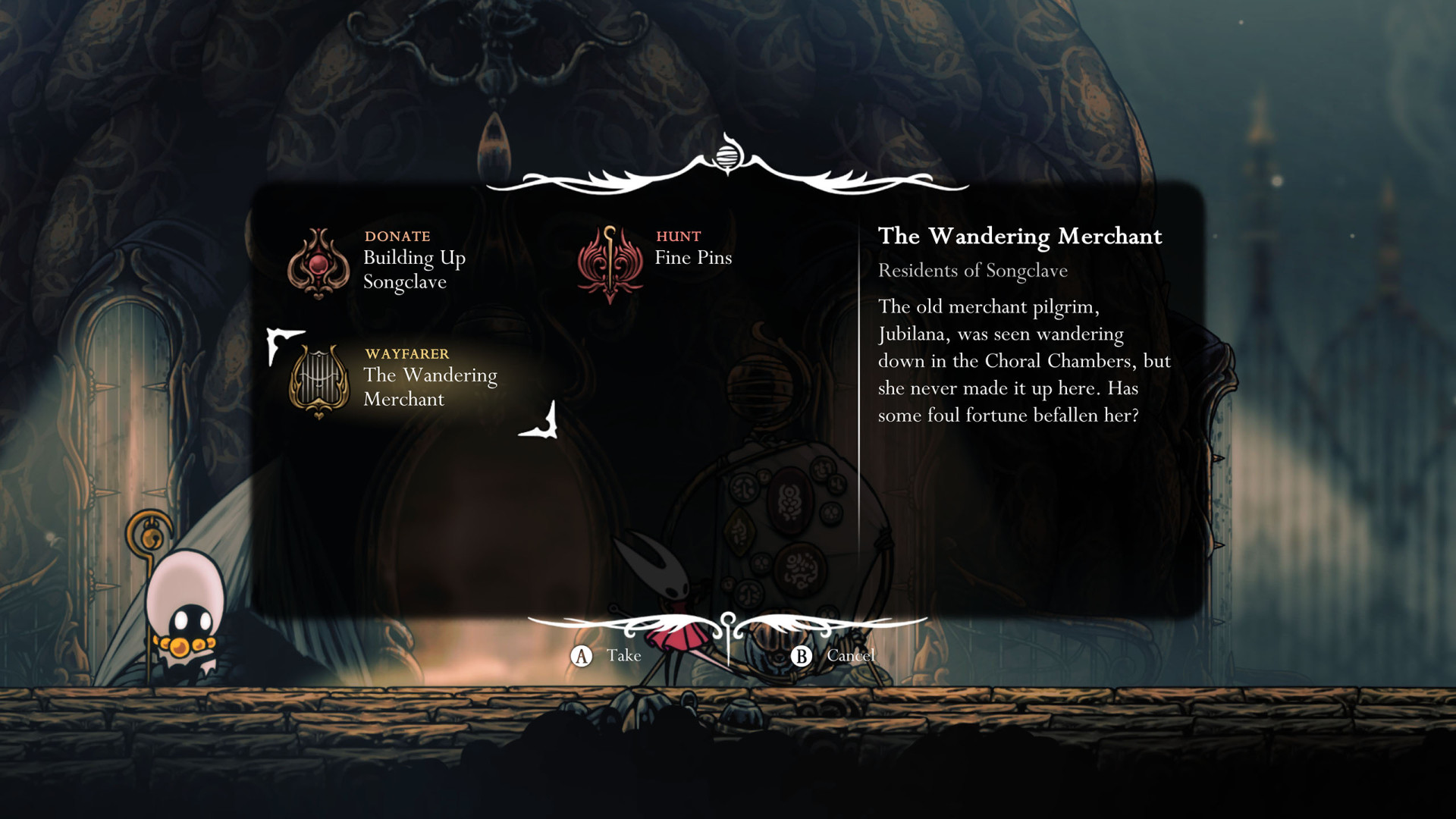 In Hollow Knight: Silksong, "Wishes" are the game's formal side-quest system - offered by NPCs or posted on special boards. They are optional quests but many of them tie into progression.