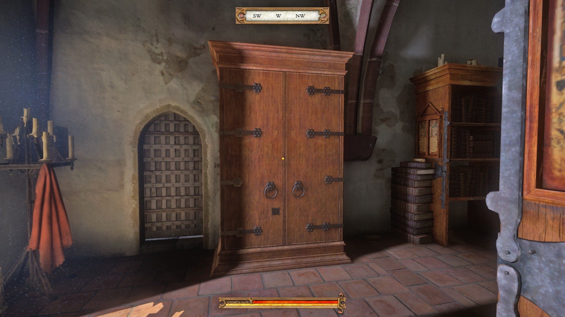 The cabinet of forbidden books will be locked, so I'll have to either get hold of the key, which Brother Librarian carries, or pick the lock.