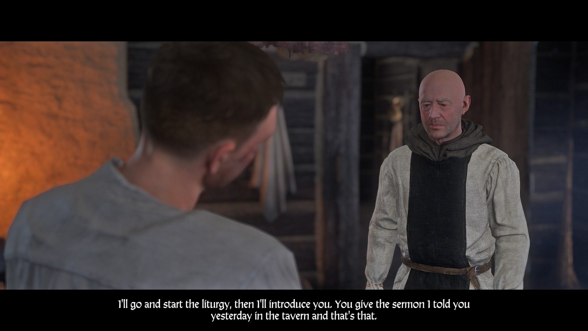 Father Godwin, who could hardly walk after his escapades of the previous night, came up with the insane idea that I should preach from the pulpit for him! He says if I give a sermon about the teachings of the famed preacher Master Jan Hus, he'll tell me what he knows about Lubosh.