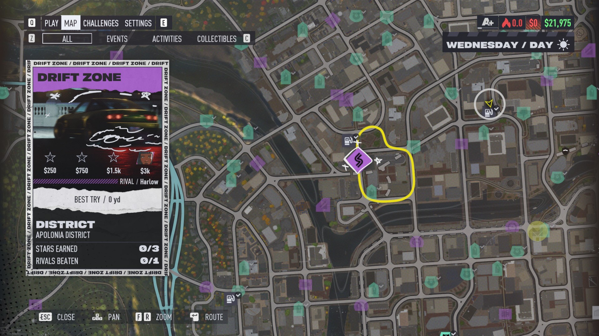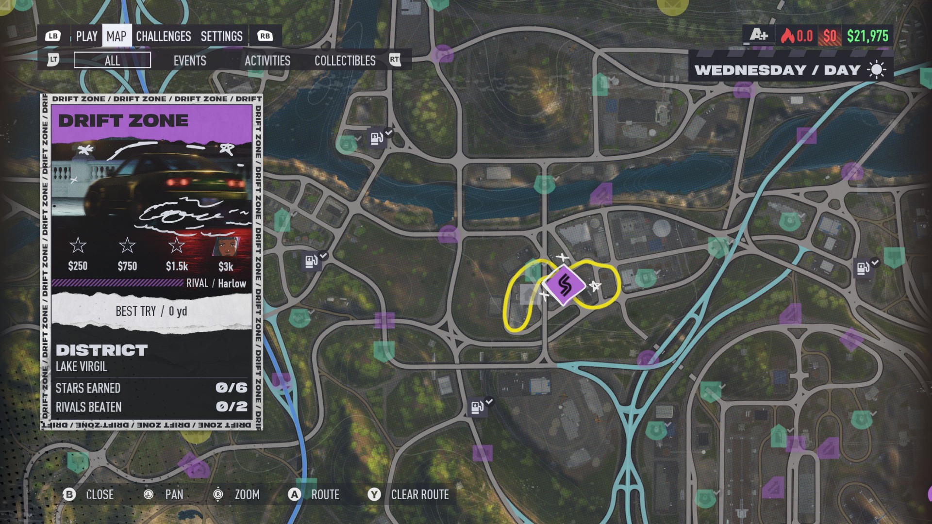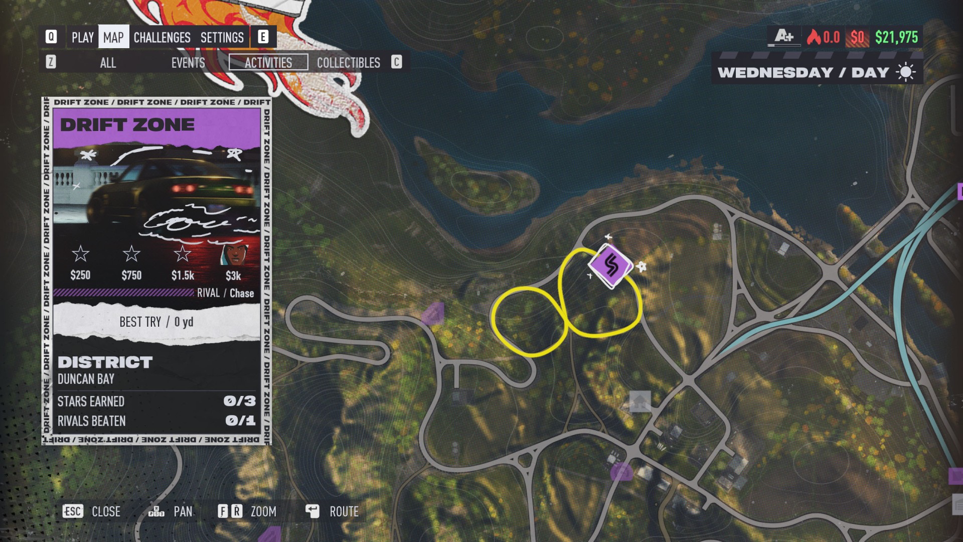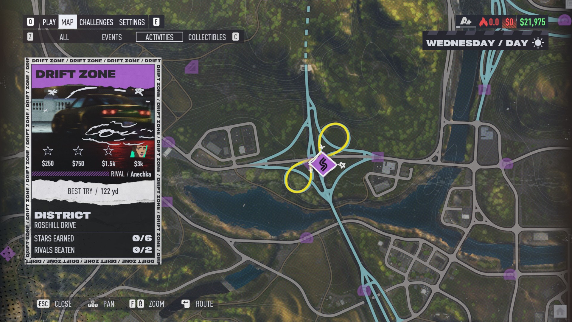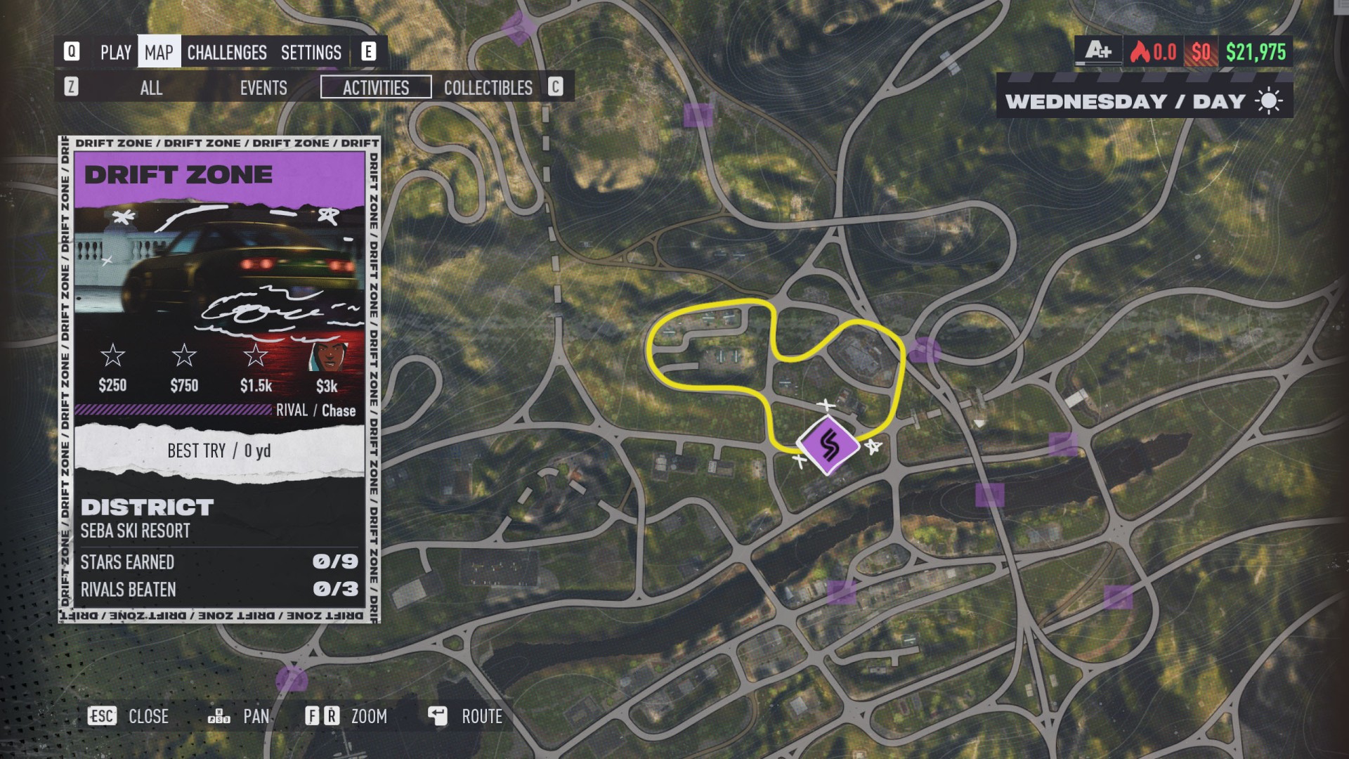 Drift Zones are special routes, sometimes taking the form of closed loops and sometimes they are open sections of road, where you have to drive a sufficient amount of the total route drifting. You have a limited amount of time to accomplish this. Depending on the distance you cover, you will be rated on a scale of 1 to 3 stars, and you will also receive a certain amount of cash ($250 / $750 / $1,500). There is also an additional level of difficulty, above the third star, the so-called "Rival" which guarantees the biggest cash grab ($3000).