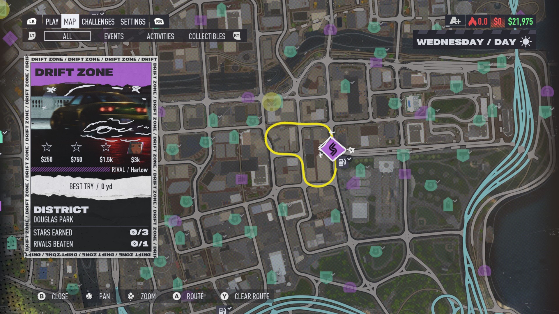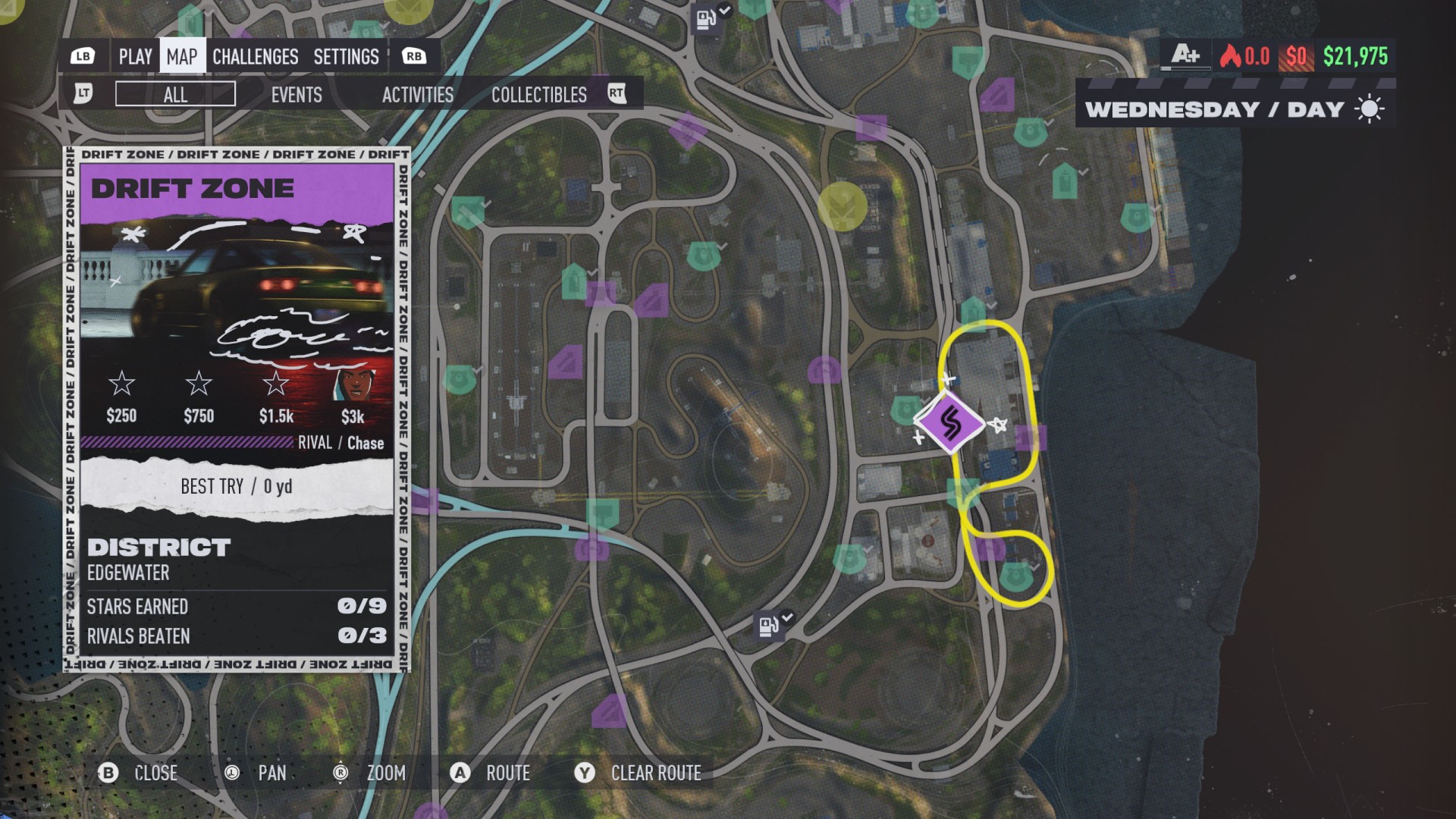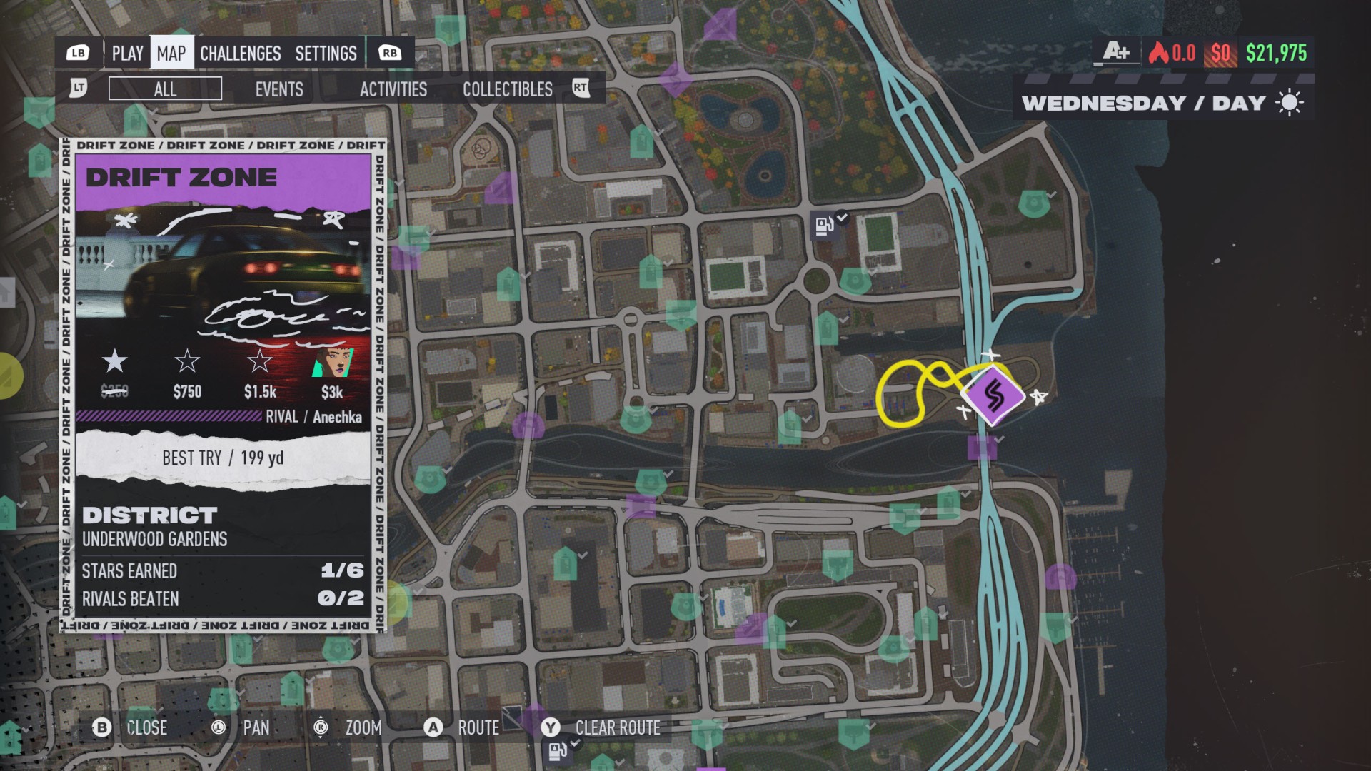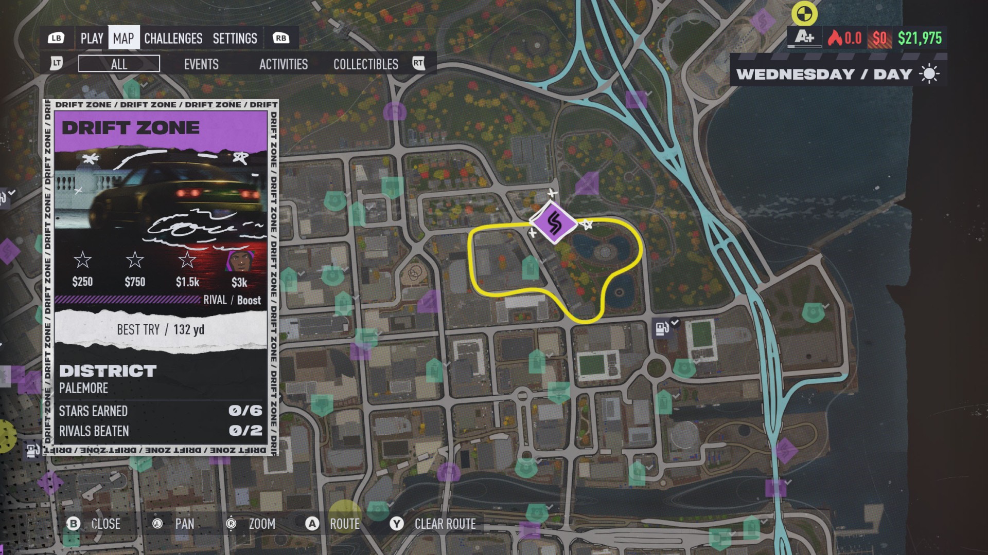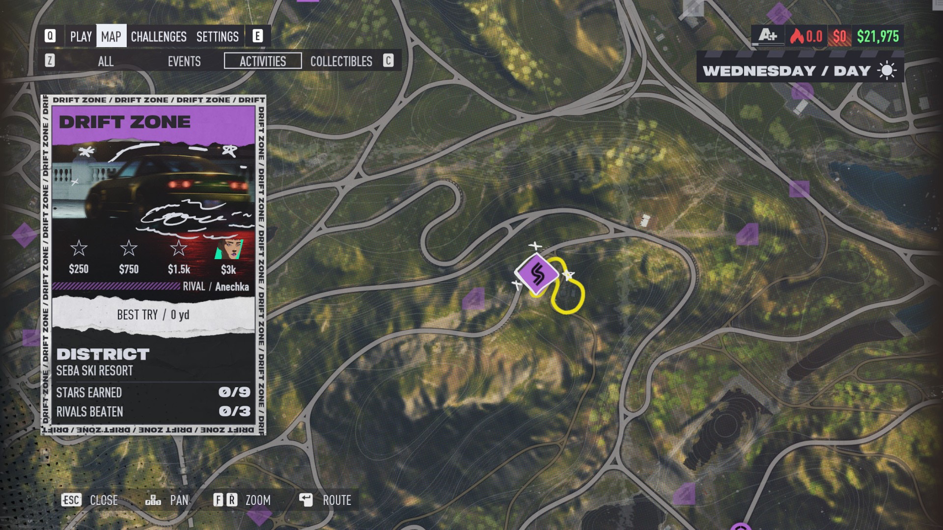 Drift Zones are special routes, sometimes taking the form of closed loops and sometimes they are open sections of road, where you have to drive a sufficient amount of the total route drifting. You have a limited amount of time to accomplish this. Depending on the distance you cover, you will be rated on a scale of 1 to 3 stars, and you will also receive a certain amount of cash ($250 / $750 / $1,500). There is also an additional level of difficulty, above the third star, the so-called "Rival" which guarantees the biggest cash grab ($3000).