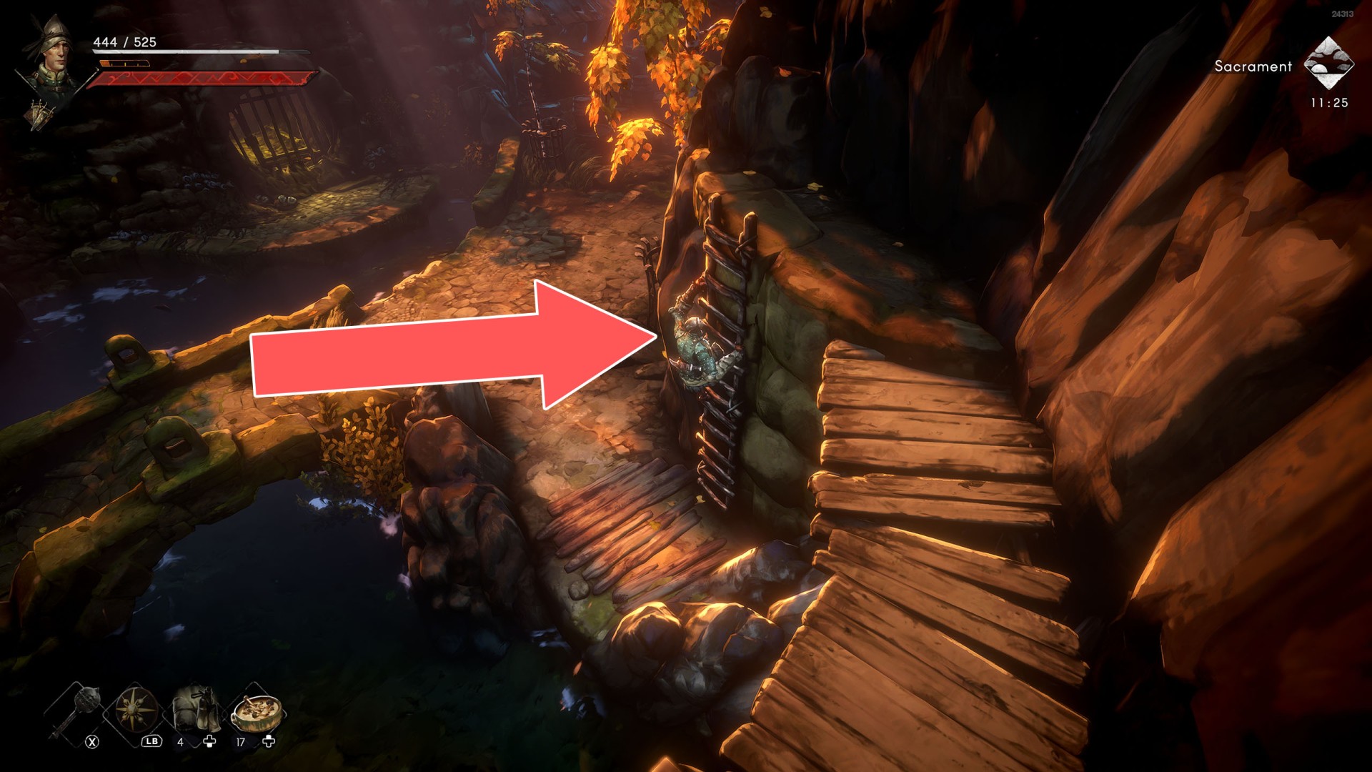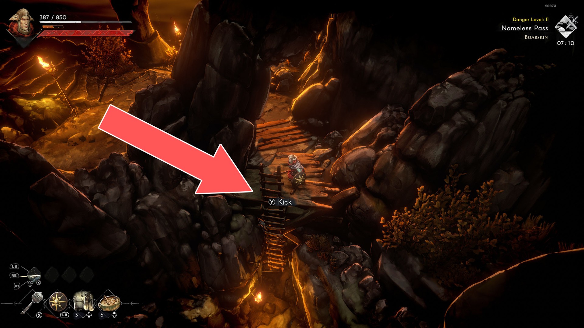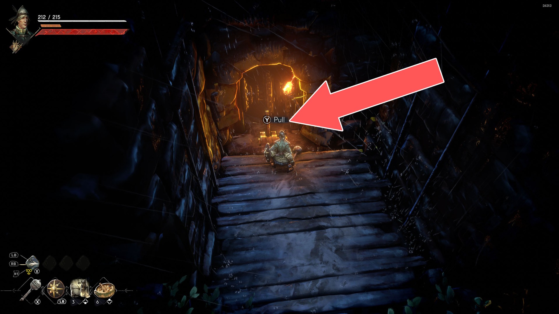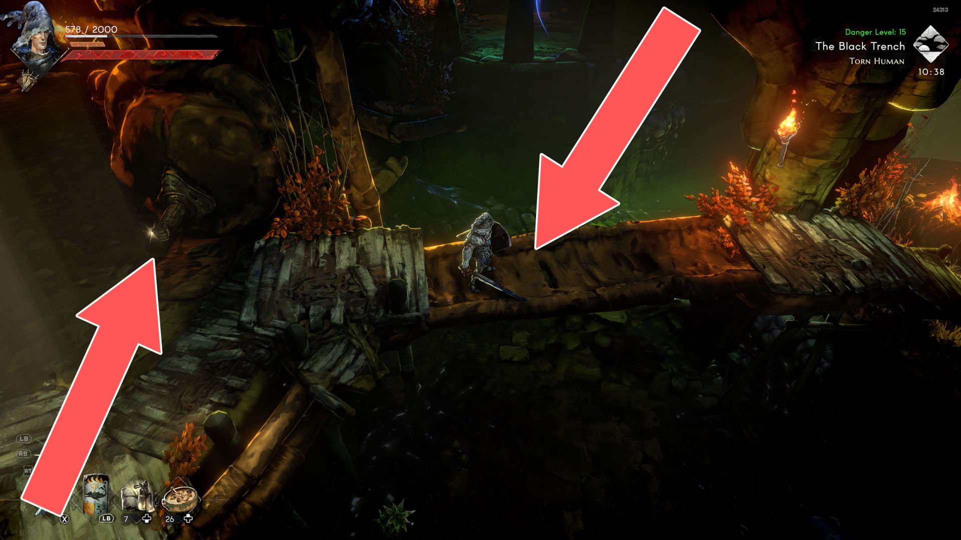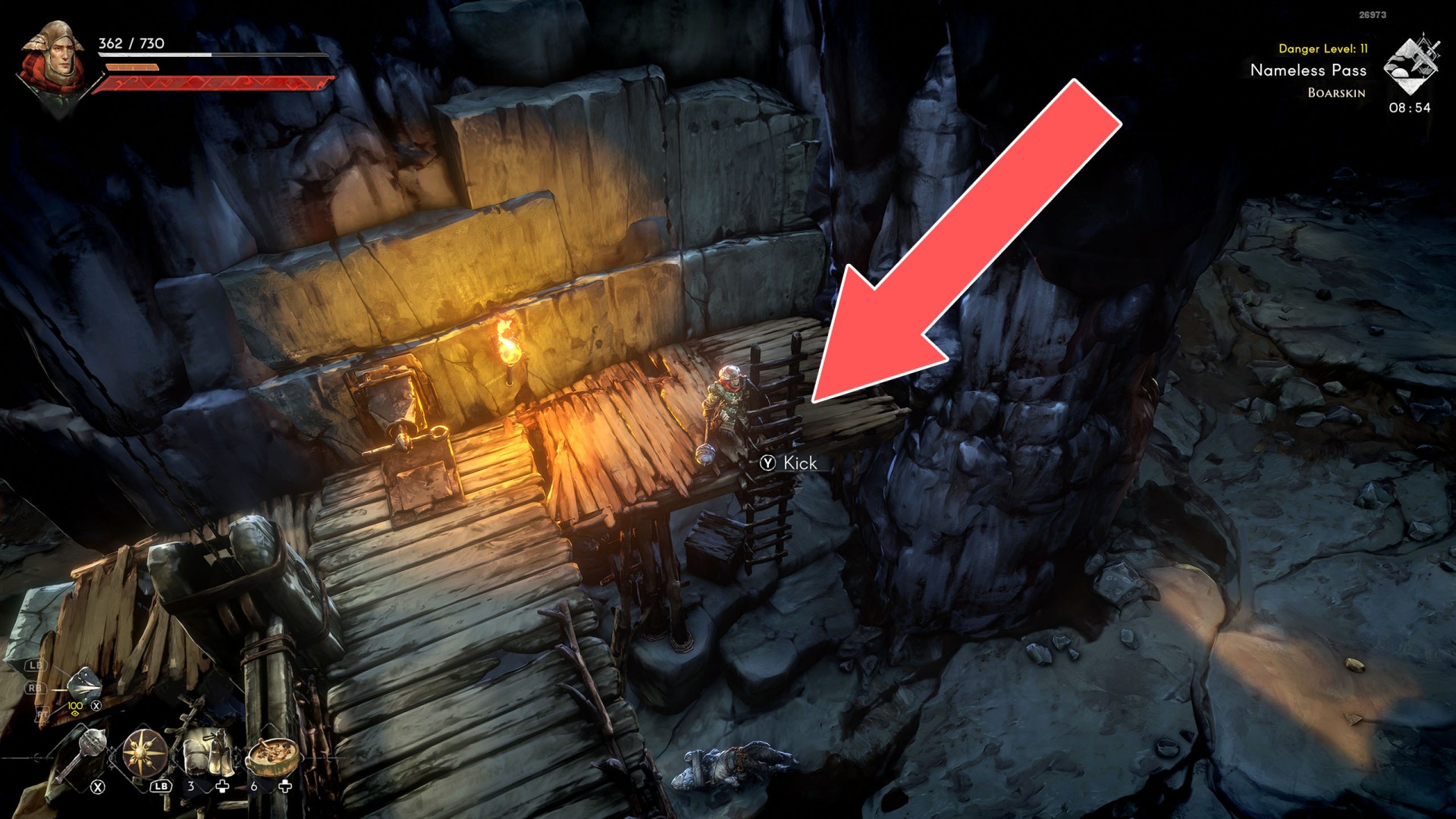 Show the mapYou can use the nearby lever to lower this stone block. The block will descend into the fire below, so before it reaches the bottom, jump off it onto the nearby wooden bridge.