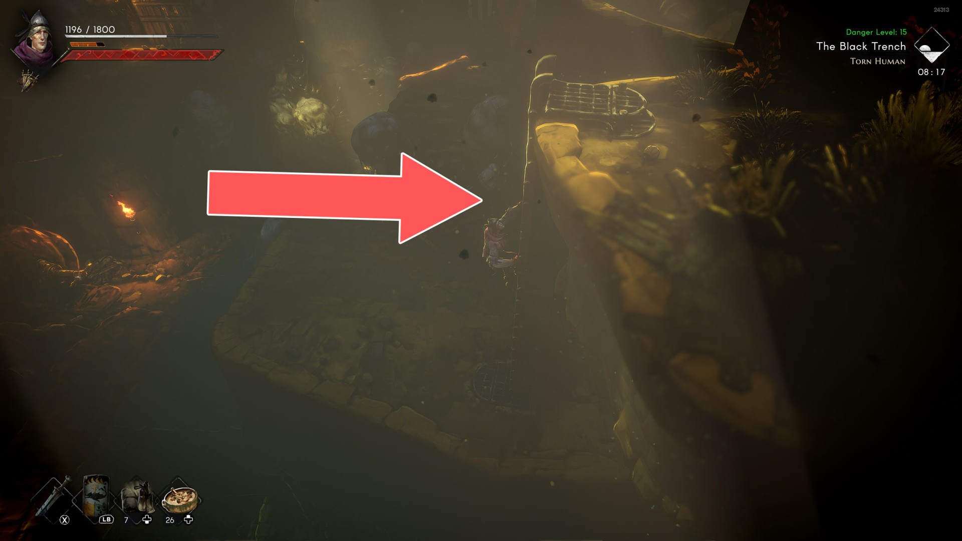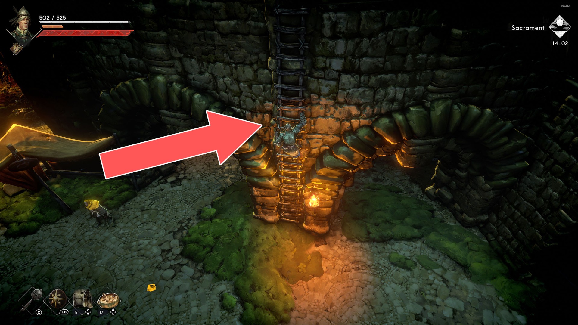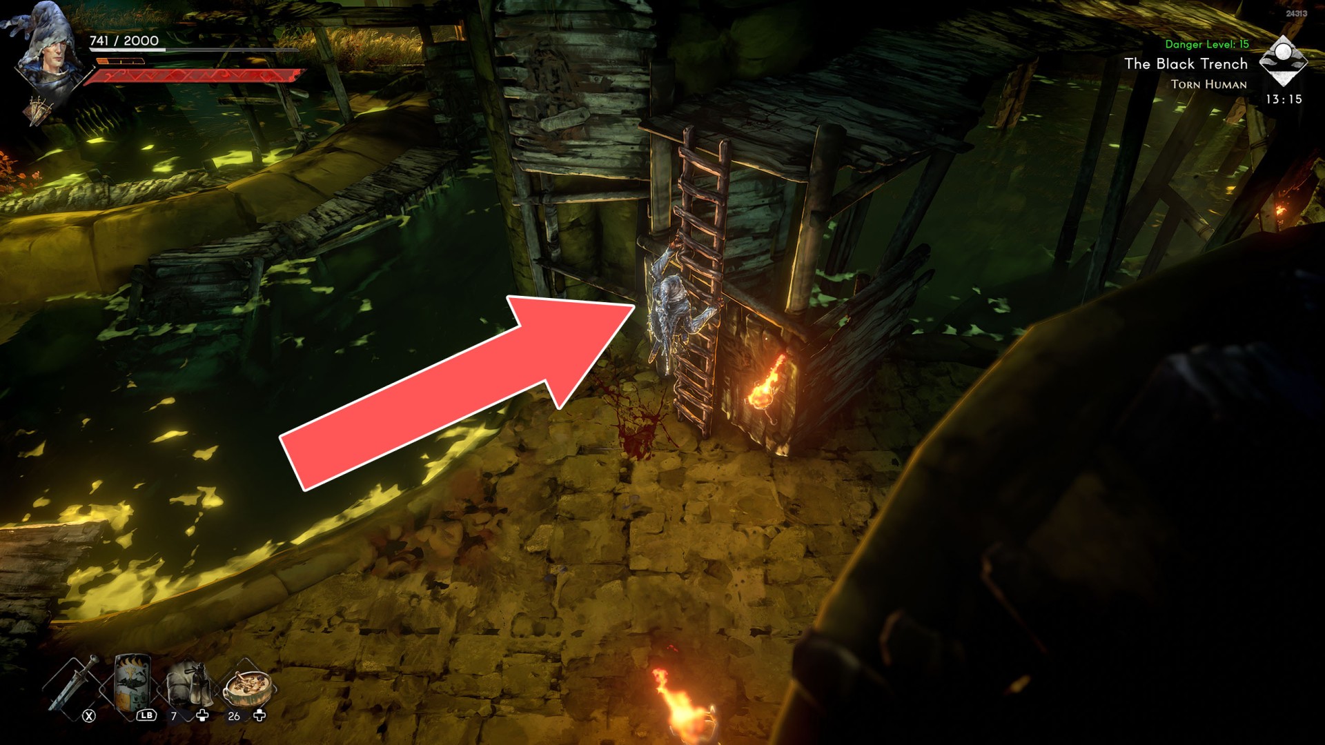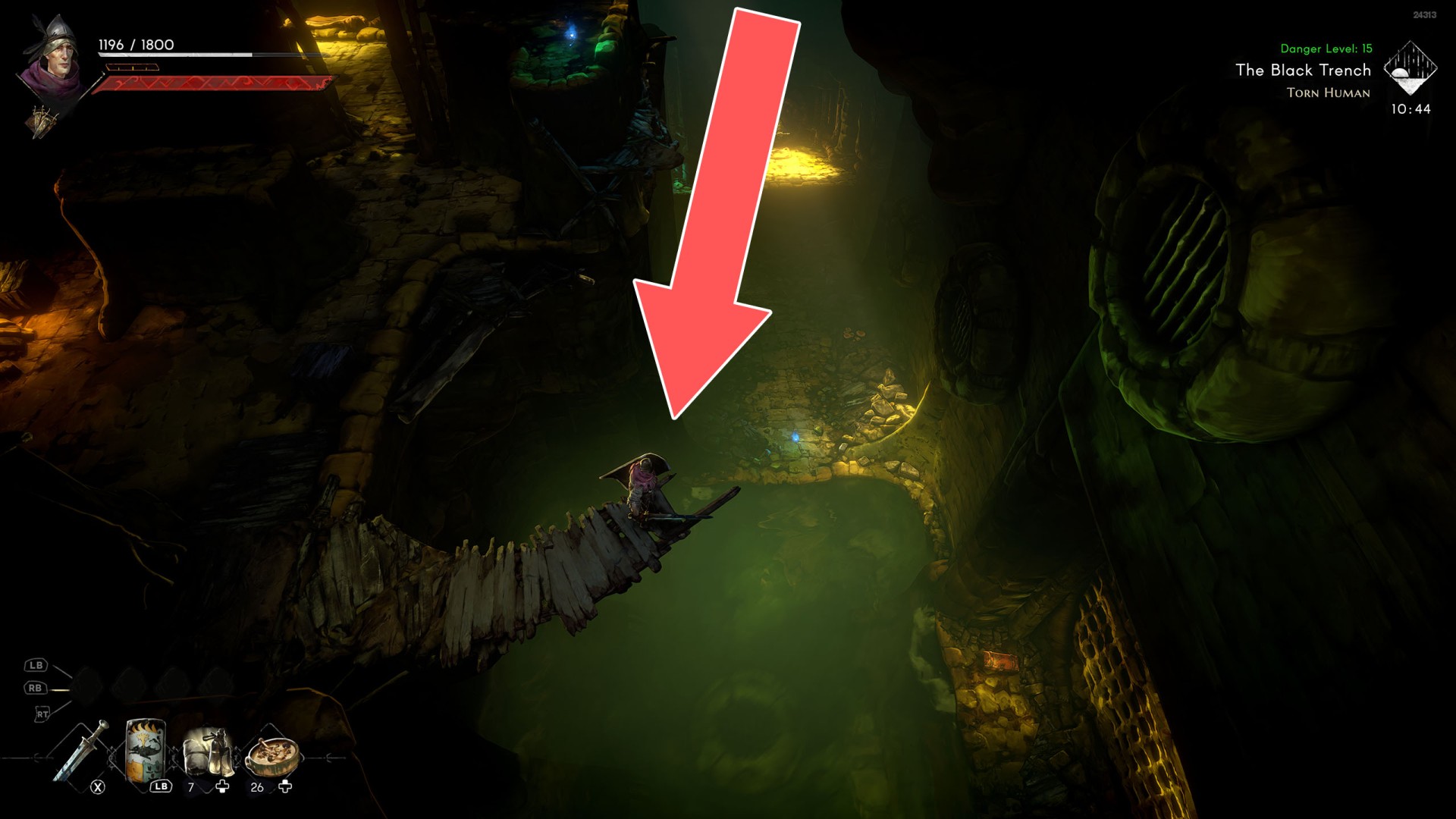 Show the mapYou can use the nearby lever to lower this stone block. The block will descend into the fire below, so before it reaches the bottom, jump off it onto the nearby wooden bridge.