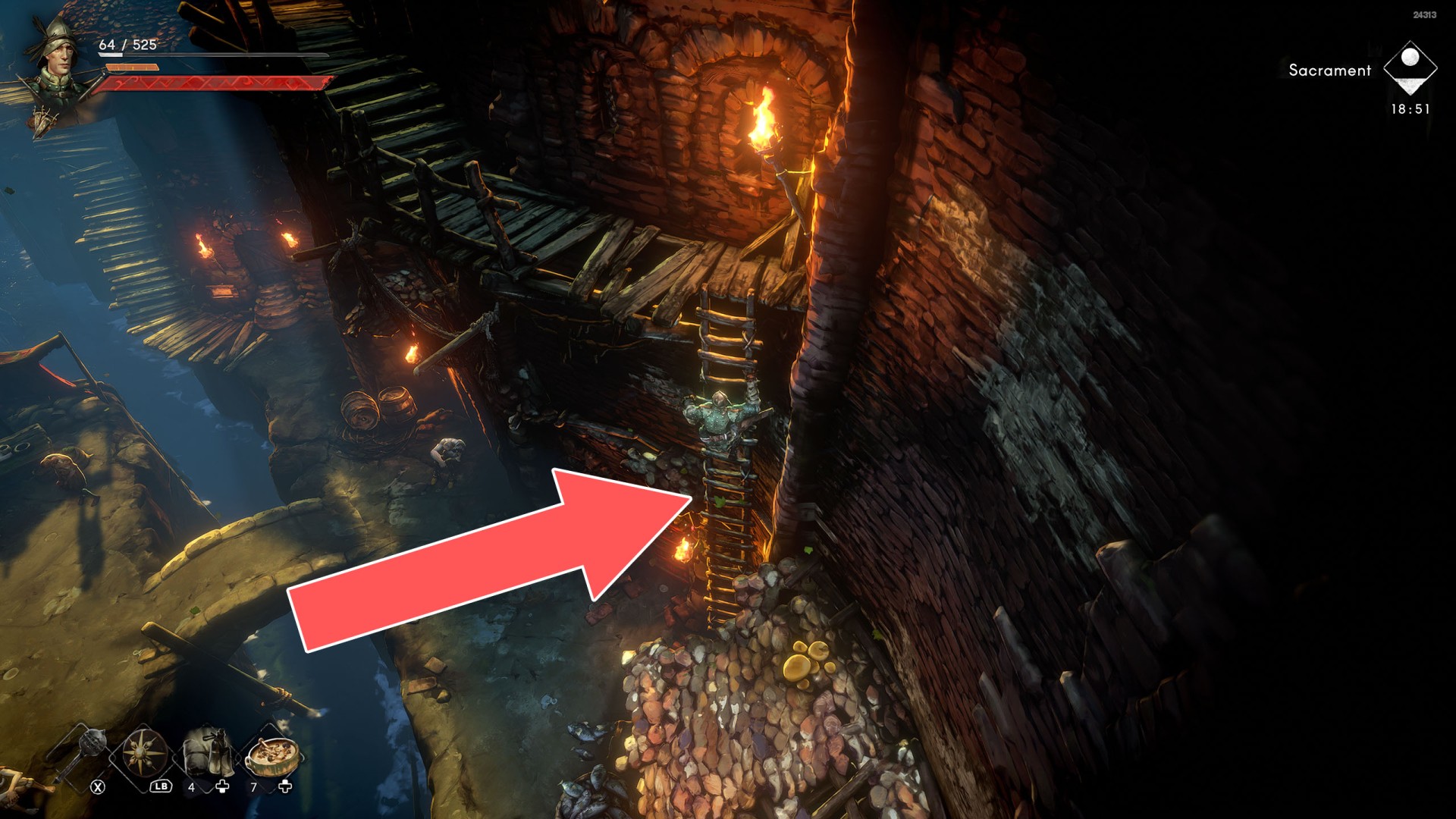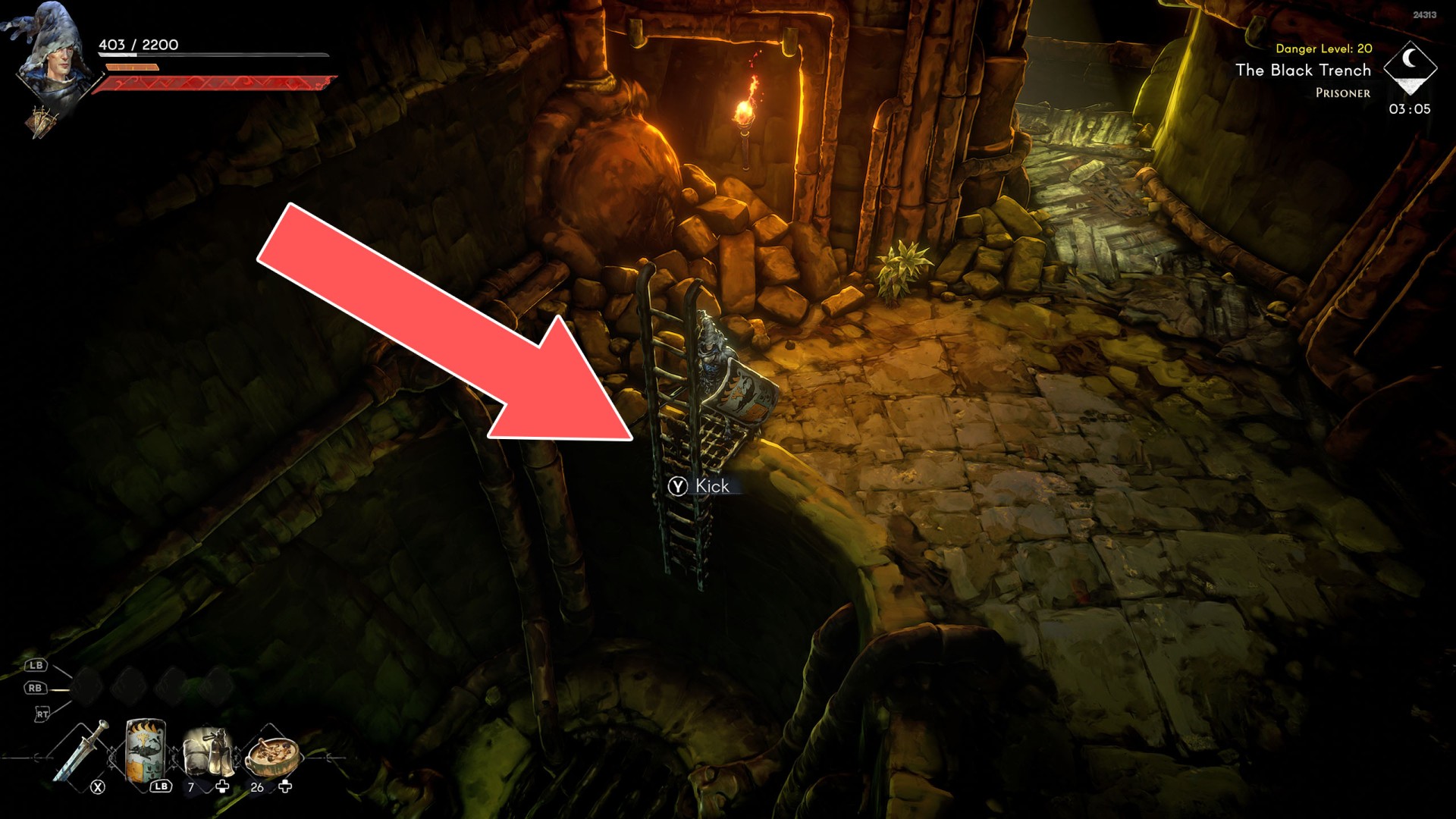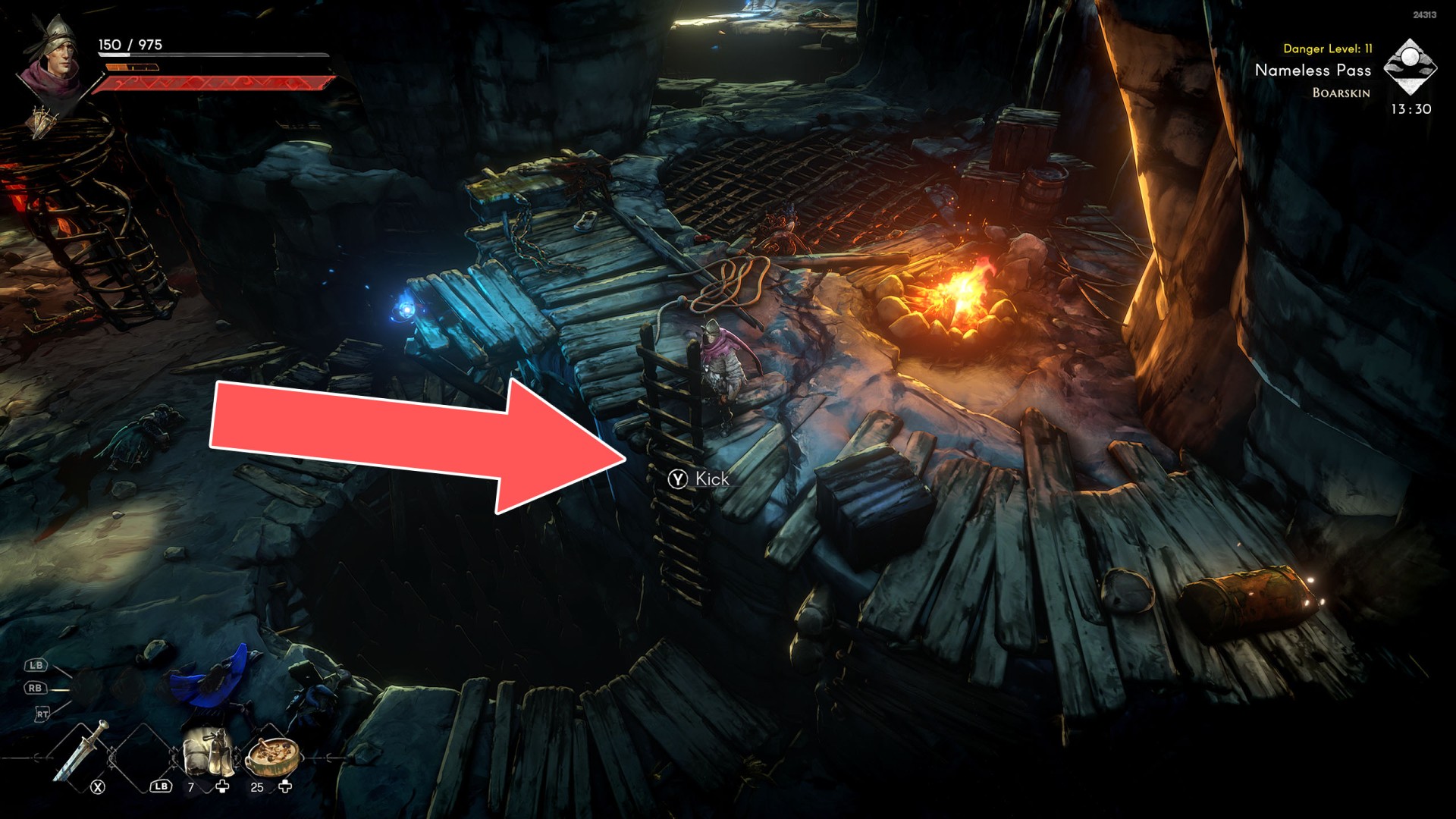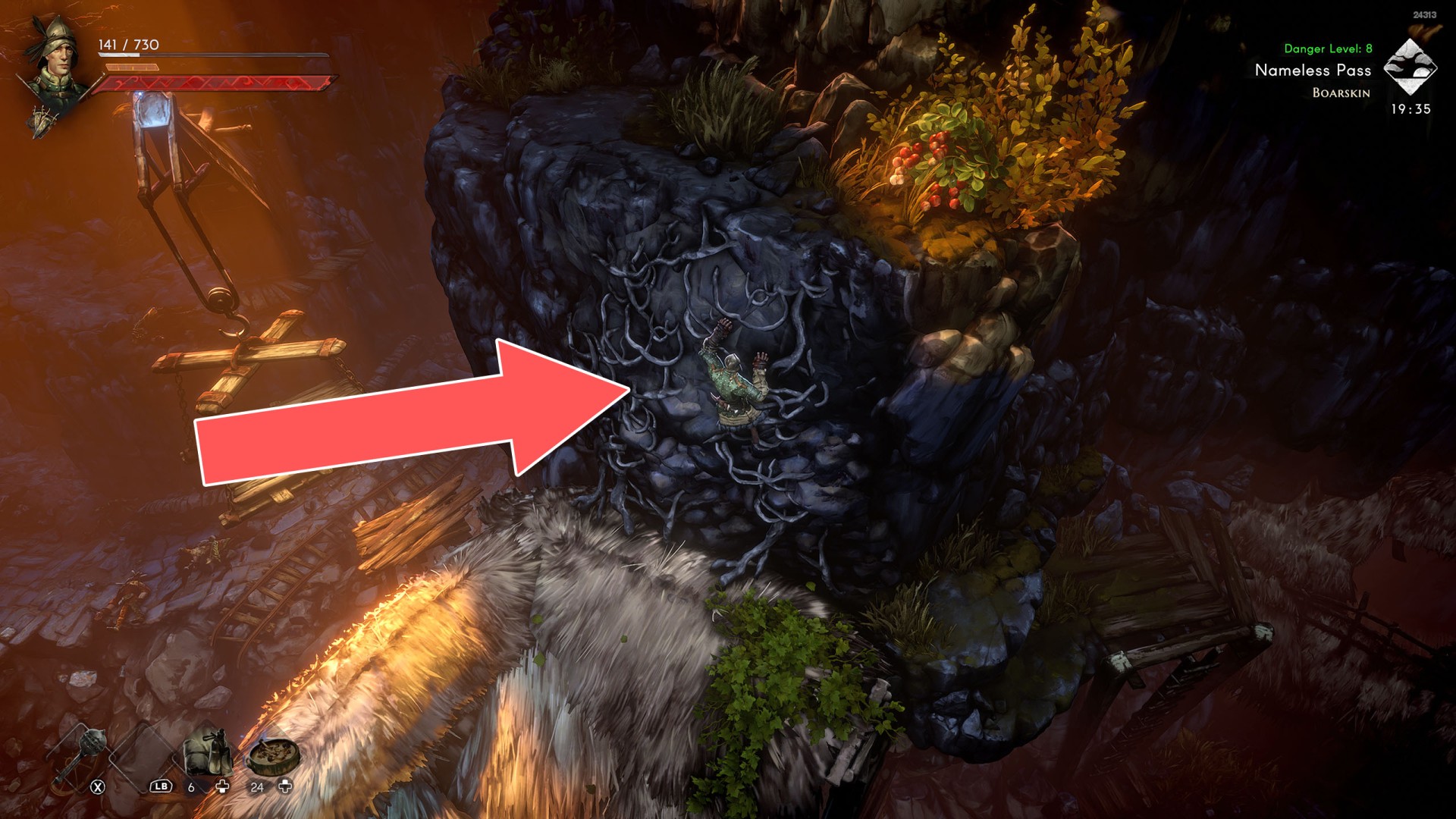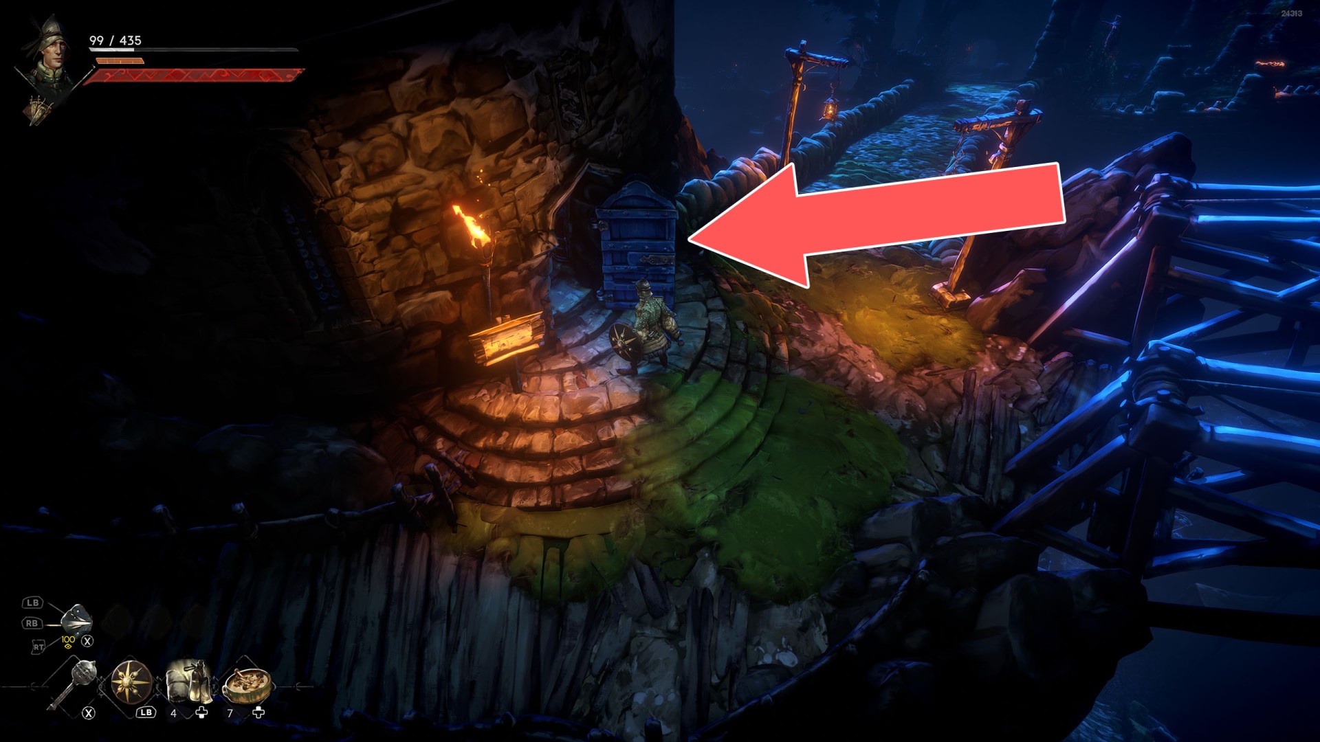 Show the mapYou can use the nearby lever to lower this stone block. The block will descend into the fire below, so before it reaches the bottom, jump off it onto the nearby wooden bridge.