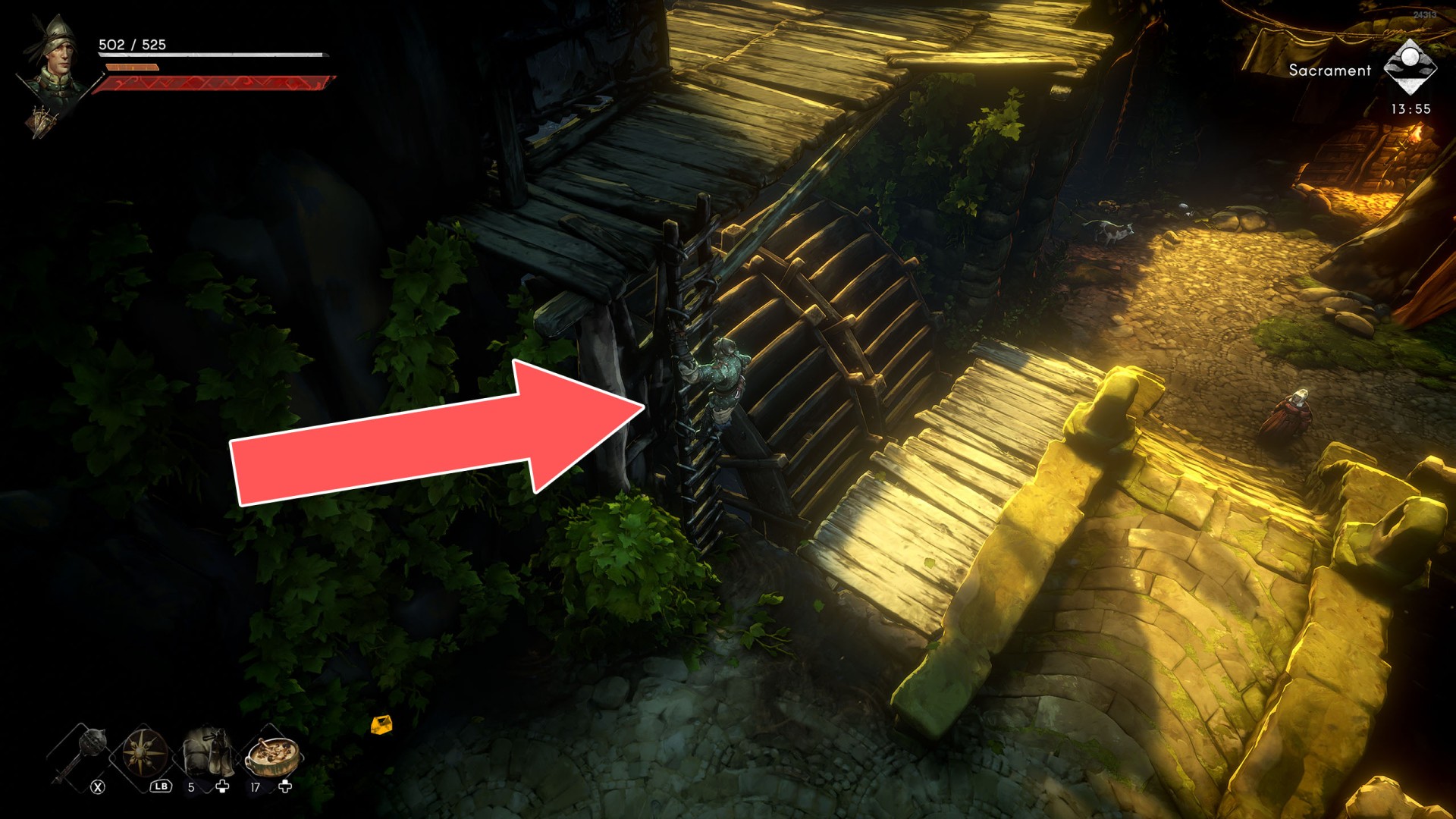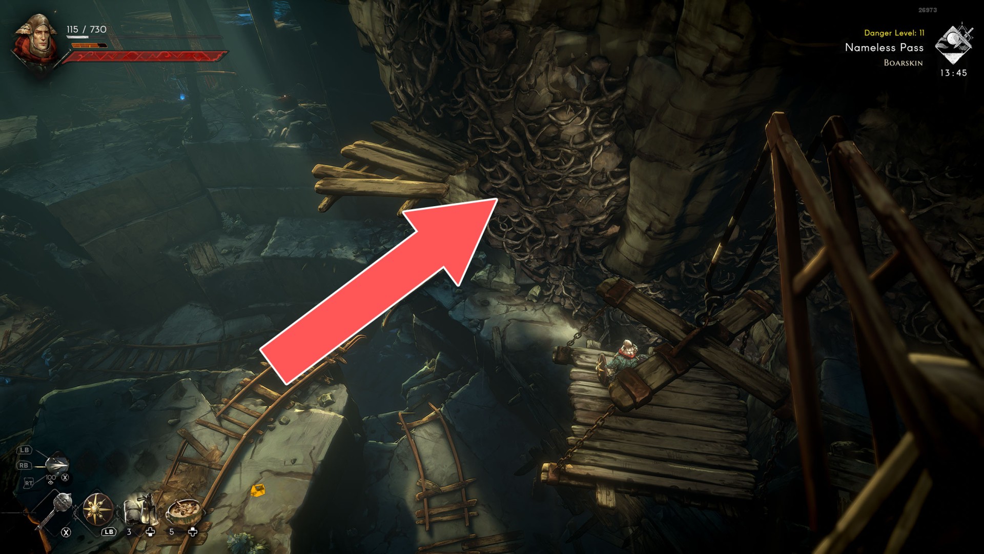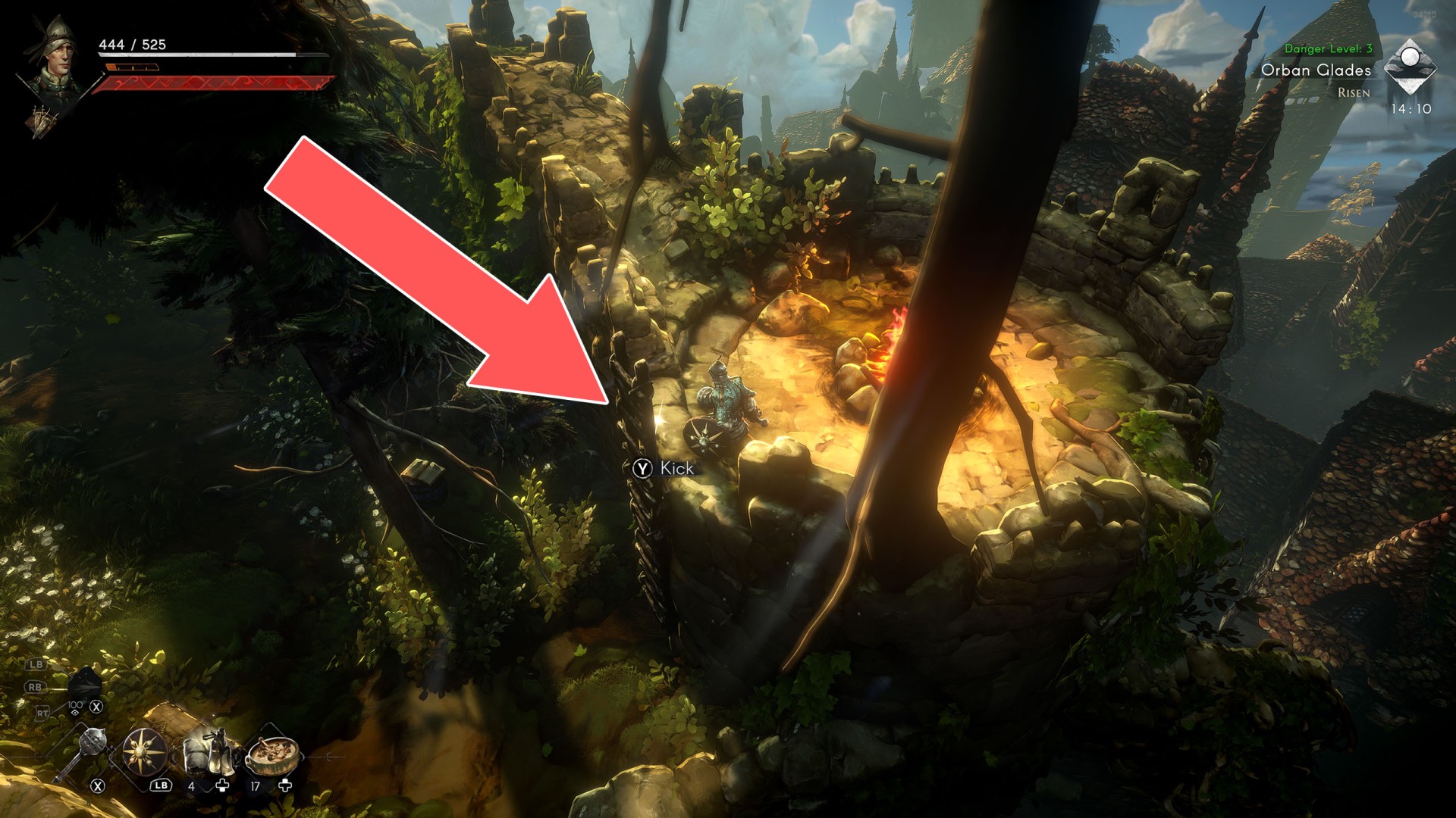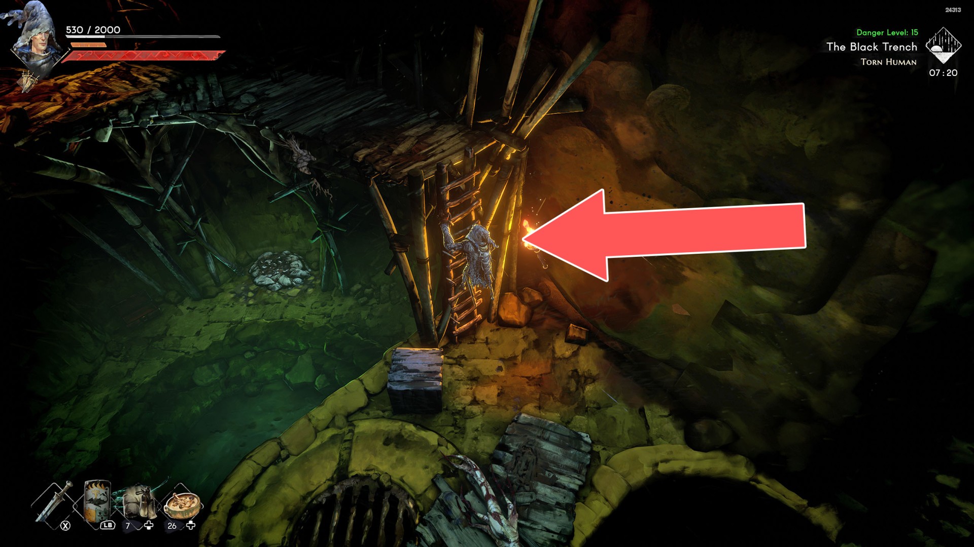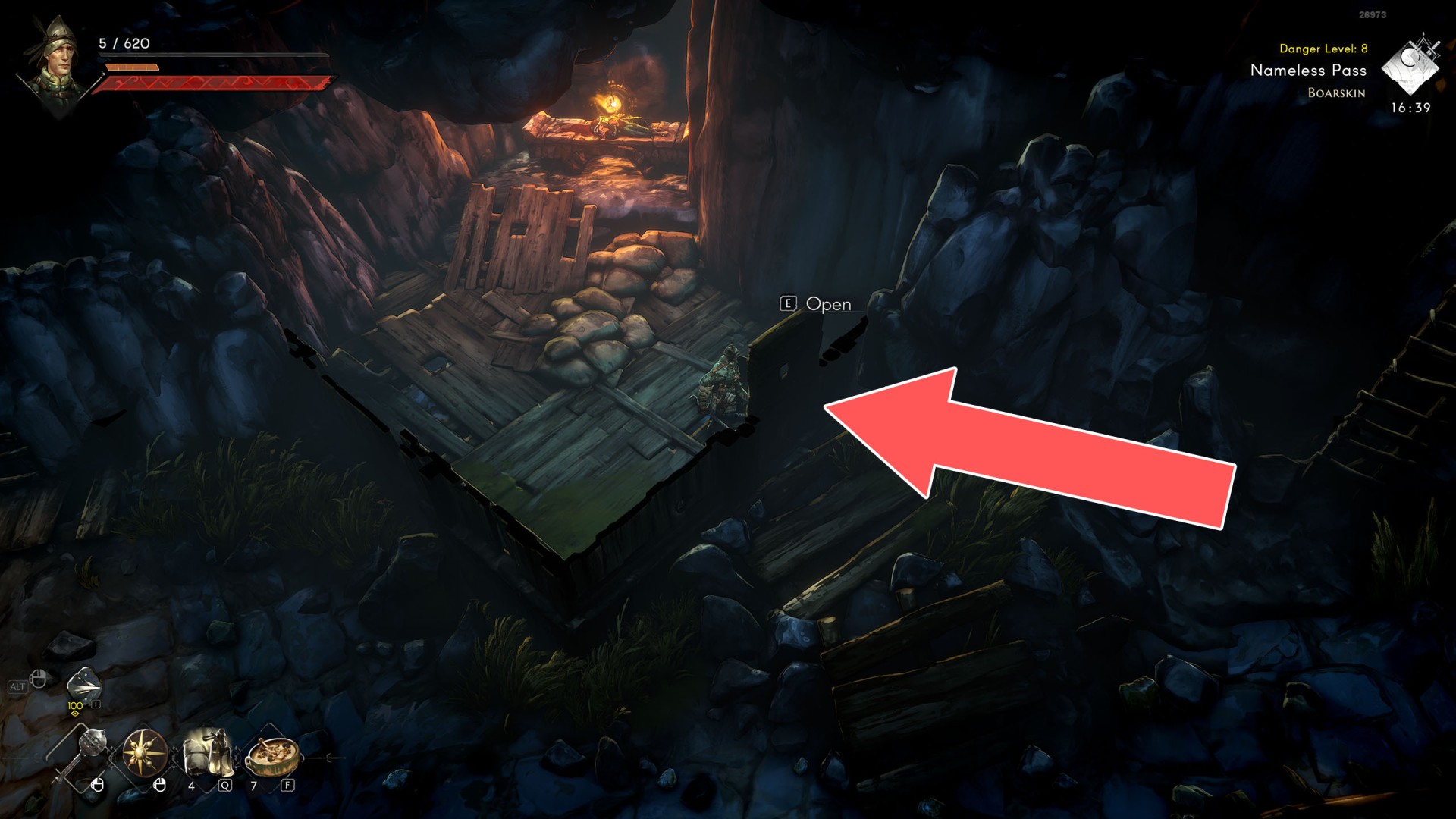 Show the mapYou can use the nearby lever to lower this stone block. The block will descend into the fire below, so before it reaches the bottom, jump off it onto the nearby wooden bridge.