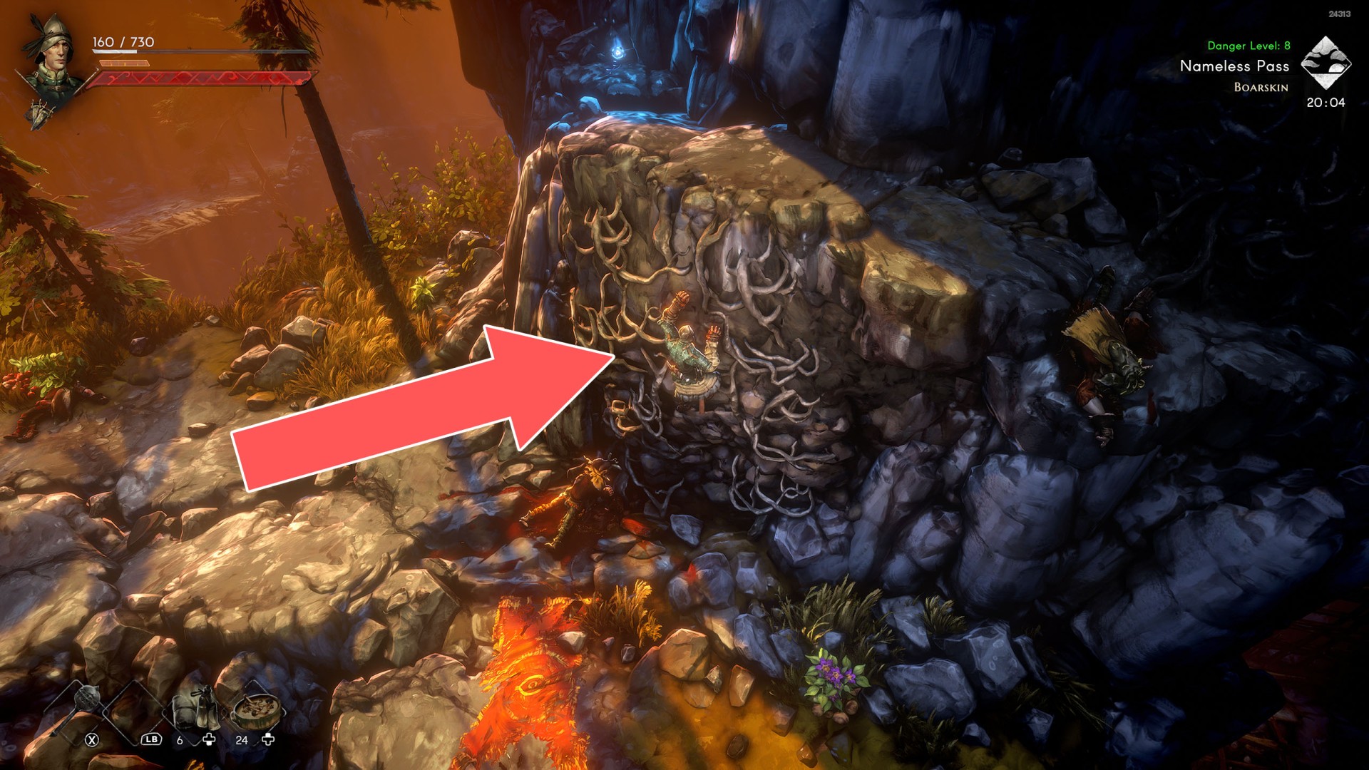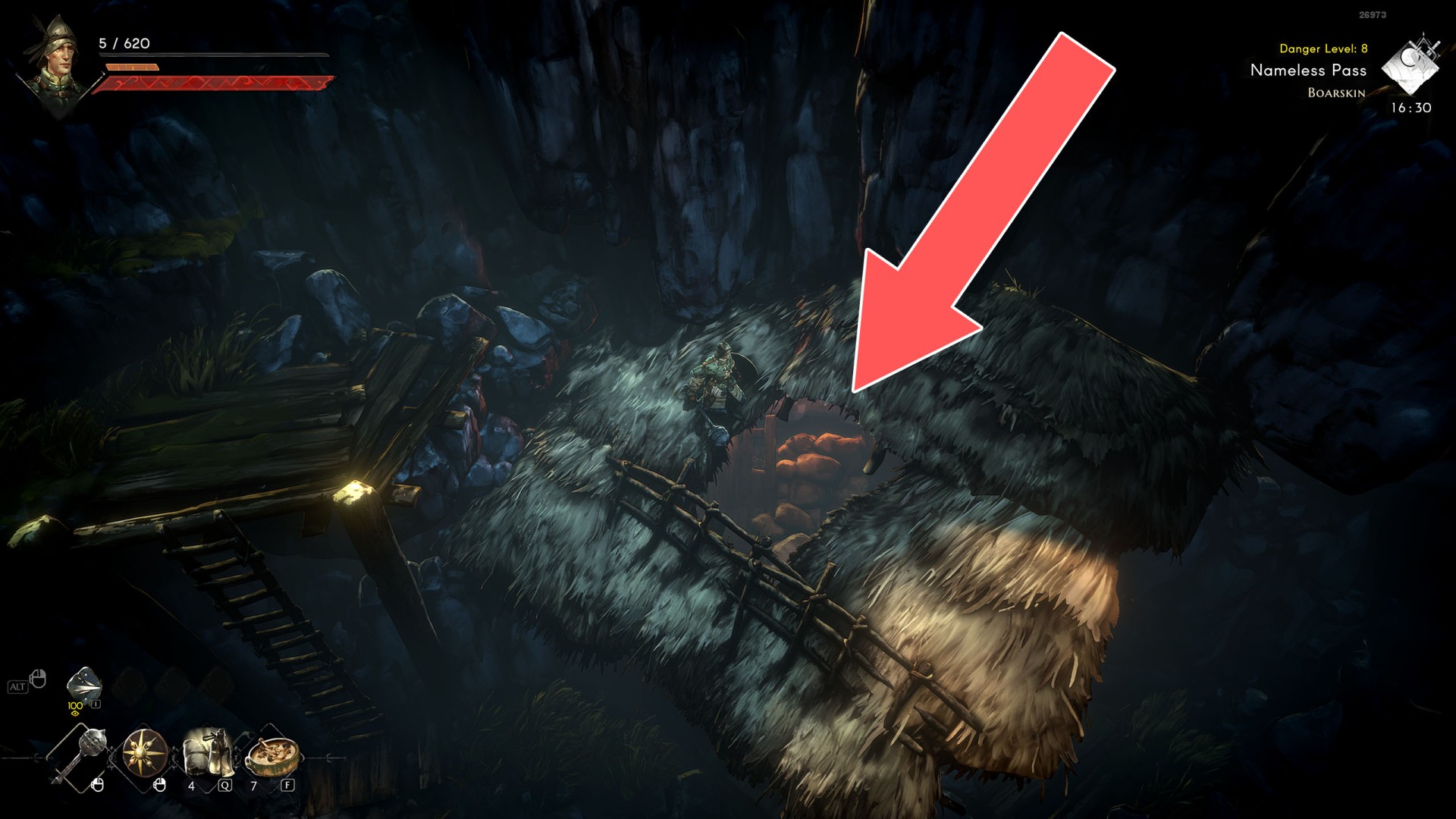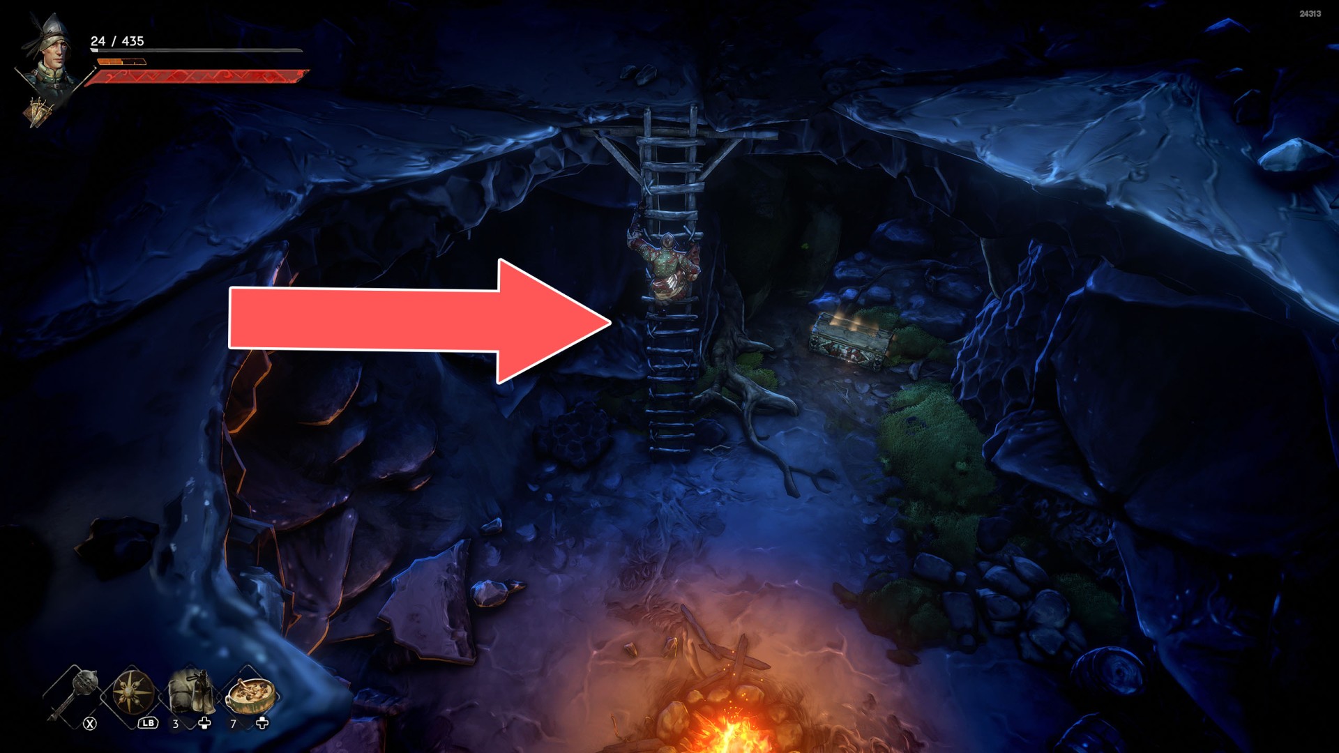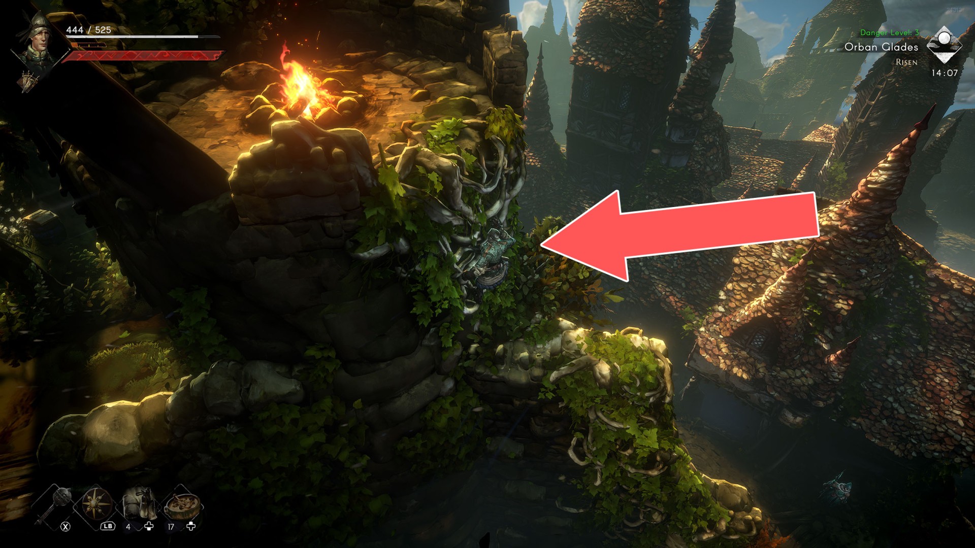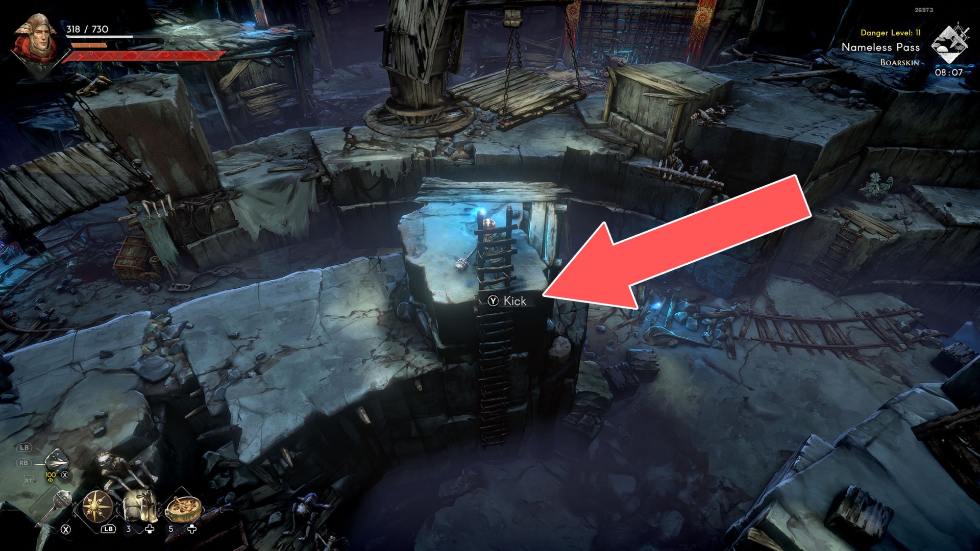 Show the mapYou can use the nearby lever to lower this stone block. The block will descend into the fire below, so before it reaches the bottom, jump off it onto the nearby wooden bridge.