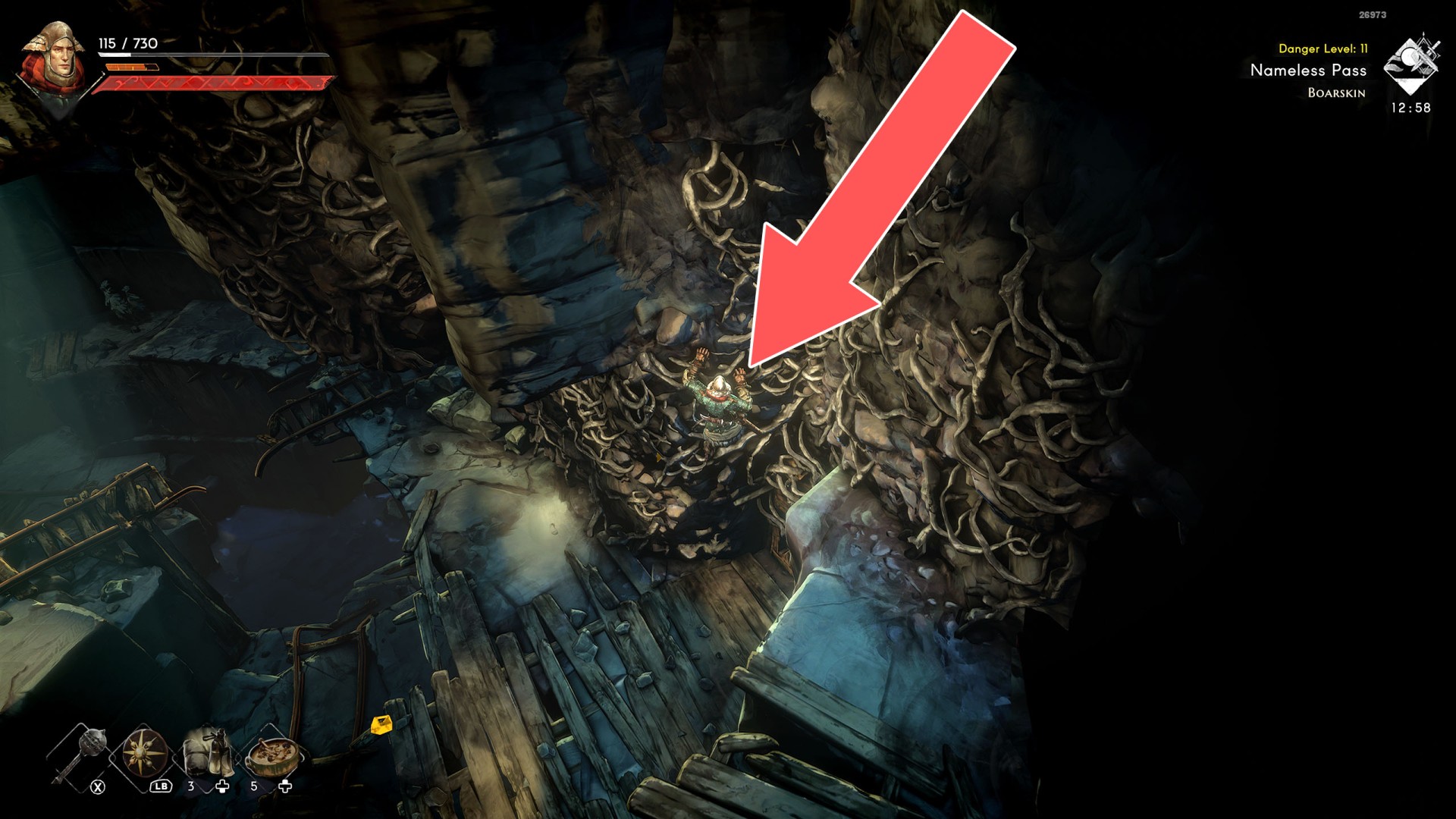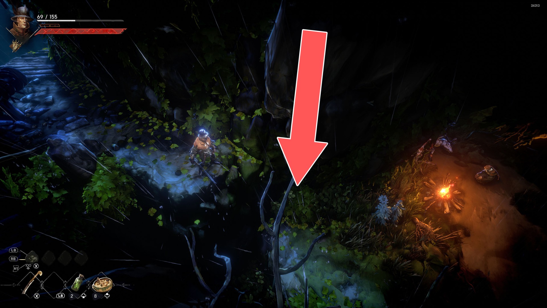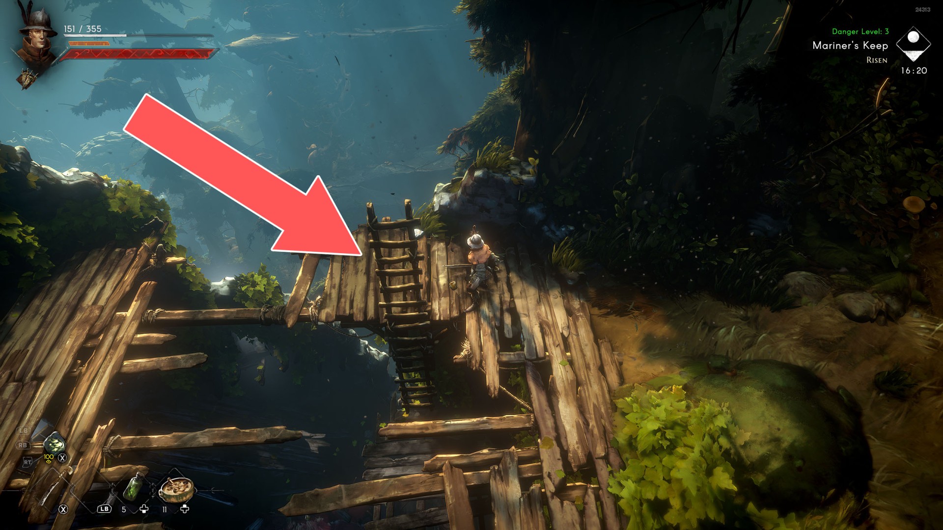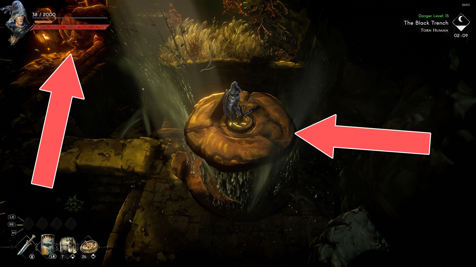 Show the mapYou can use the nearby lever to lower this stone block. The block will descend into the fire below, so before it reaches the bottom, jump off it onto the nearby wooden bridge.