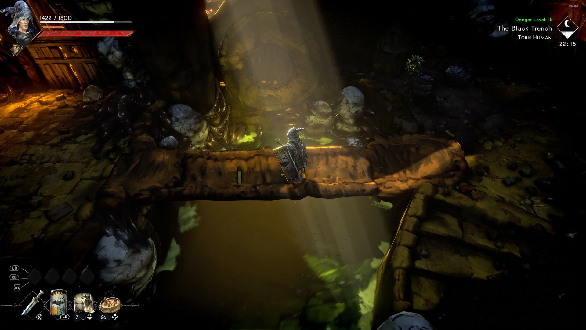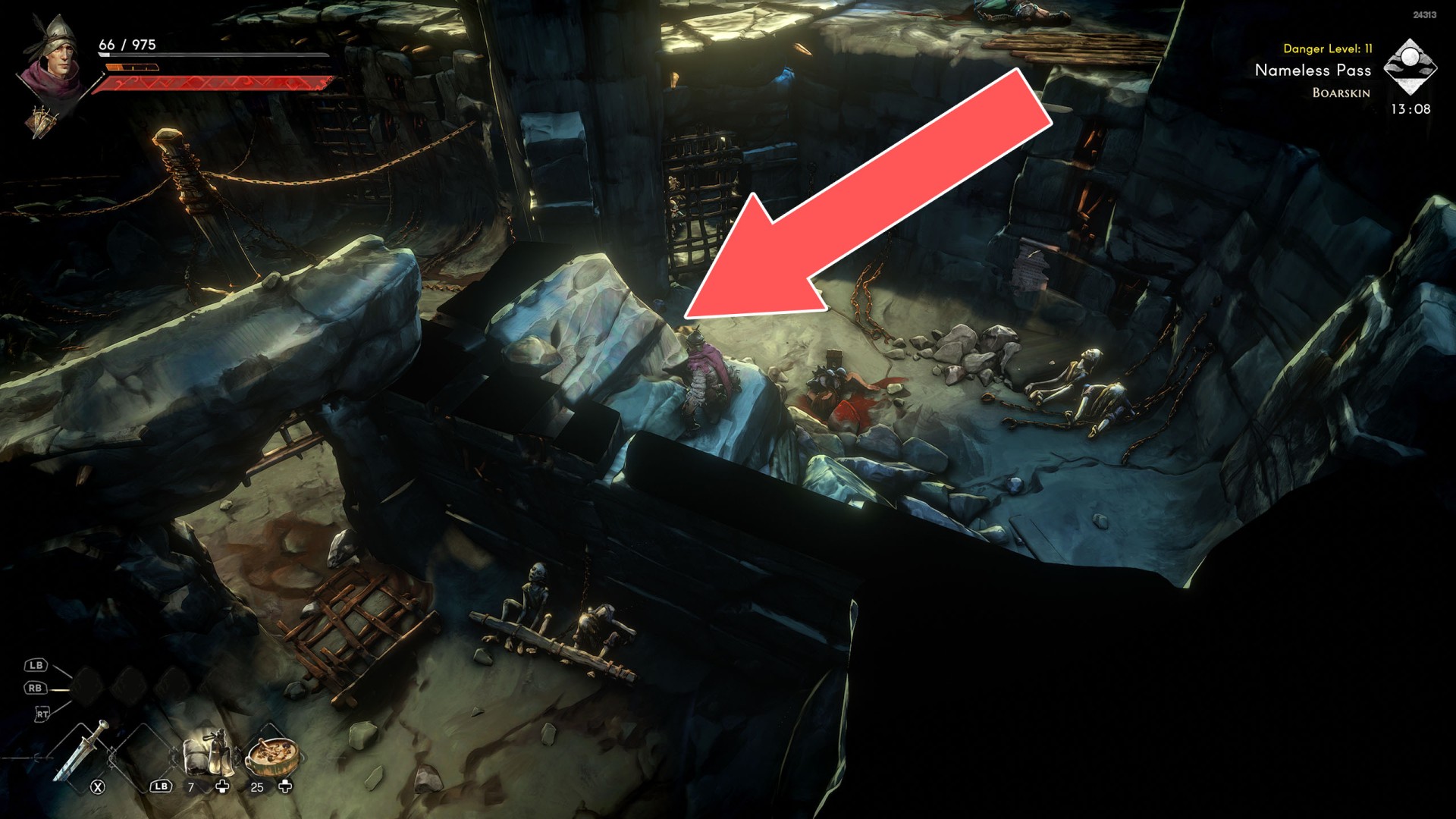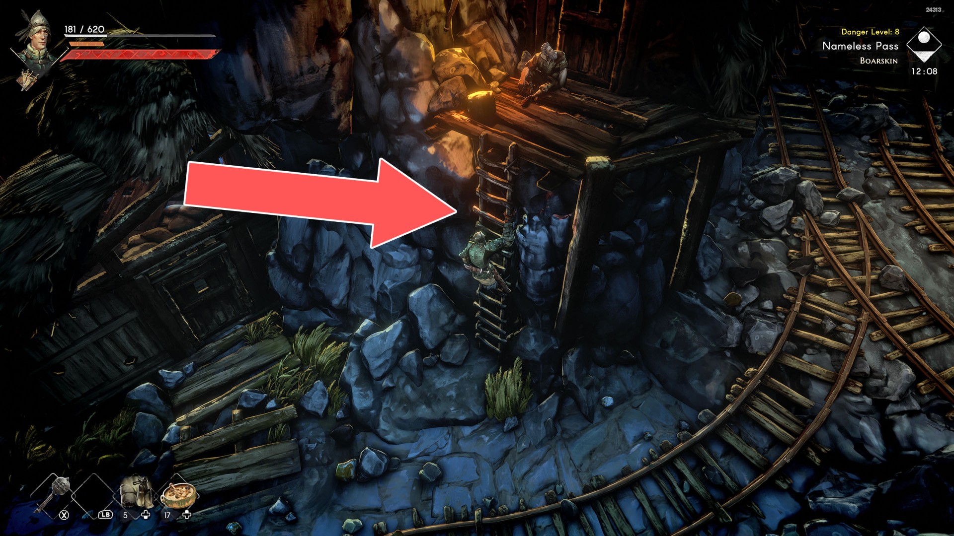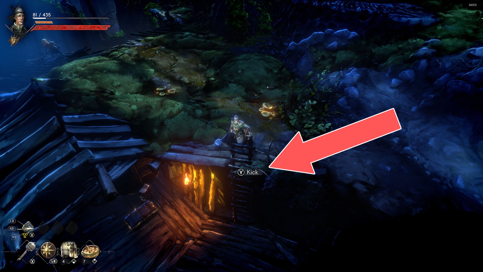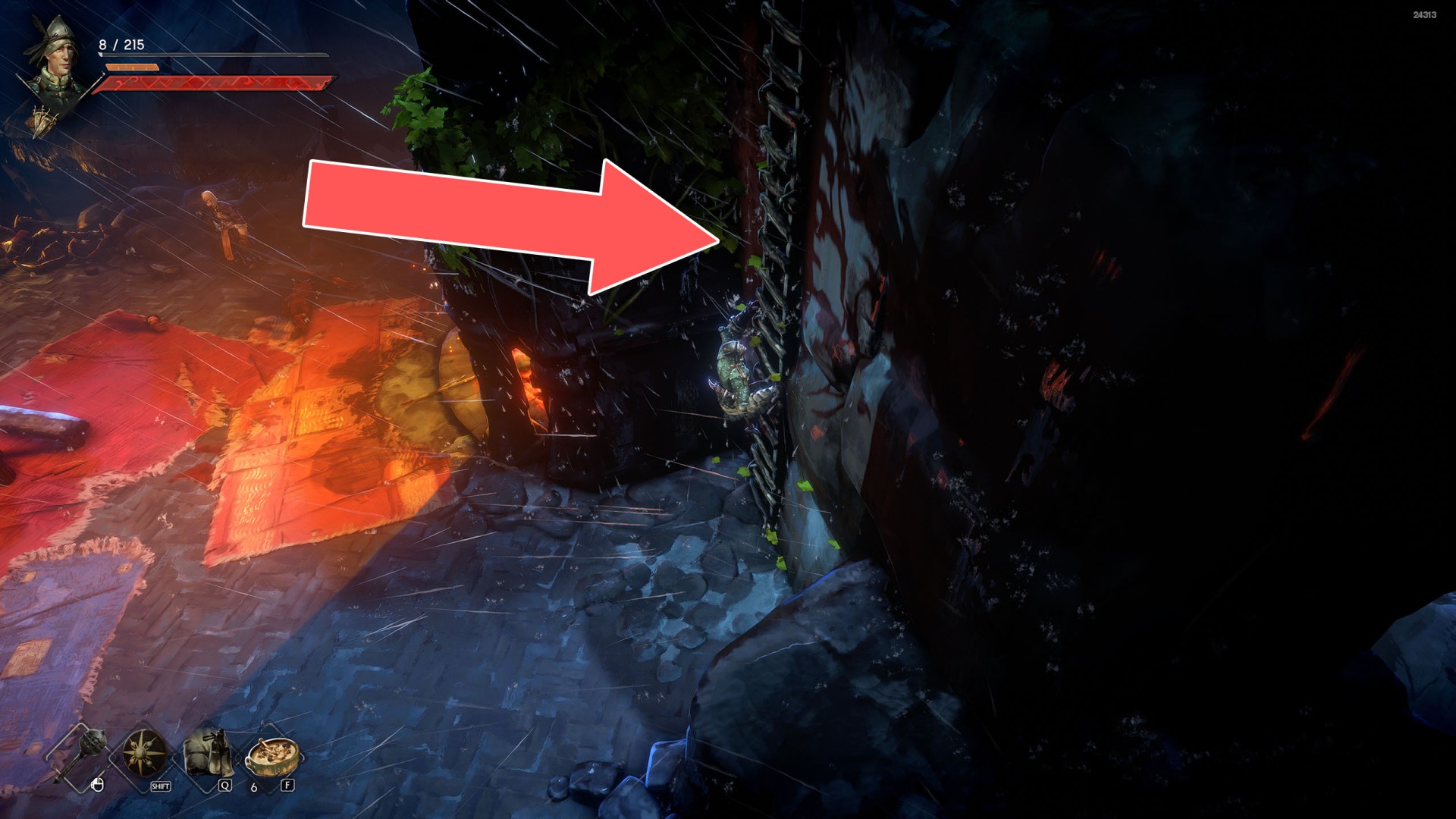 Show the mapYou can use the nearby lever to lower this stone block. The block will descend into the fire below, so before it reaches the bottom, jump off it onto the nearby wooden bridge.