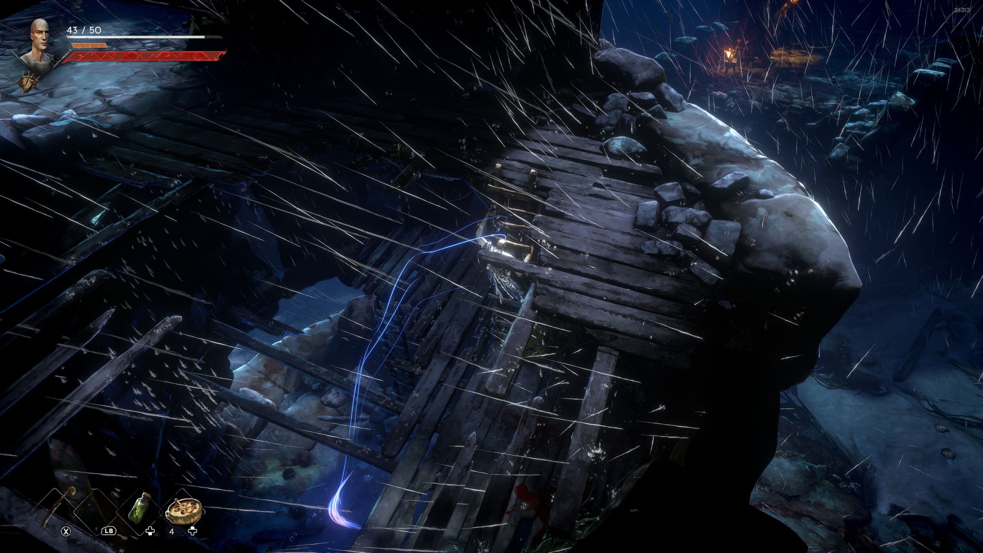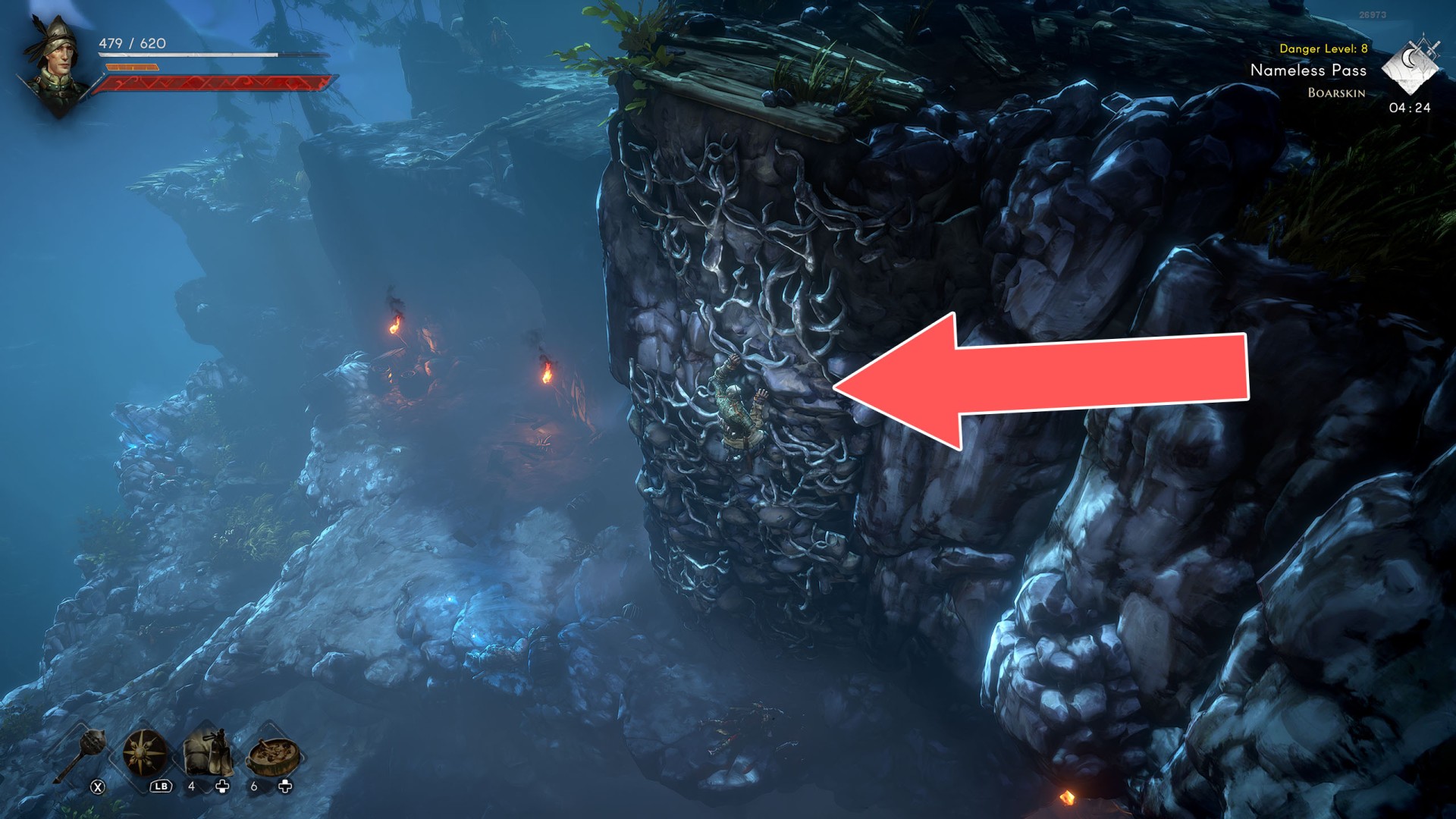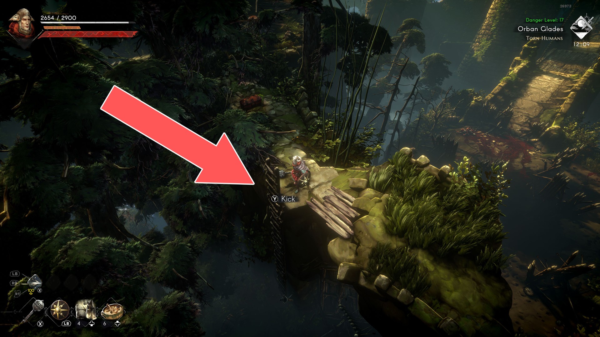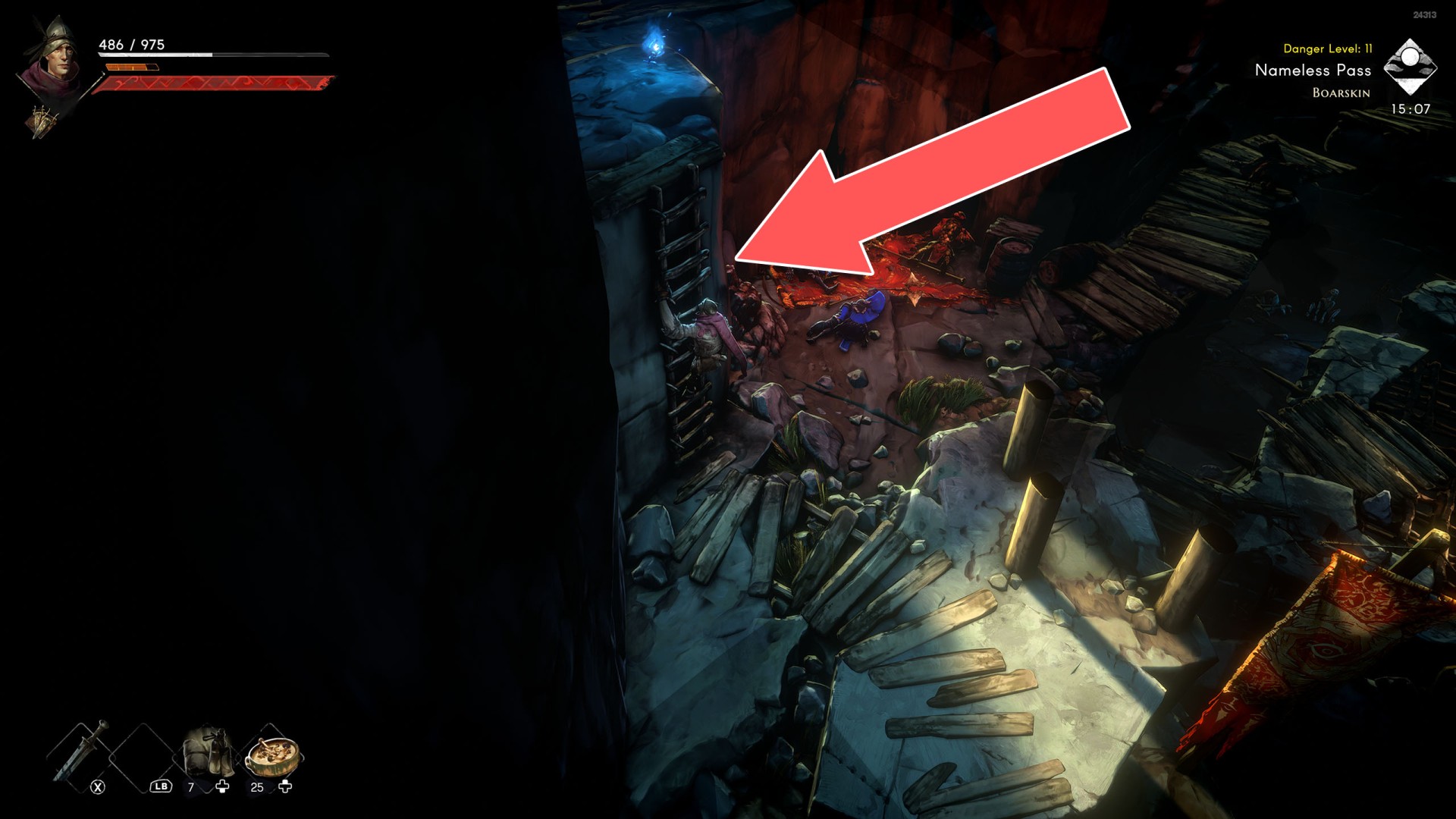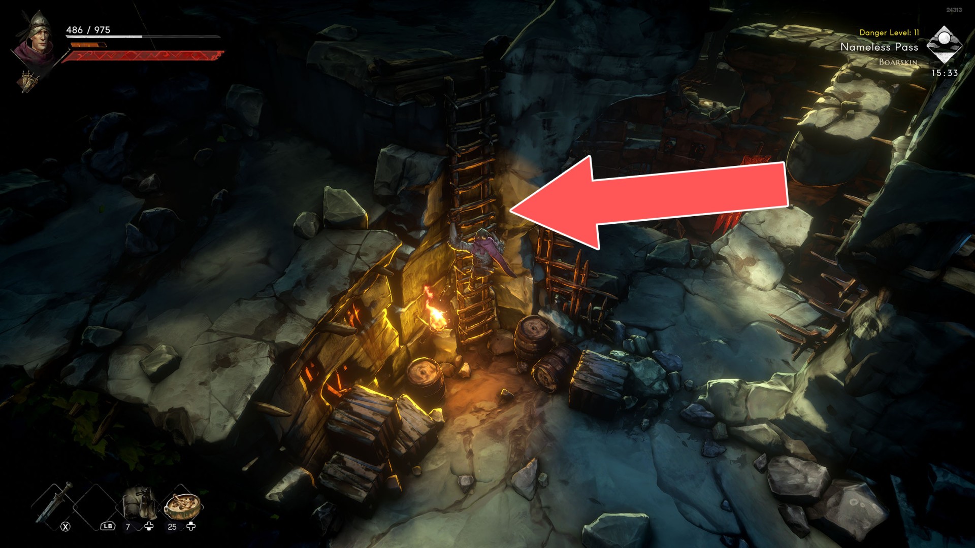 Show the mapYou can use the nearby lever to lower this stone block. The block will descend into the fire below, so before it reaches the bottom, jump off it onto the nearby wooden bridge.