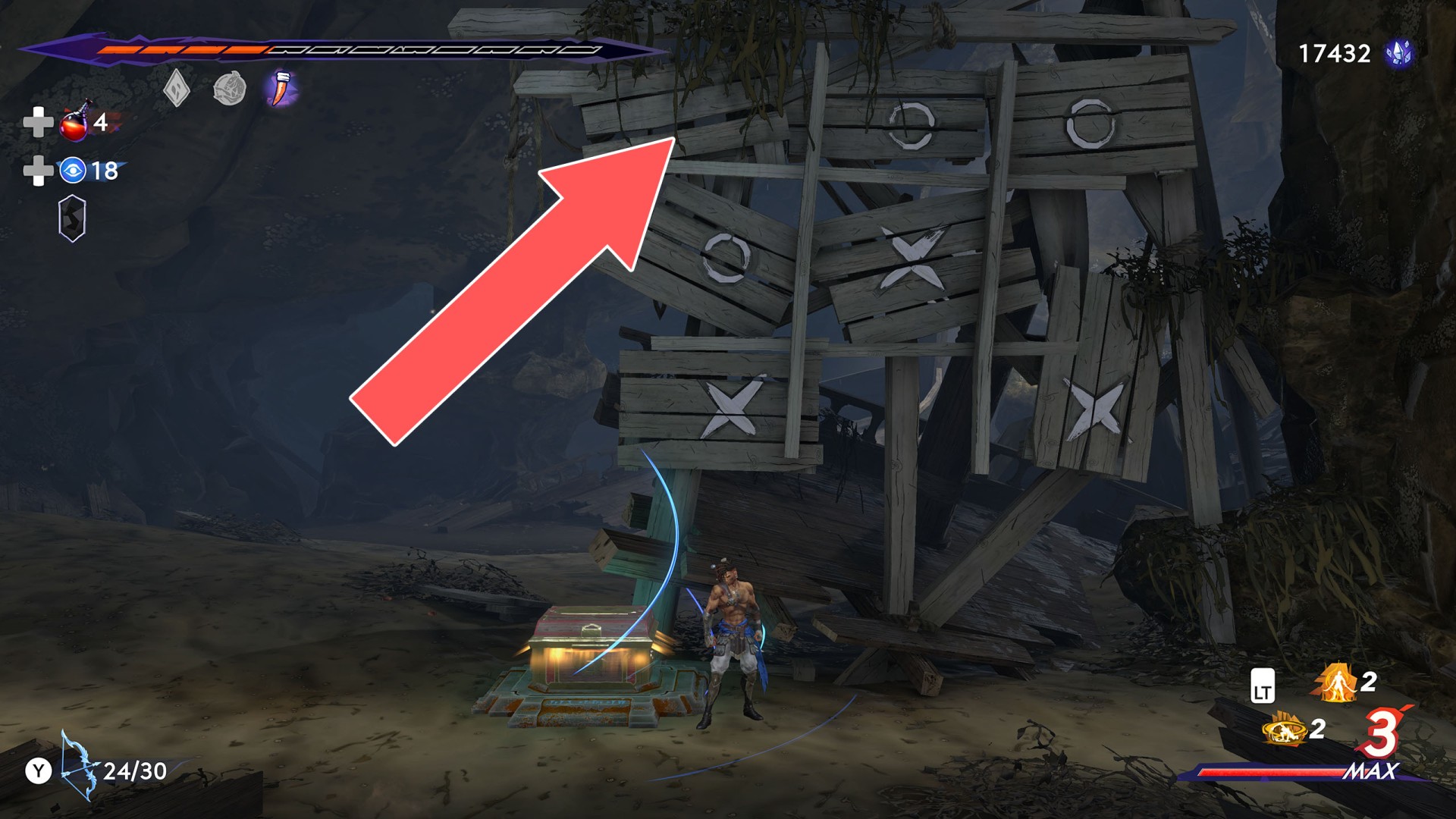 Show the mapMysterious Chest Puzzle (6). Shoot the chakram at the board in the upper left corner. This will complete the line of circles. It counts as a Sunken Harbor Valuable item.