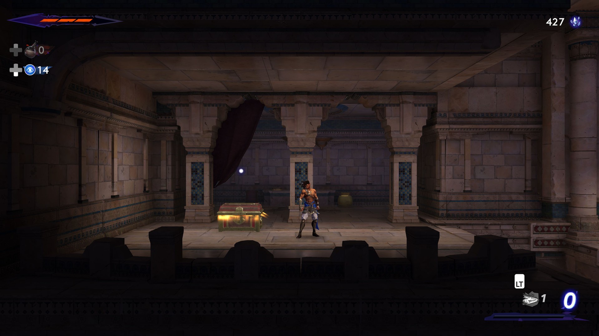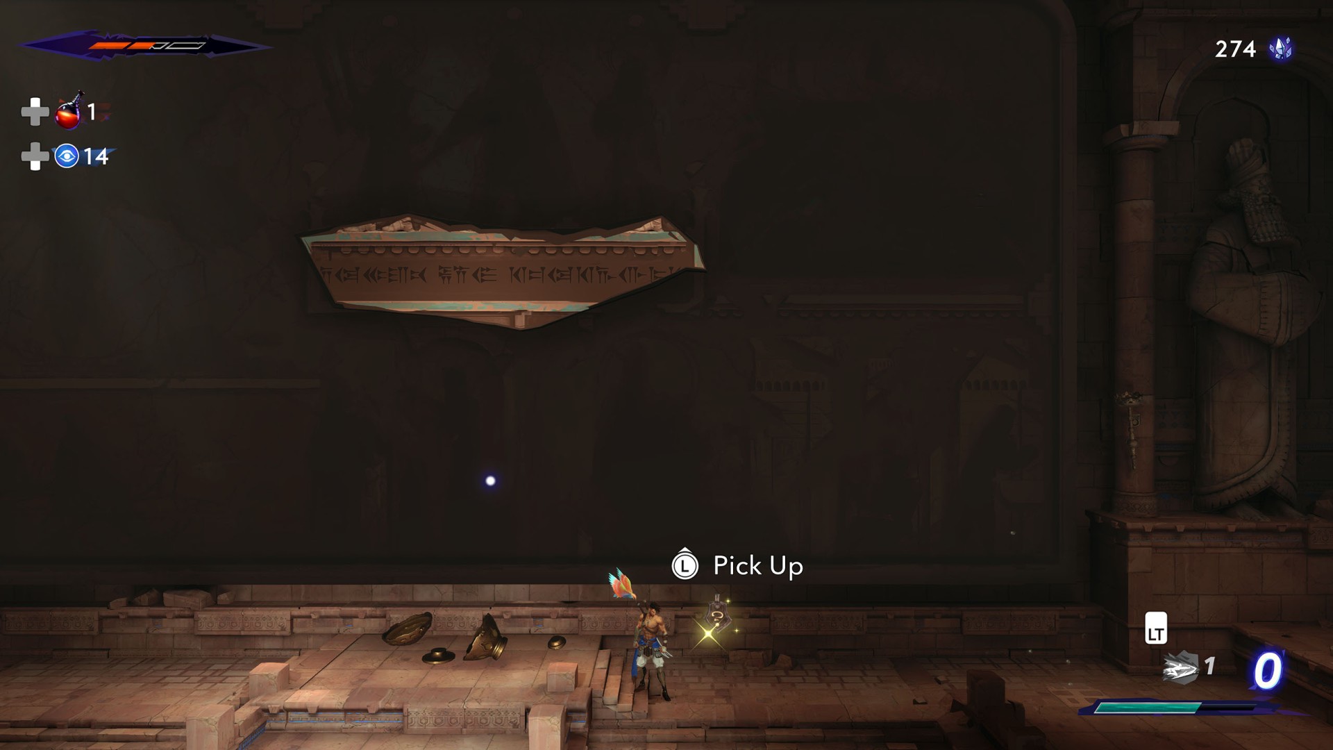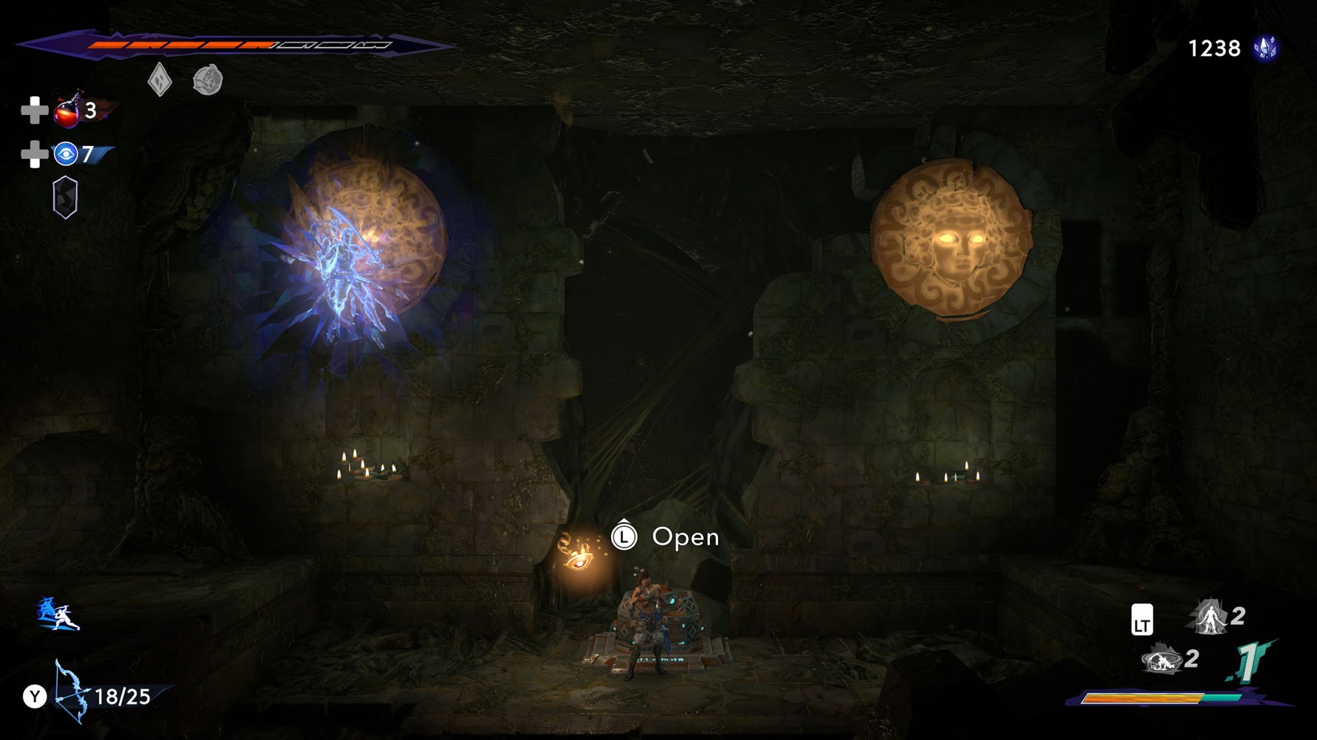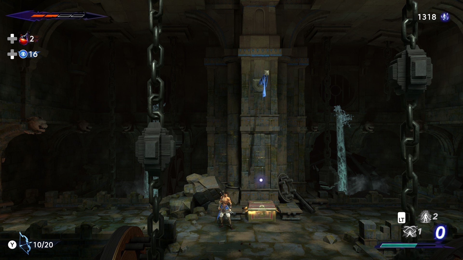 Show the mapMysterious Chest Puzzle (8). Place the "Shadow of the Simurgh" marker in front of one of the face plates so that it lights up, and jump in front of the other face plate so that they both light up at the same time. It counts as The Depths Valuable Item.