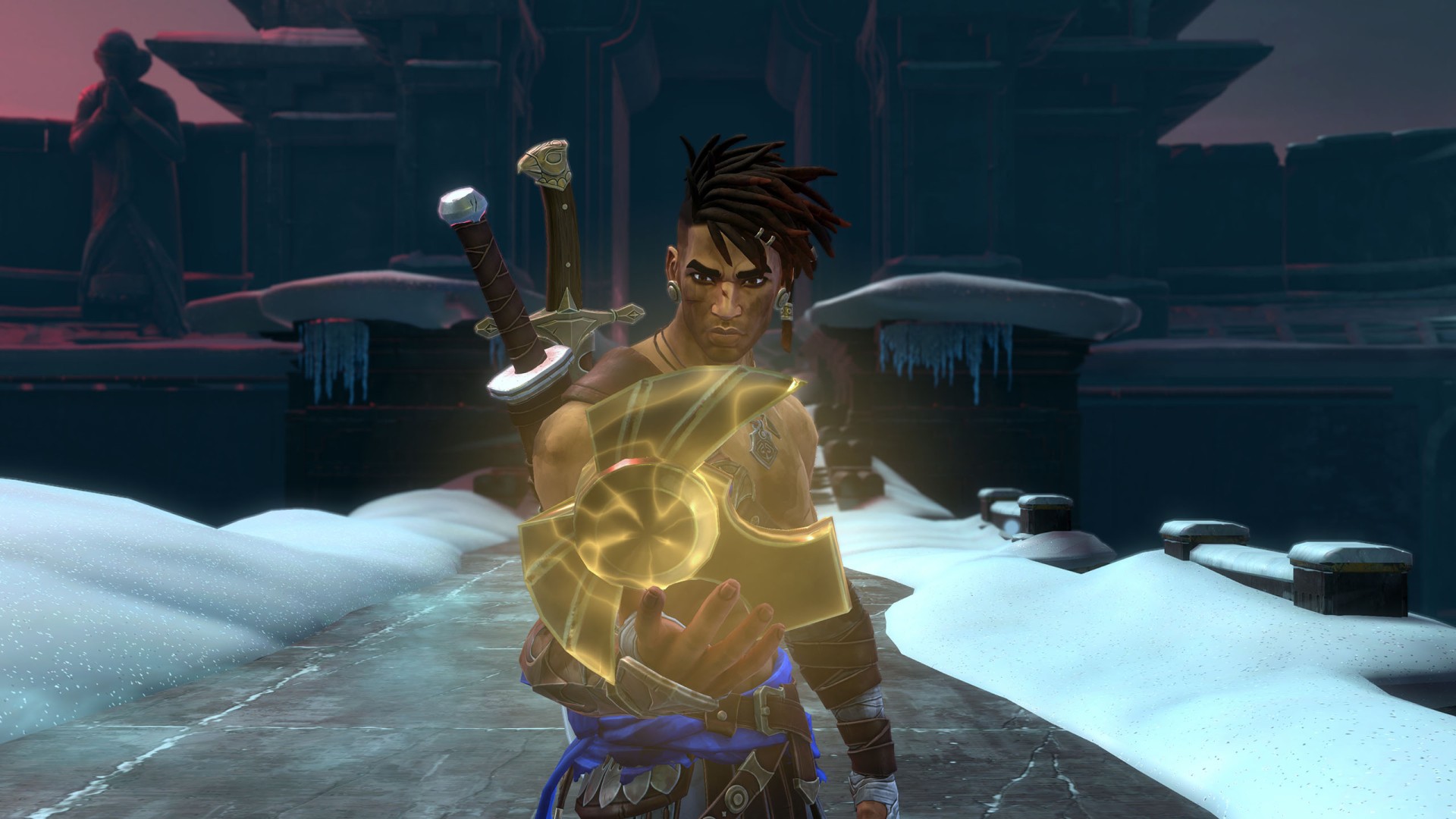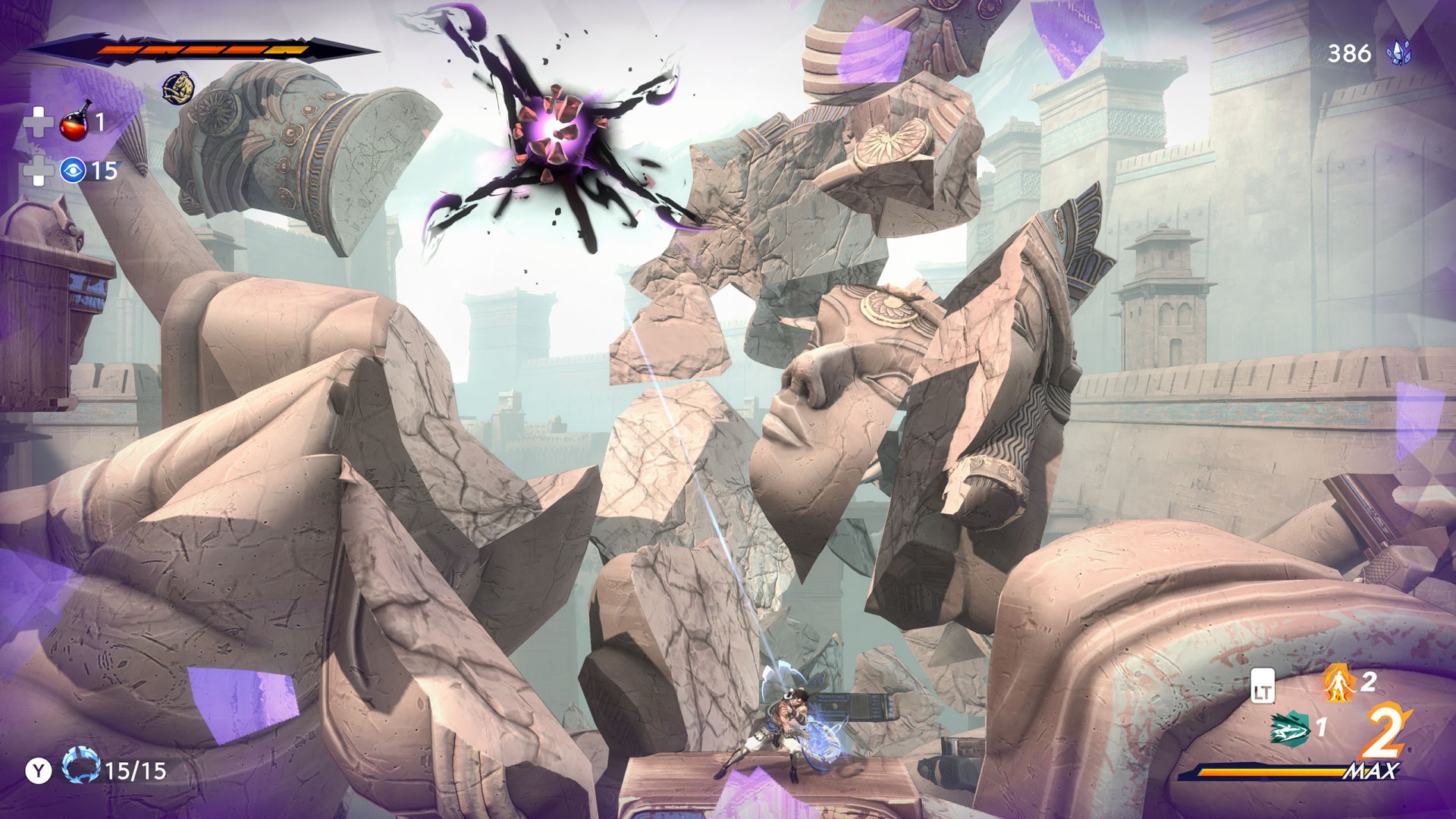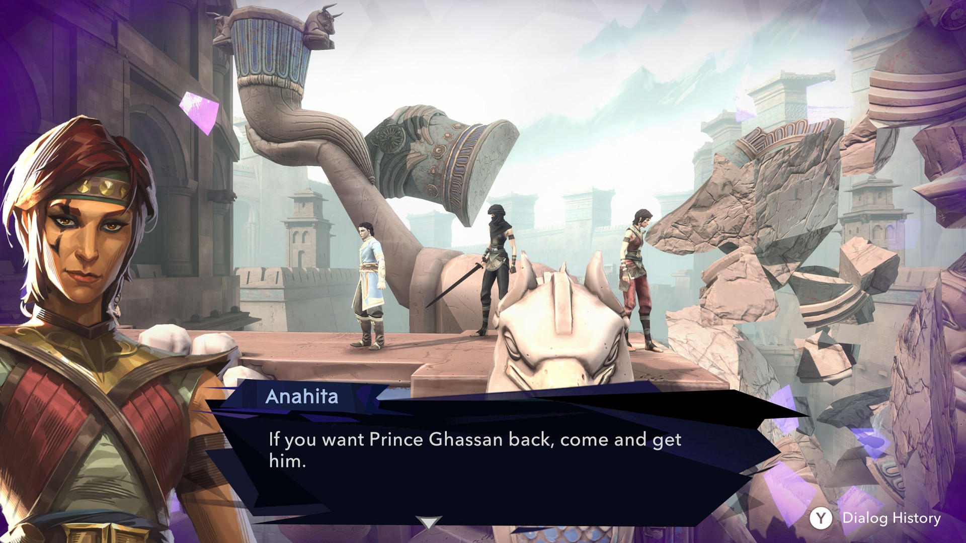 Show the mapSargon spotted Anahita and Ghassan at the top of the colossal statue that once towered over the ancient city. The statue was destroyed when Time shattered. The frozen fragments slow down Sargon's progress.