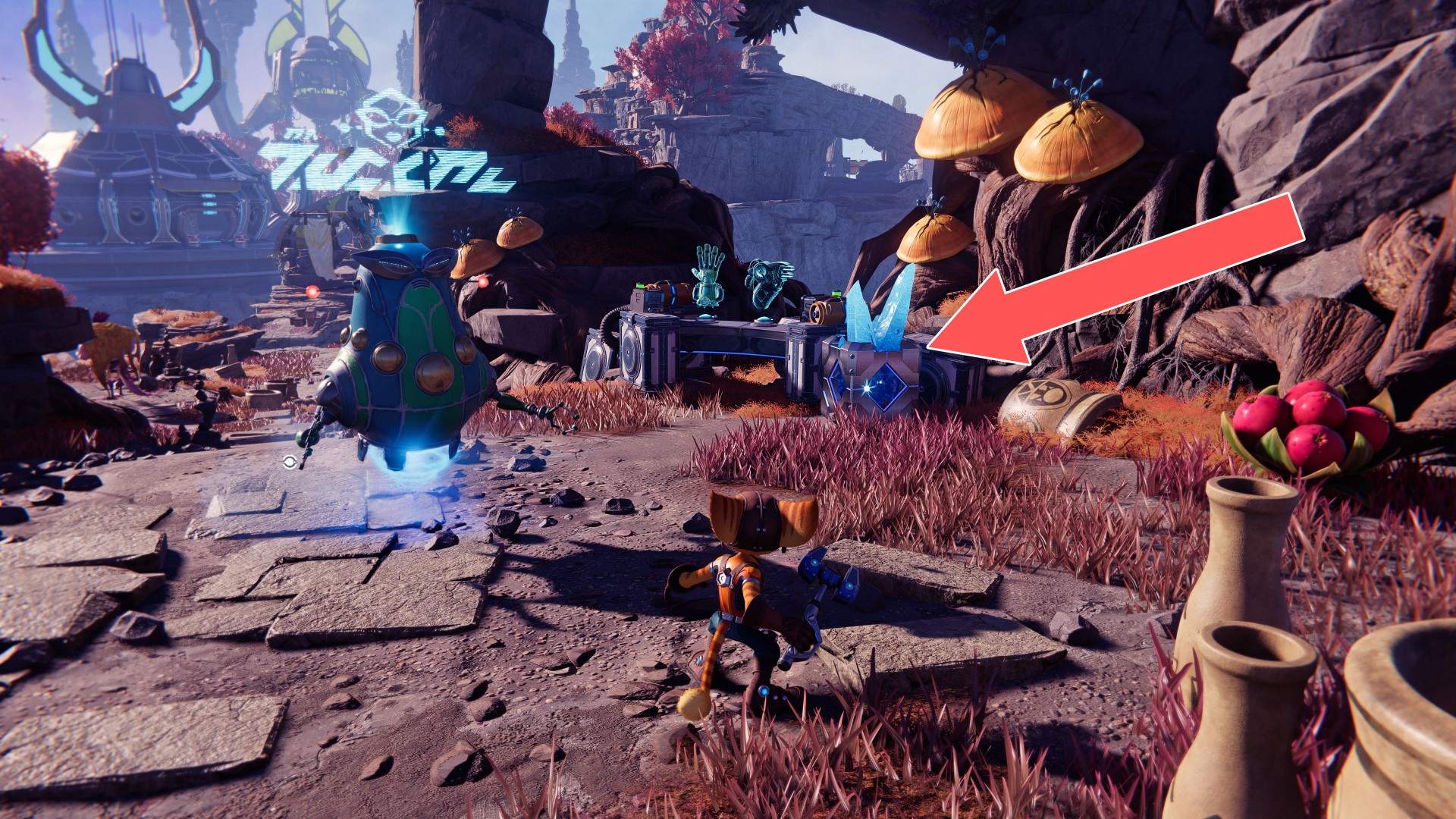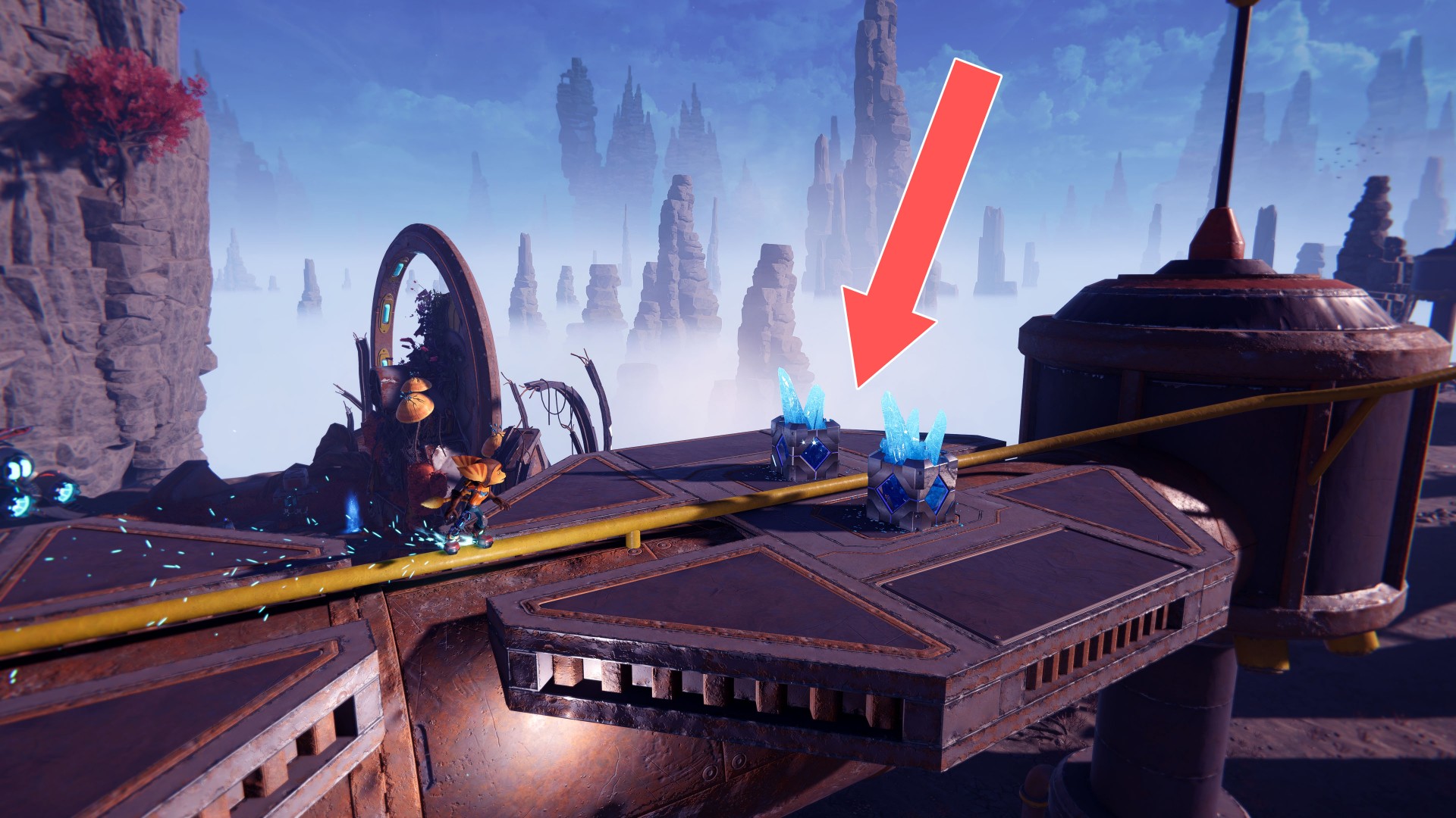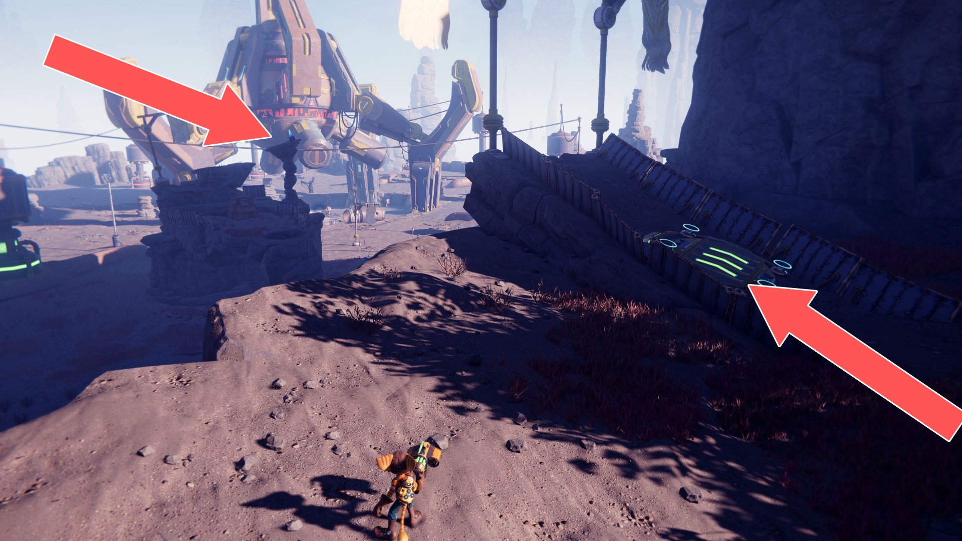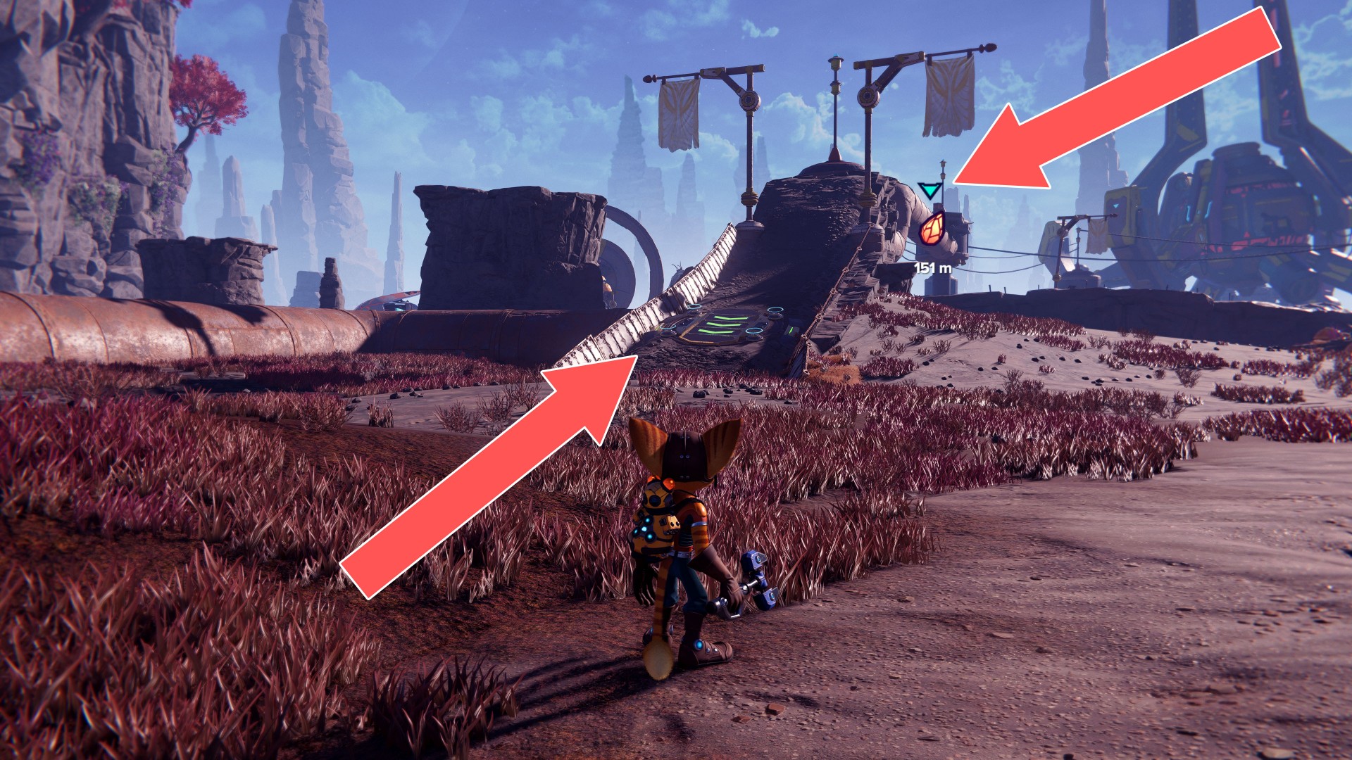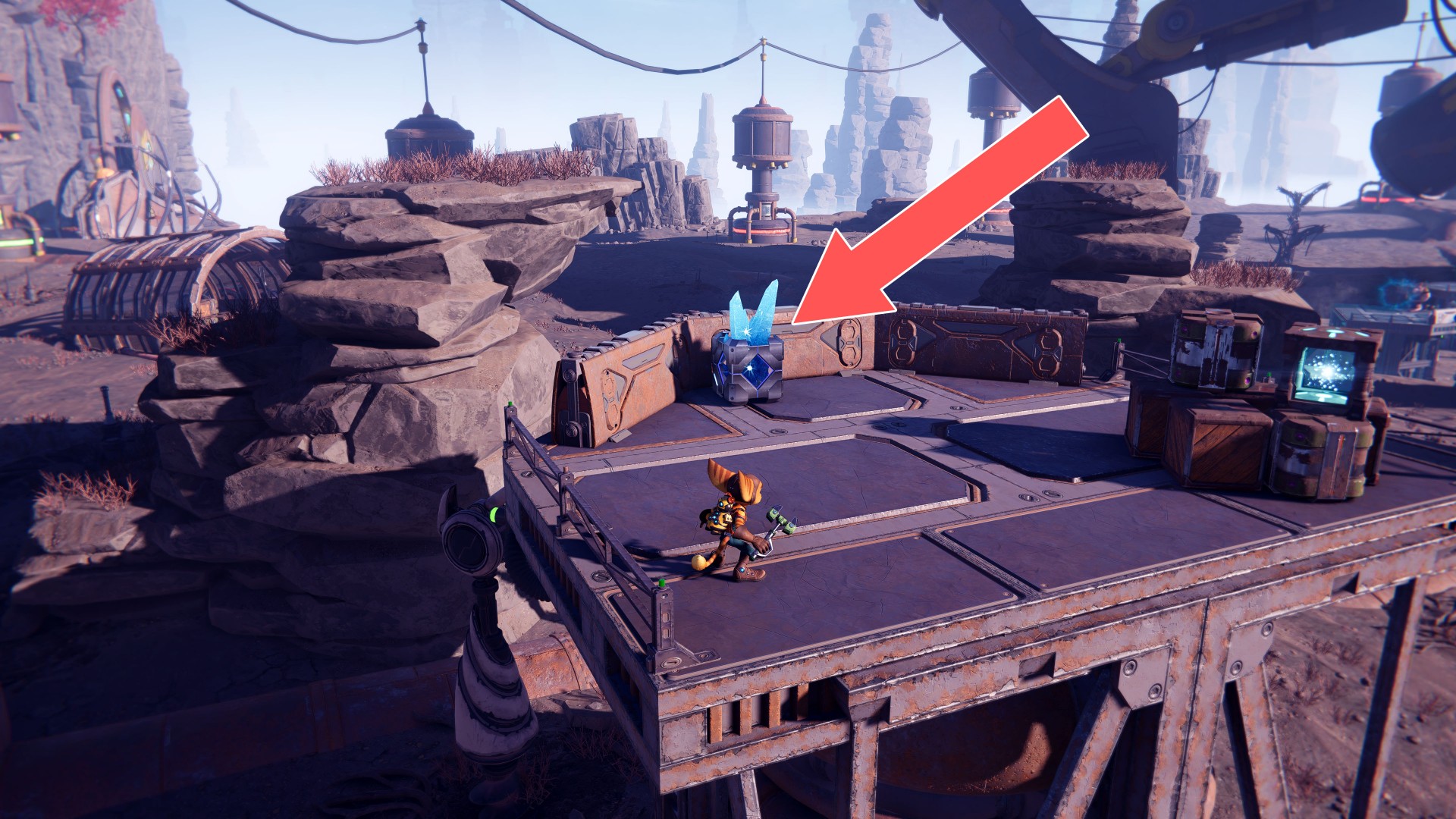 Show the mapUse your hoverboots, accelerate and then use the ramp to jump up. While riding the rail, swing the wrench when you are near the crates.
