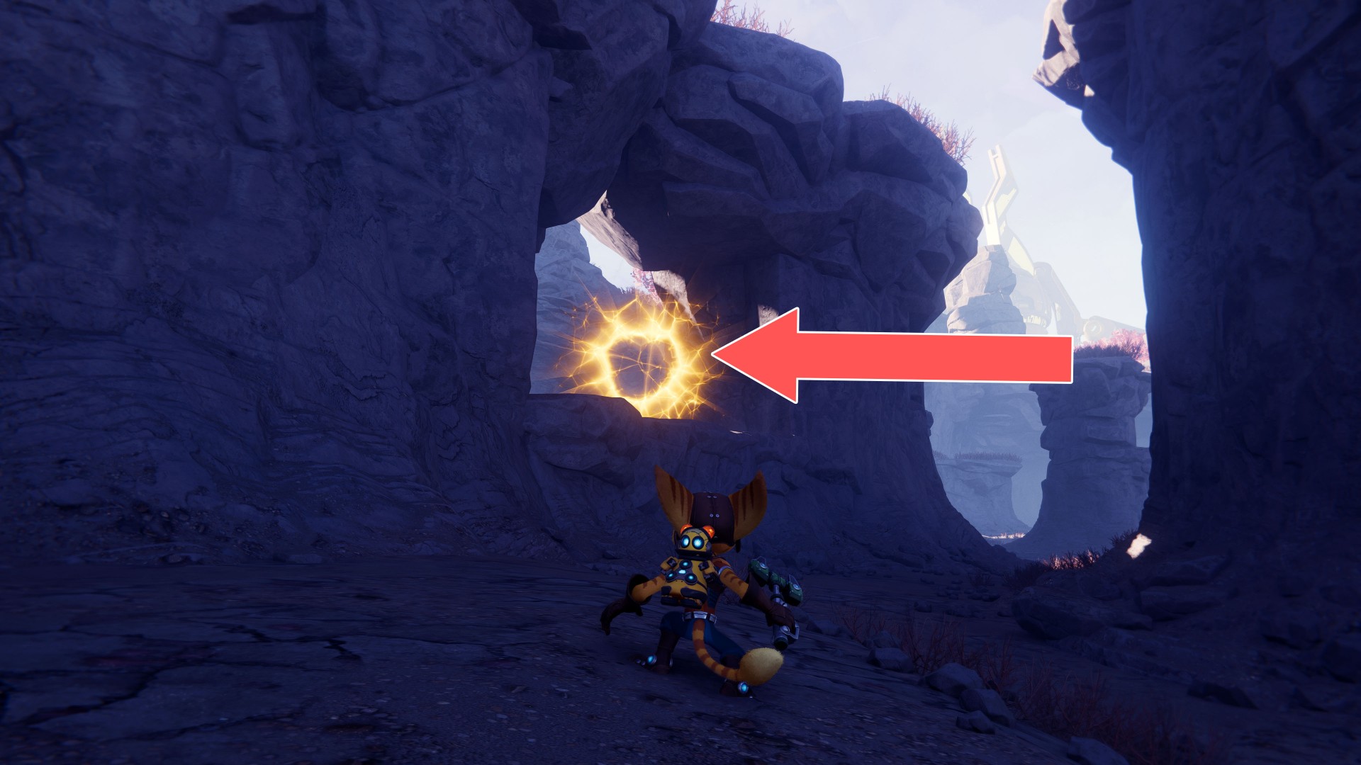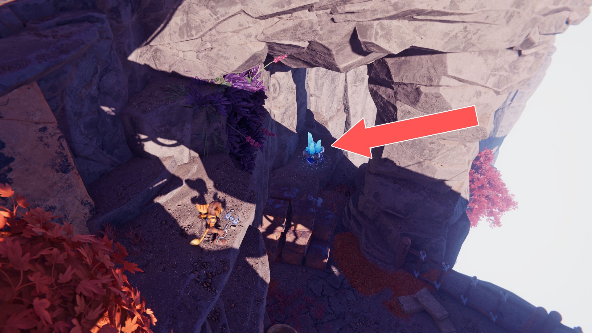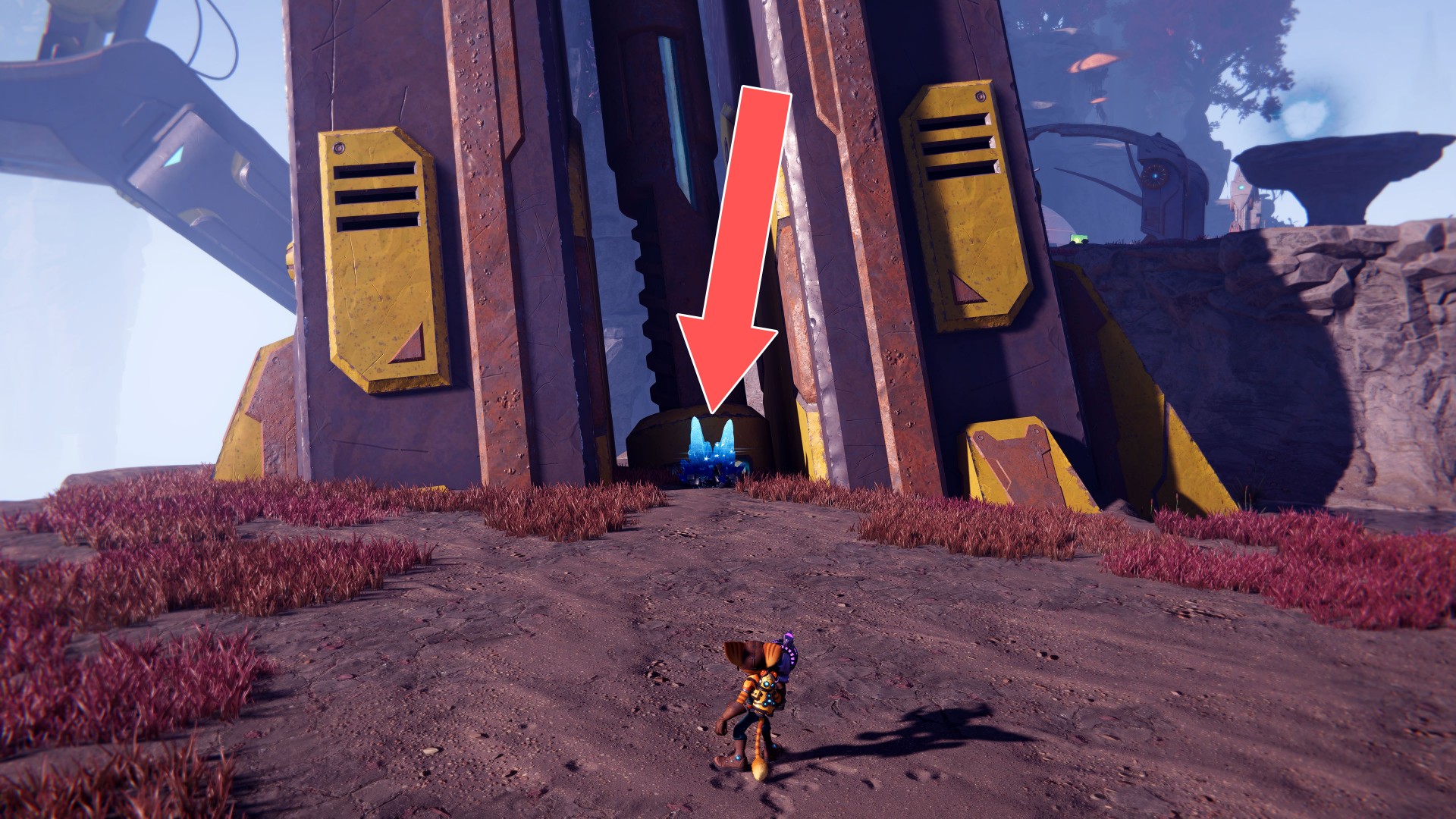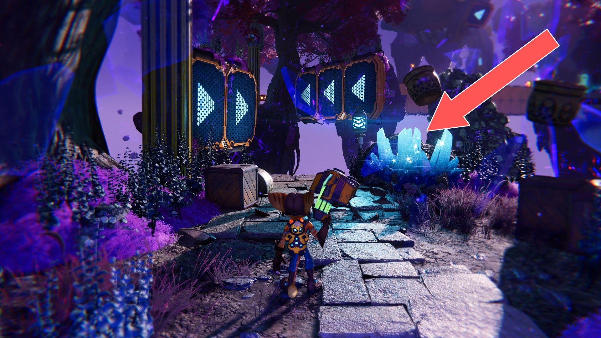 Show the mapUse your hoverboots, accelerate and then use the ramp to jump up. While riding the rail, swing the wrench when you are near the crates.