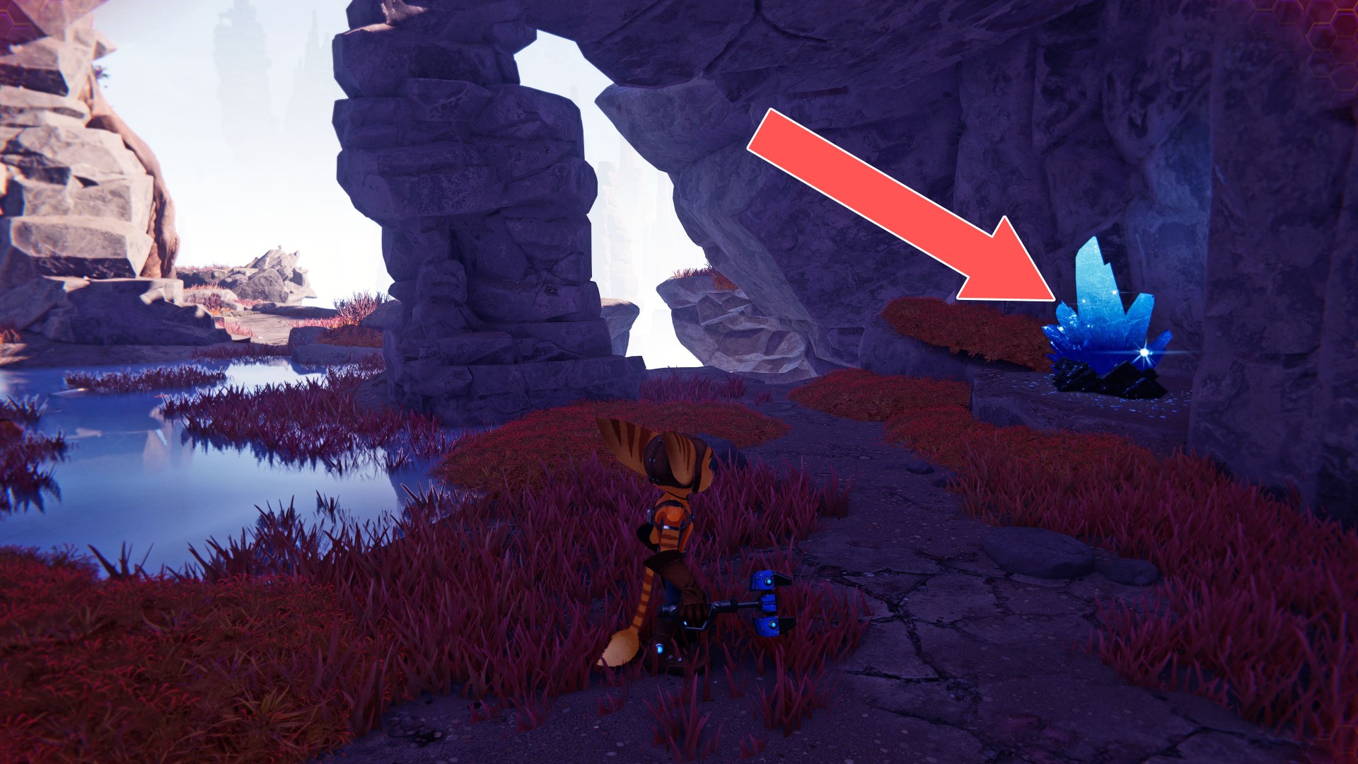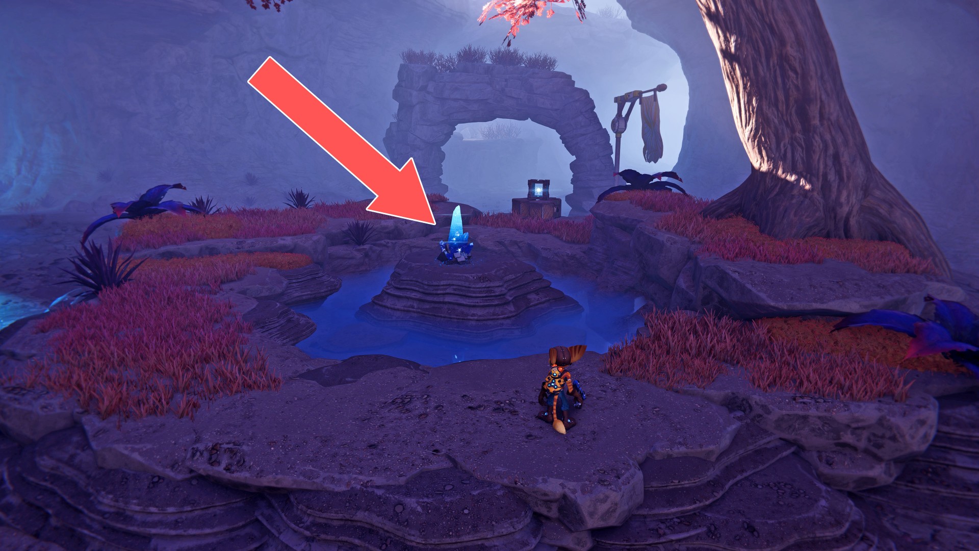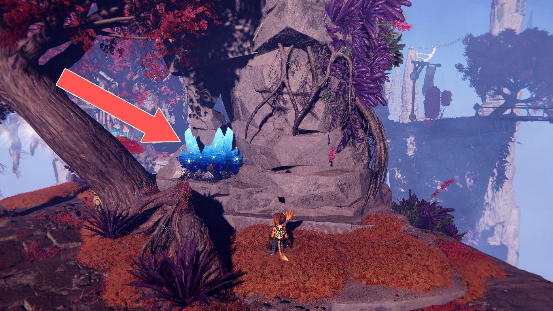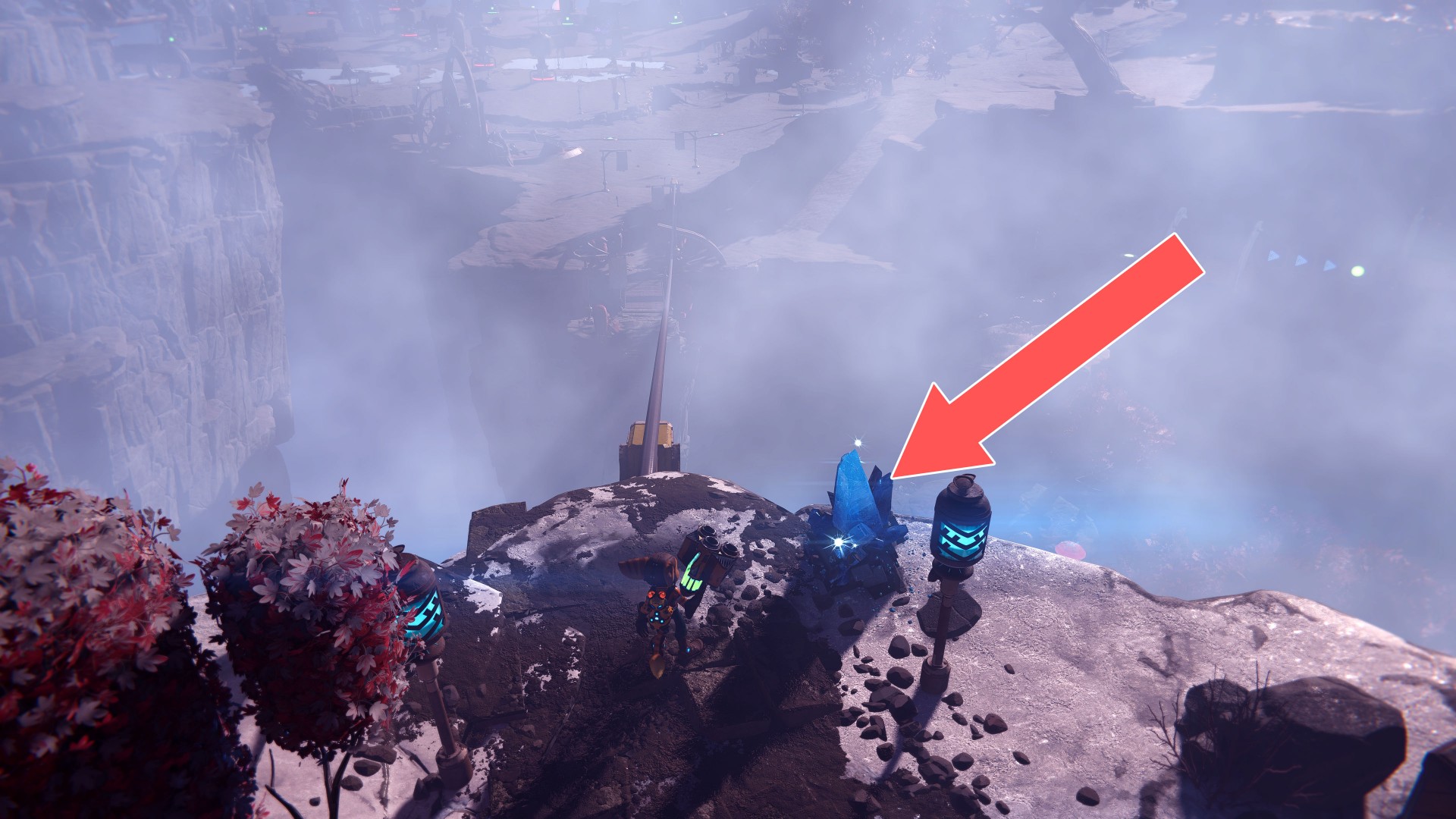 Show the mapTo jump on top of the stone pillar where the crystal is, use the nearby mushroom.