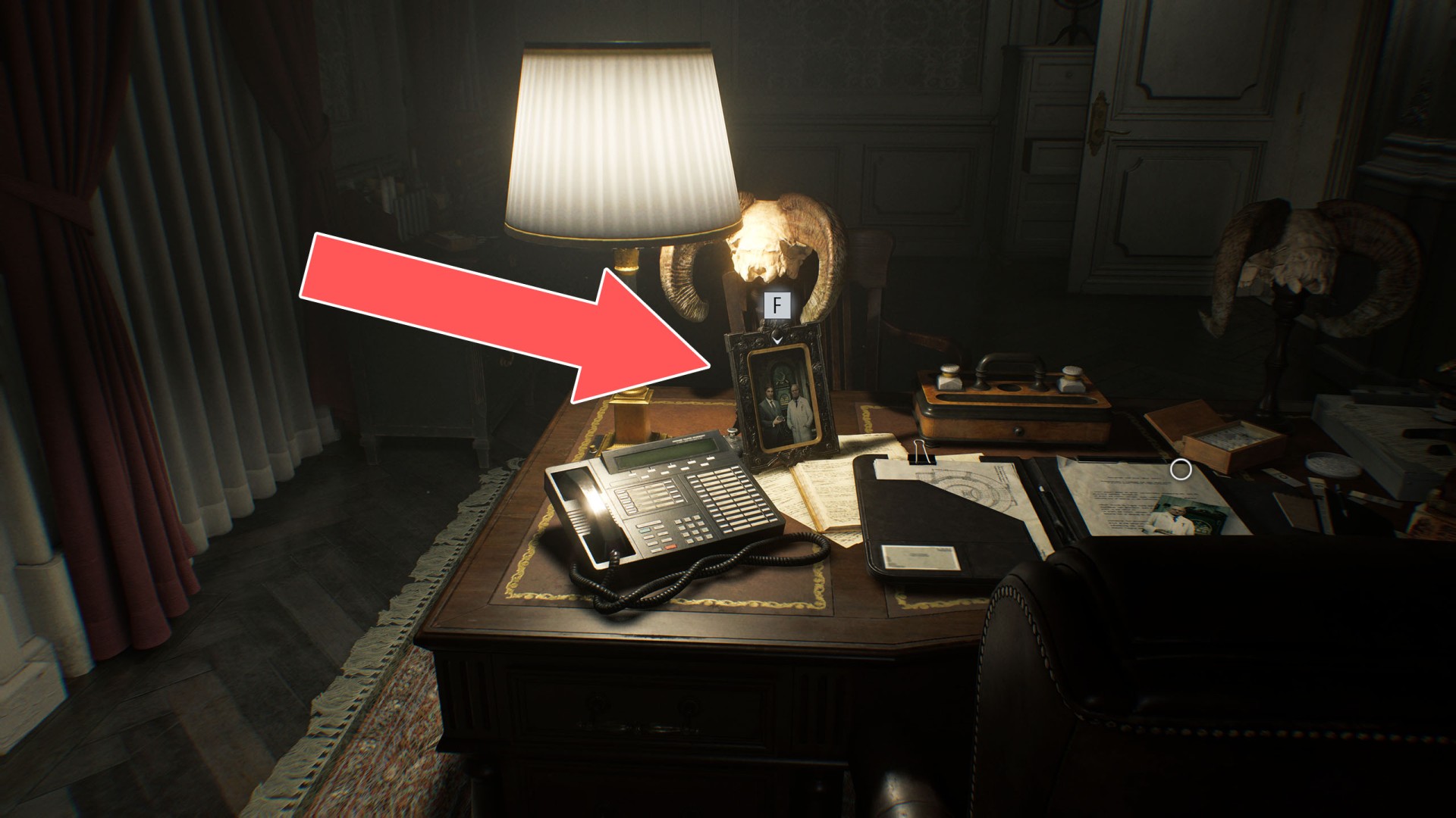 Show the mapRhodes Hill File 14/41. A framed photograph standing on the desk.