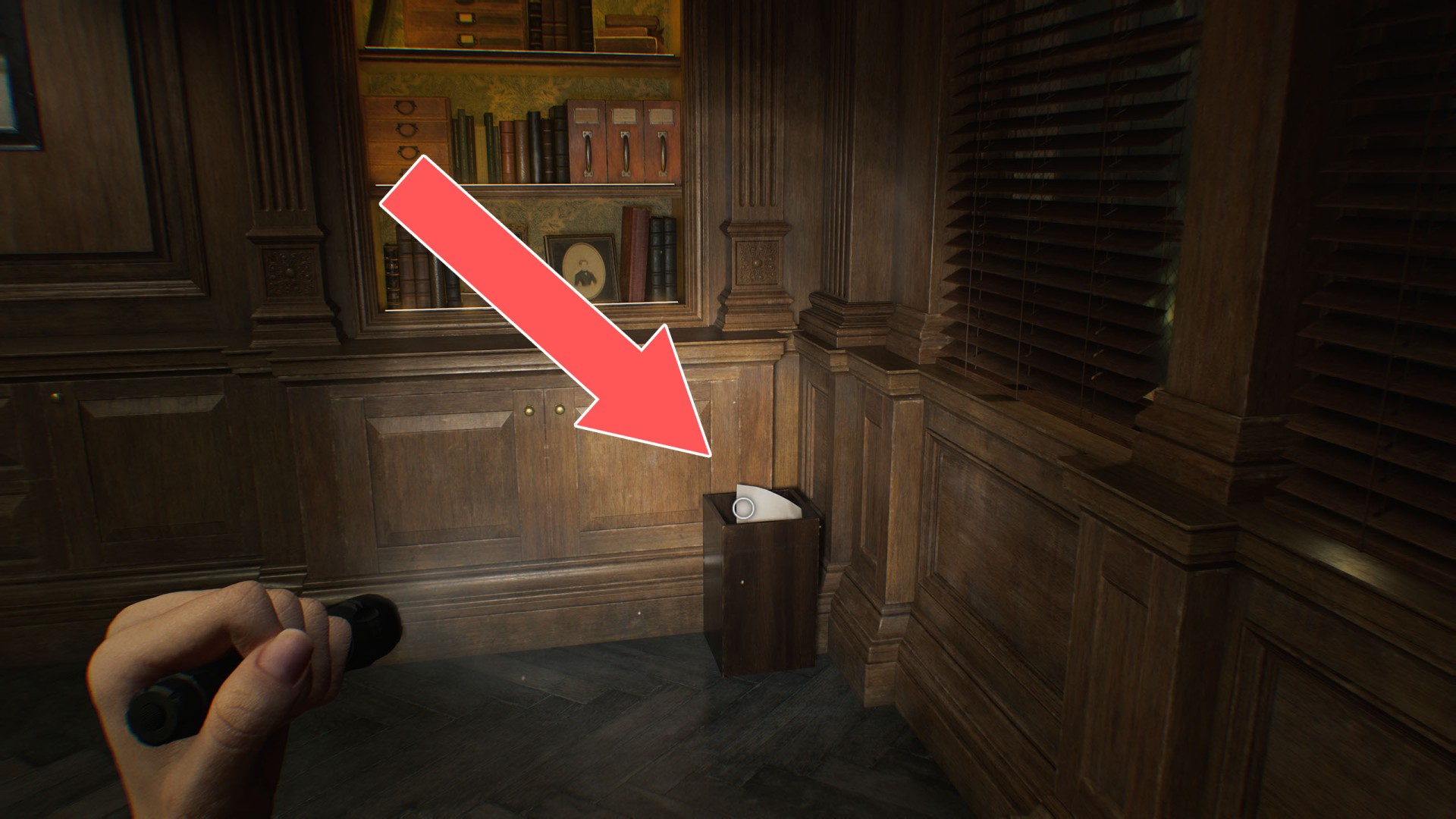 Show the mapRhodes Hill File 8/41. A piece of paper tossed into the trash can in the corner.