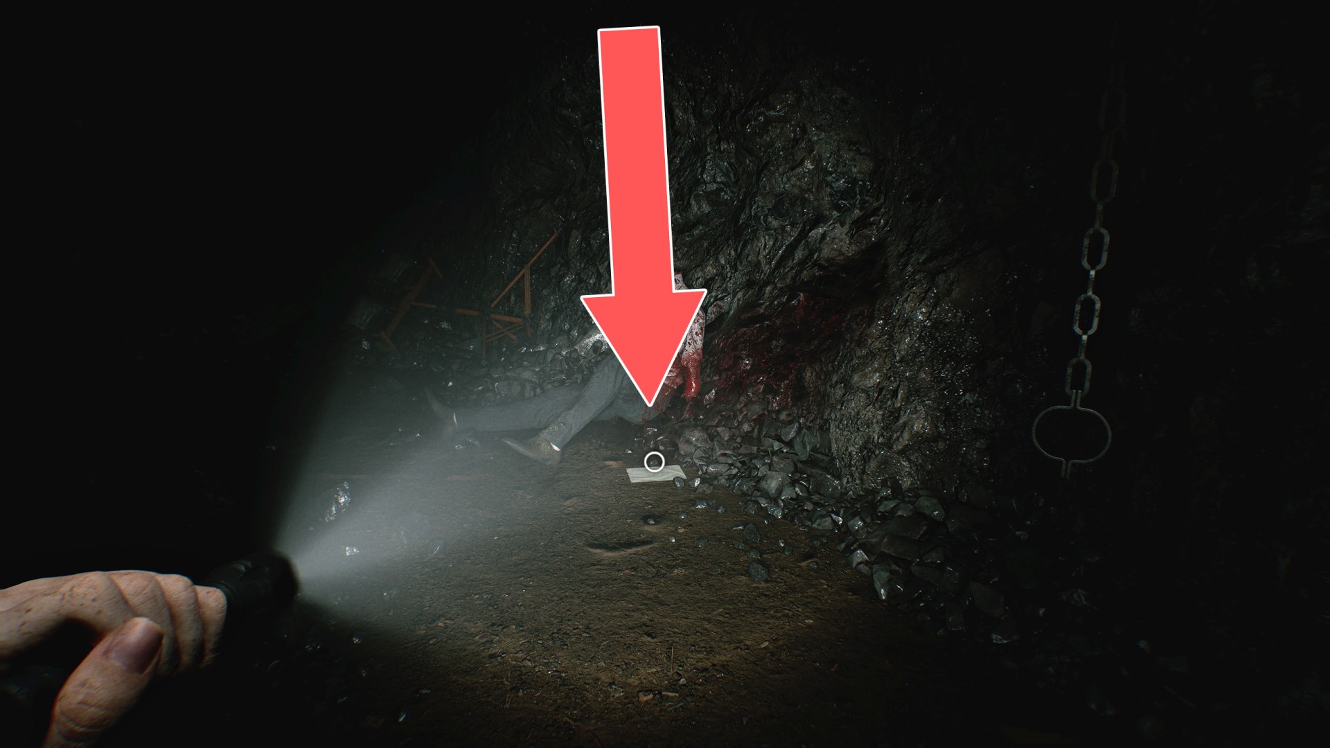 Show the mapRhodes Hill File 31/41. A note lying on the ground next to a corpse in a dark tunnel.