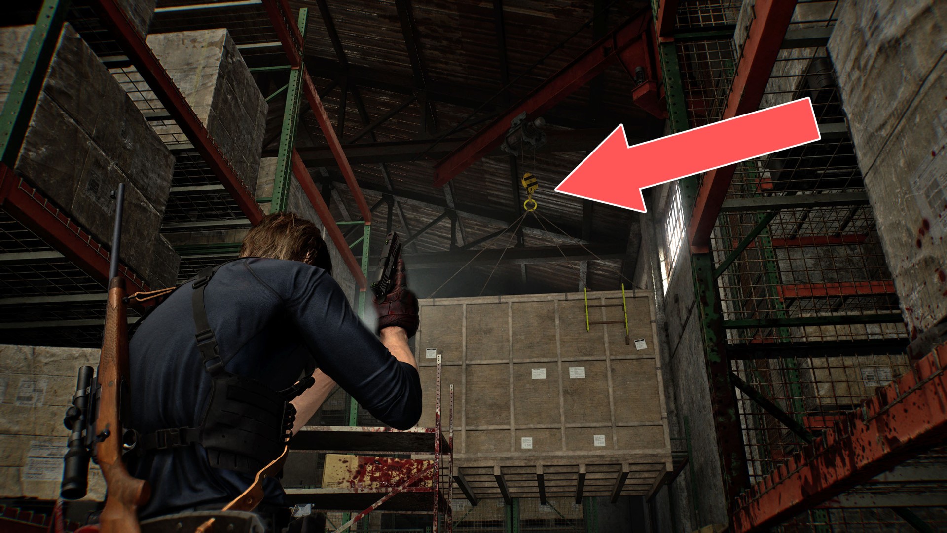 Show the mapShoot the bracket holding the crate. This will drop the container, allowing you to use it to reach a higher level.
