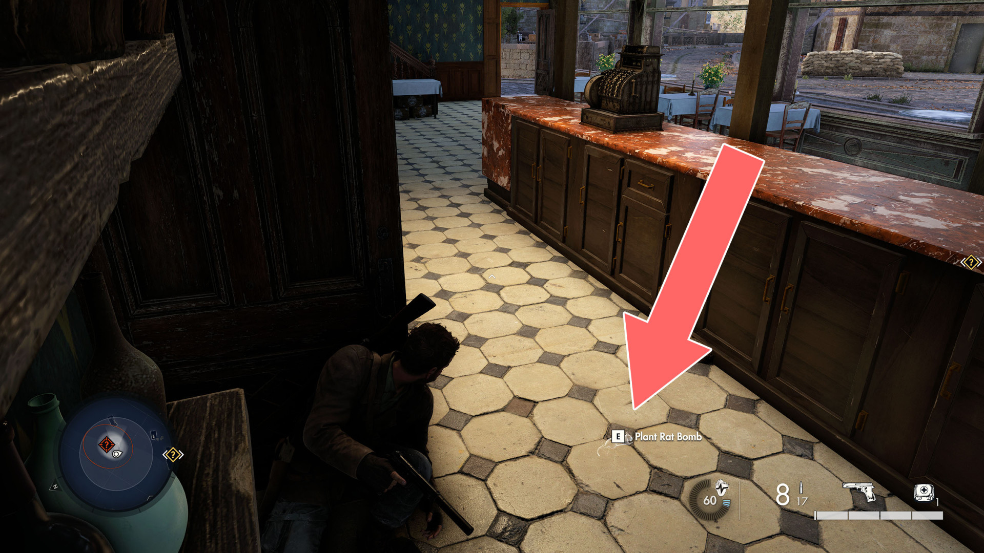 Place the bomb behind the counter on the lower level of the restaurant, move back to a safe distance and wait until Philo notices the rat and shoots it, which will trigger the explosion.