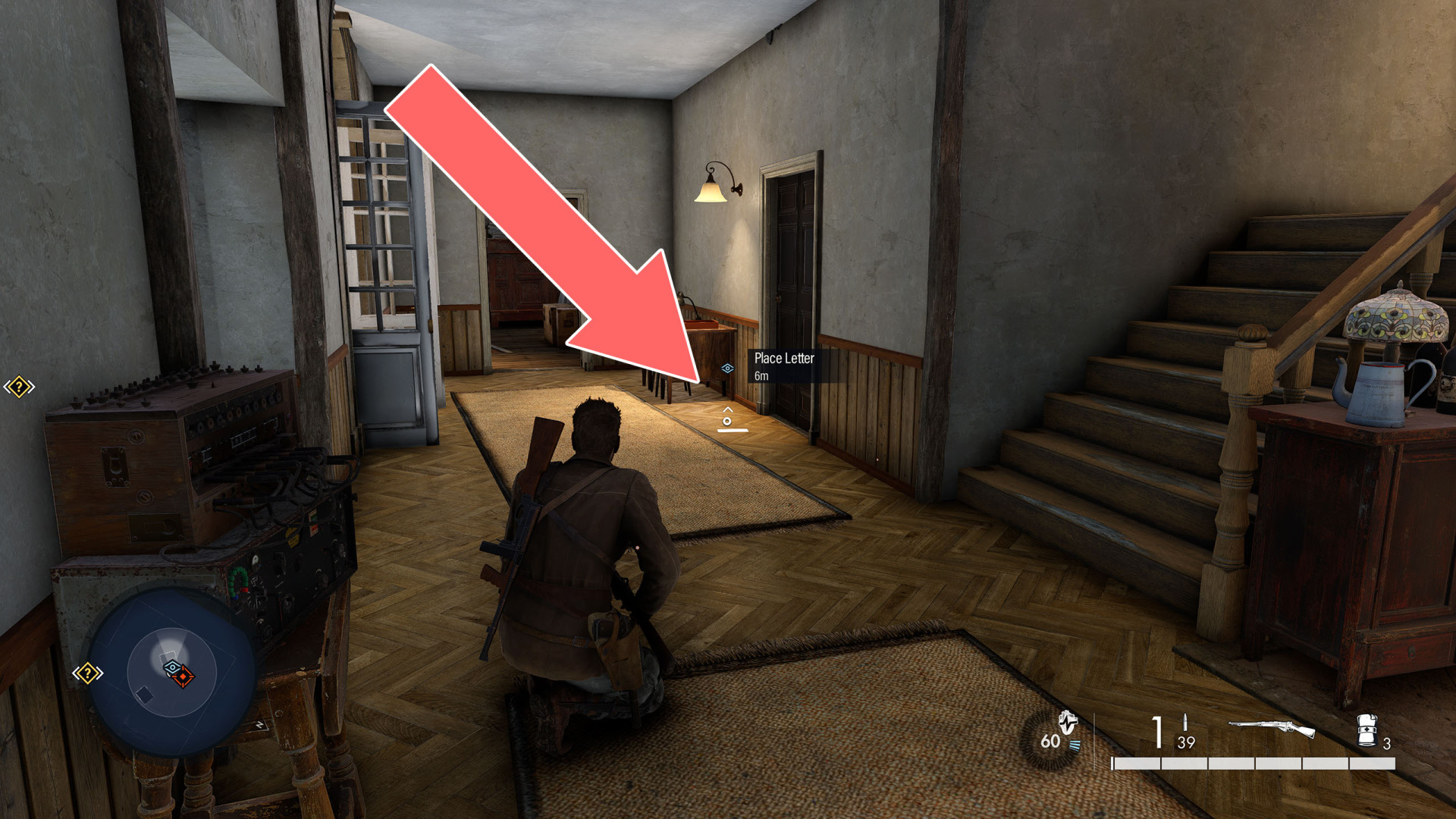 Get the Walda, My Dearest letter and place it by the door on the ground floor of the house where Arno Lembke is. The cheated soldier will leave the room, go up the stairs on the left and kill Lembke.